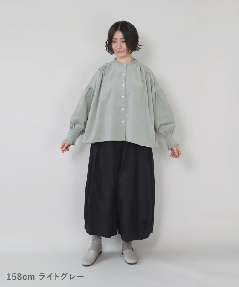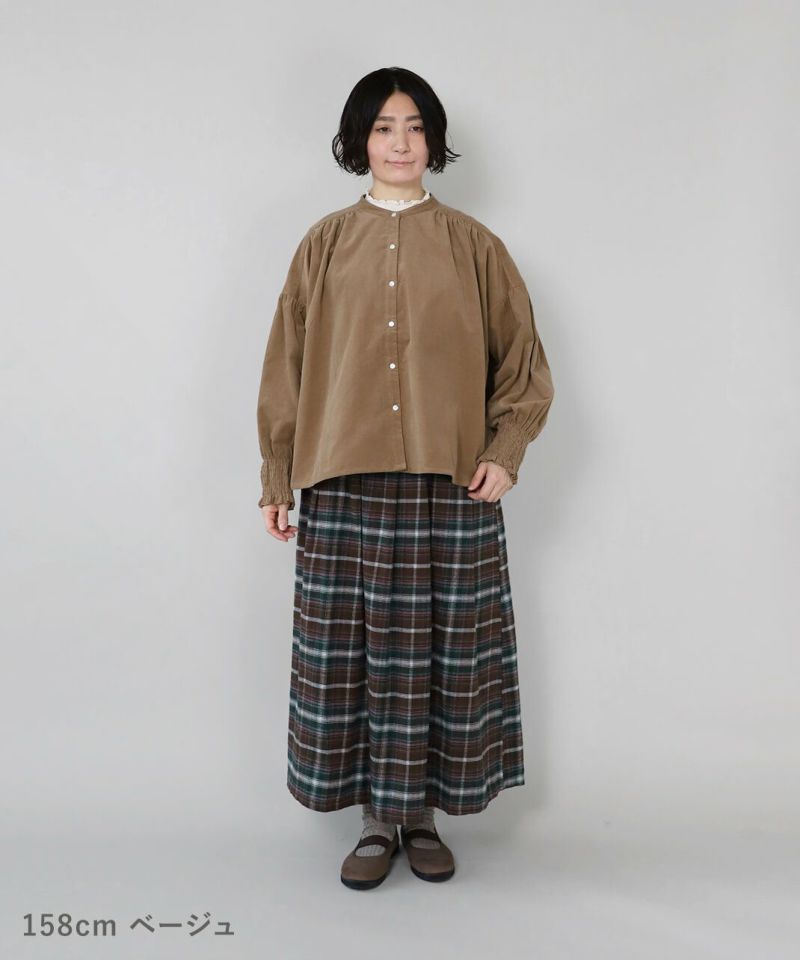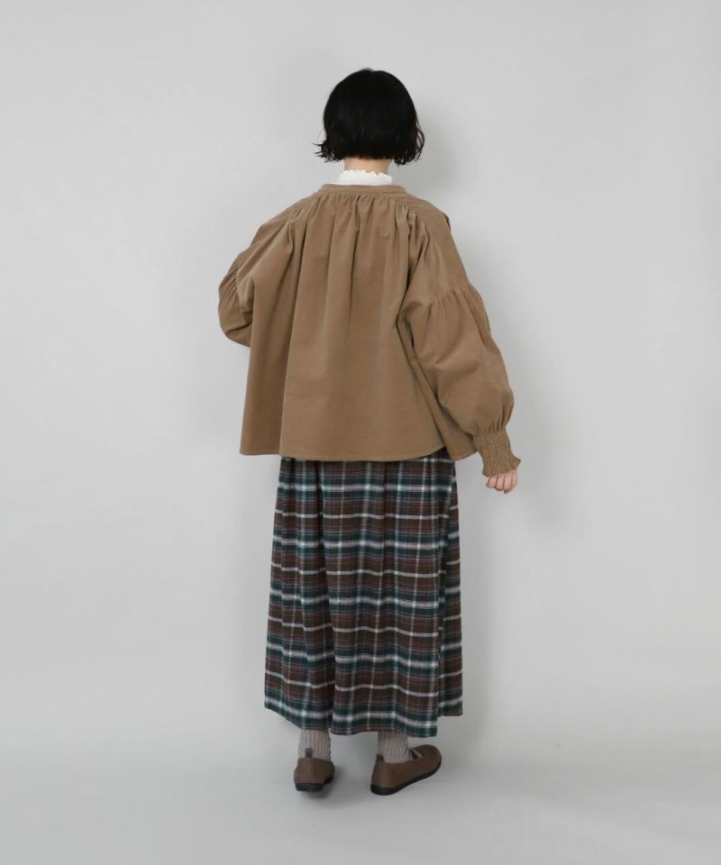 やわらかな細コーデュロイ生地を使用したギャザーブラウスです。 首周りはバンドカラーですっきりと、肩まわりにたっぷりとギャザーが施され、ふんわりとしたシルエットに。太めのゴム入りギャザーの袖口が可愛さをプラスしてくれています。 今から春先まで着られるのも嬉しいポイント。 ブラウスとしてはもちろんボタンを開けて羽織りとしてもおすすめです。