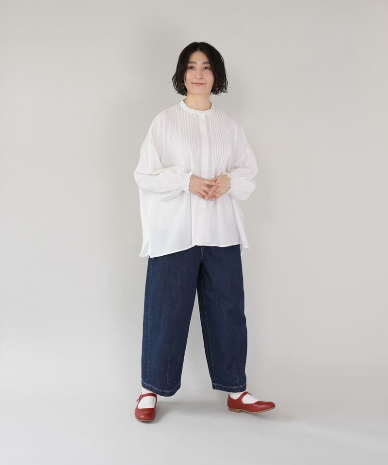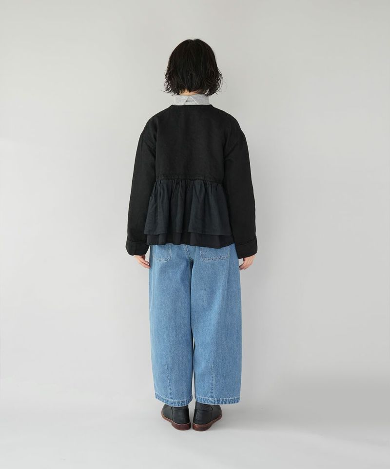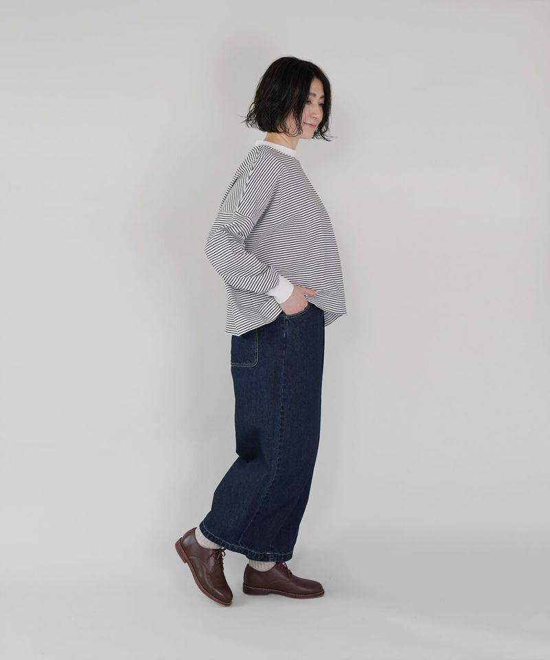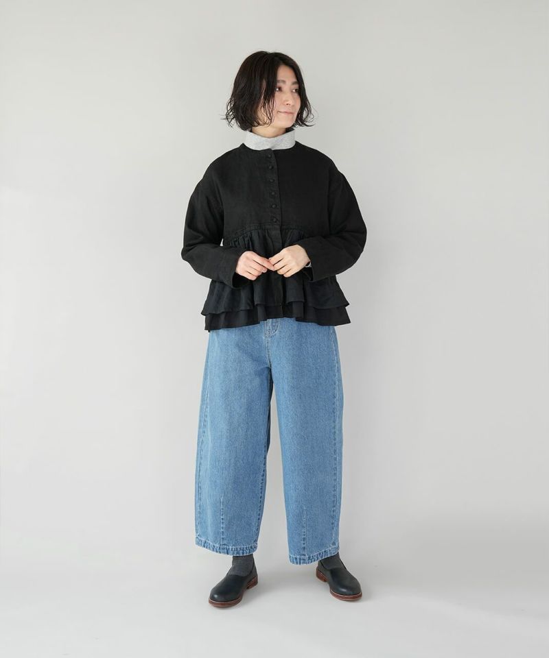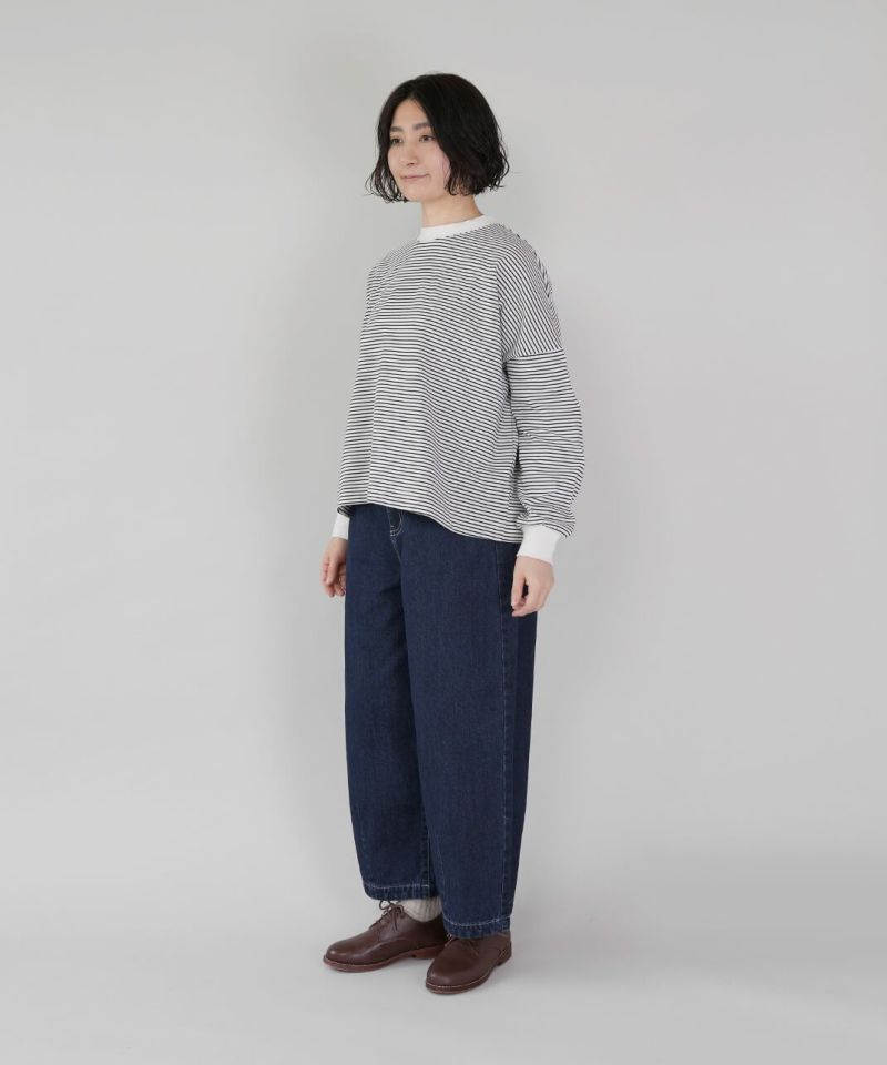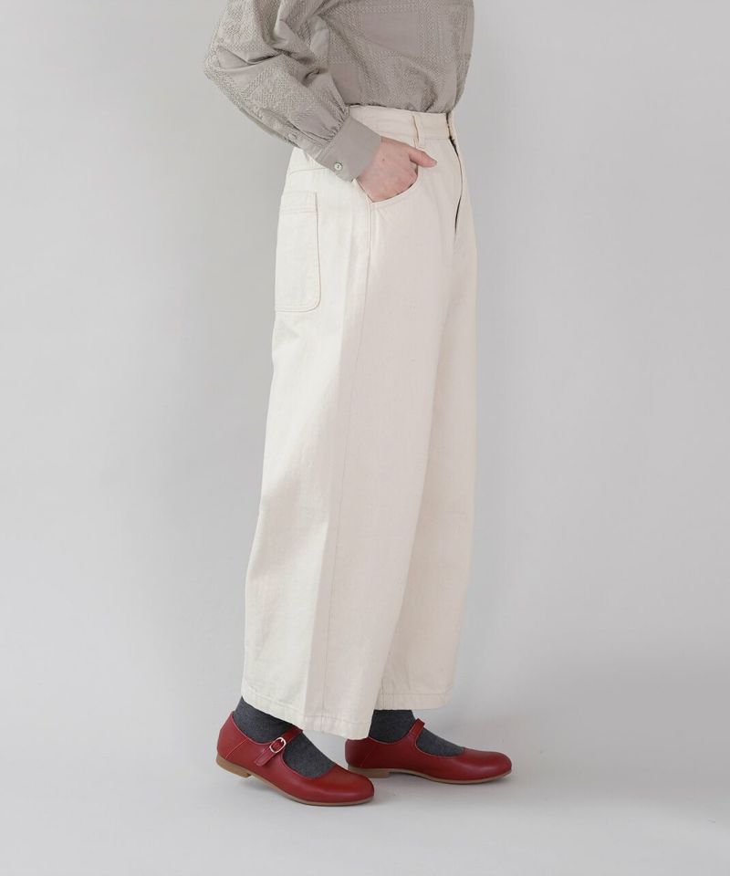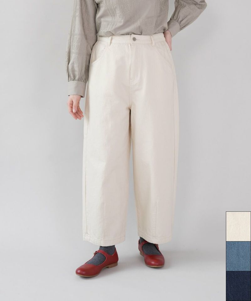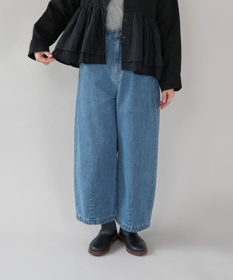 ほどよい厚みの10オンスデニムを使用したカーブパンツです 。裾にダーツが入ることで、立体的で丸みのあるワイドシルエットに仕上がっています。ウエストの後ろはゴム仕様でリラックスした着心地。ハイウエストデザインなので、シャツやインナーをインするスタイルもおすすめです。日常使いがしやすく、季節も問わず楽しめる1着です。