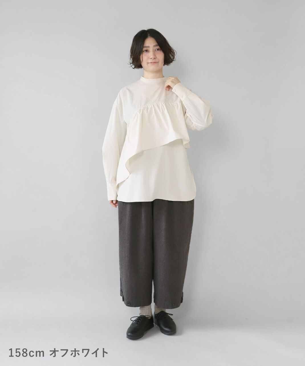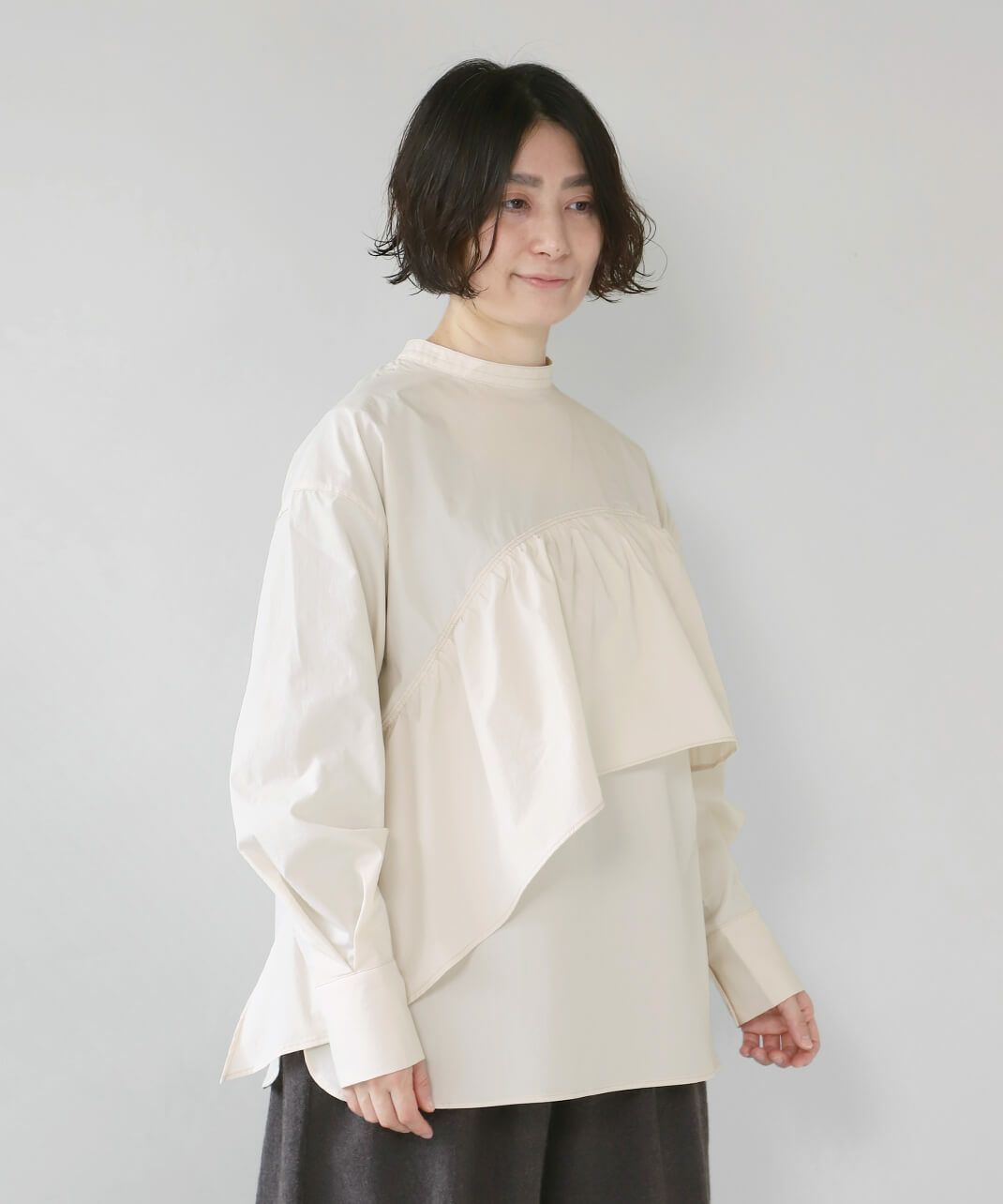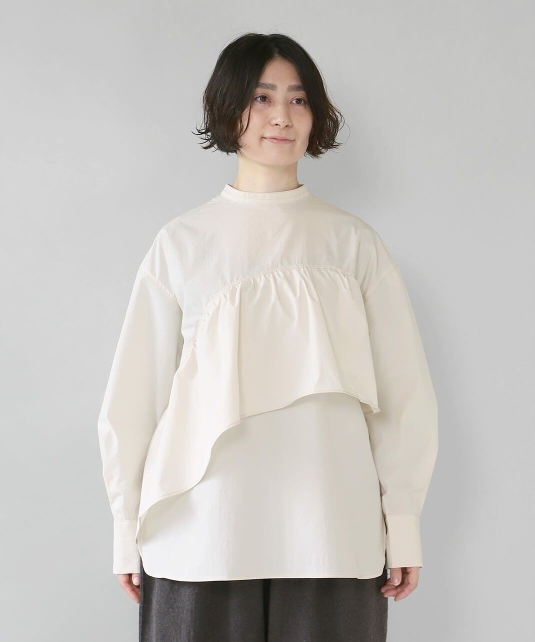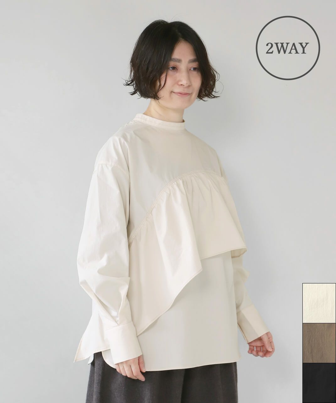 コットンのような風合いのポリエステルブロード素材を使用した前後2WAYブラウスです。 華やかなアシンメトリーフリルデザインと、シンプルなバンドカラーのデザインの前後2WAY仕様。袖のタックがきれいなシルエットをプラスしてくてれいます。 サイズは少しゆったりとして、リラックスした着心地です。その日の気分で雰囲気を変えることが出来る1着です。