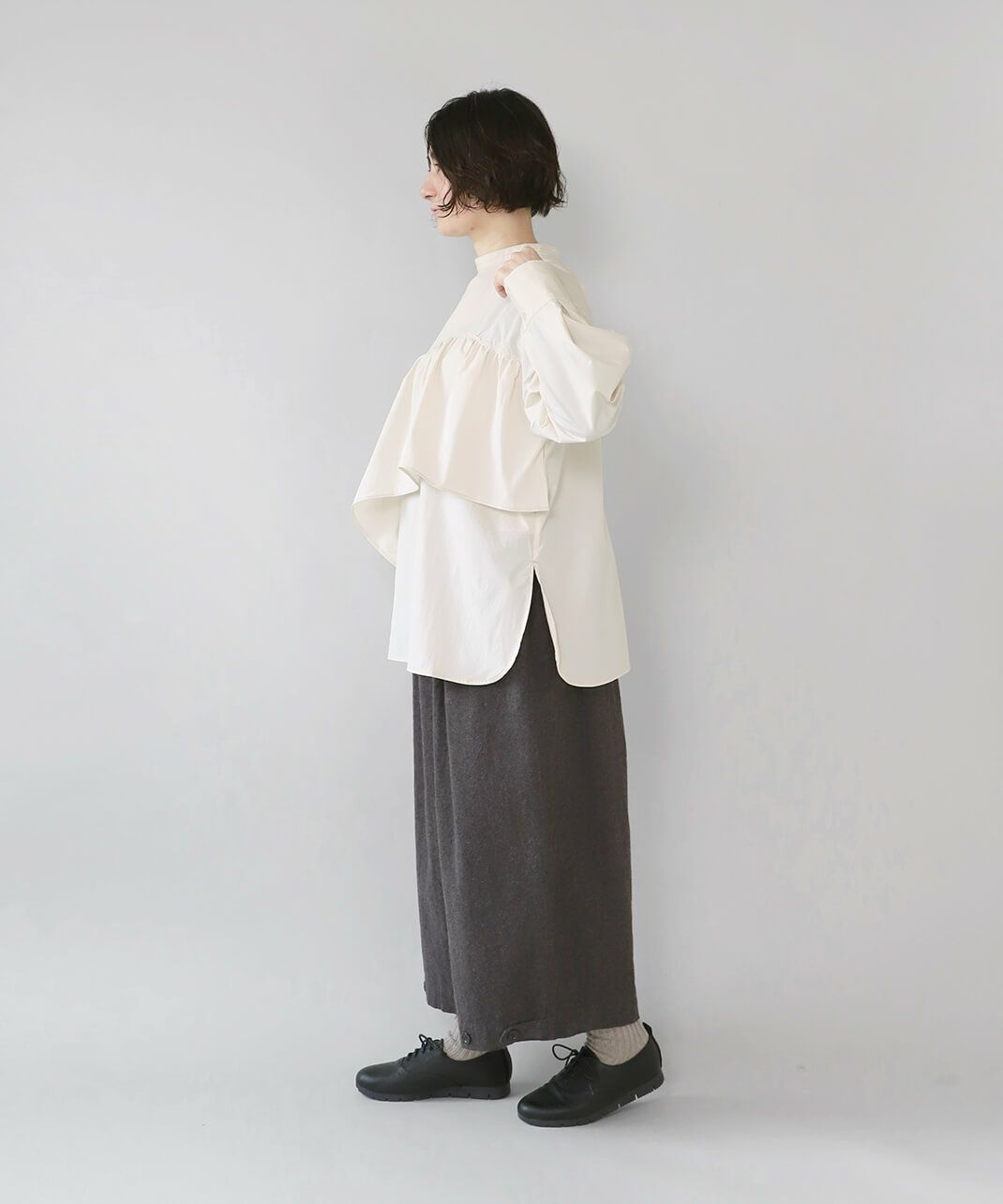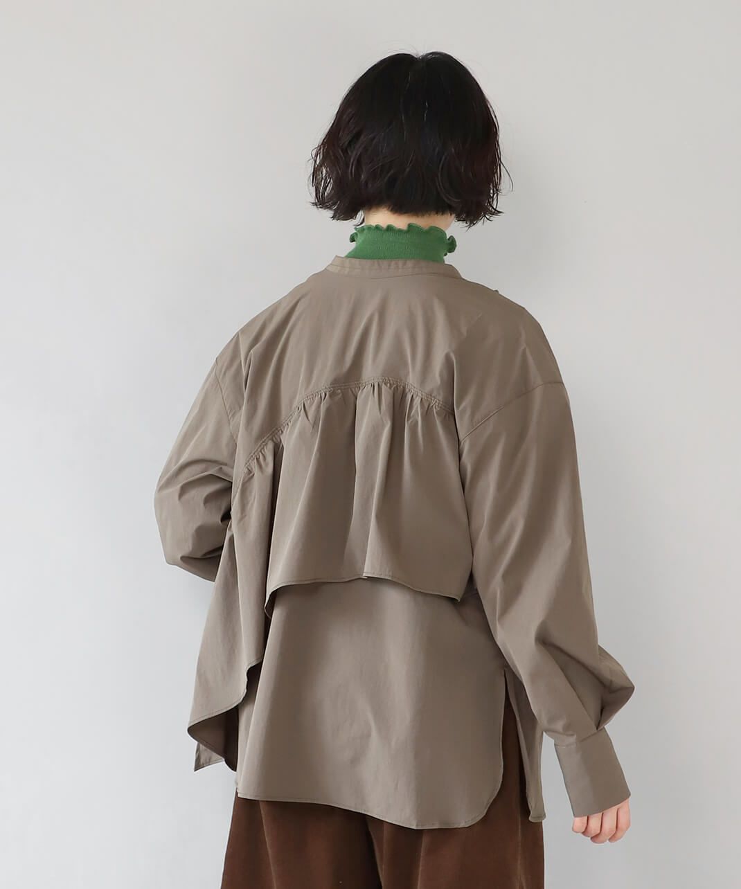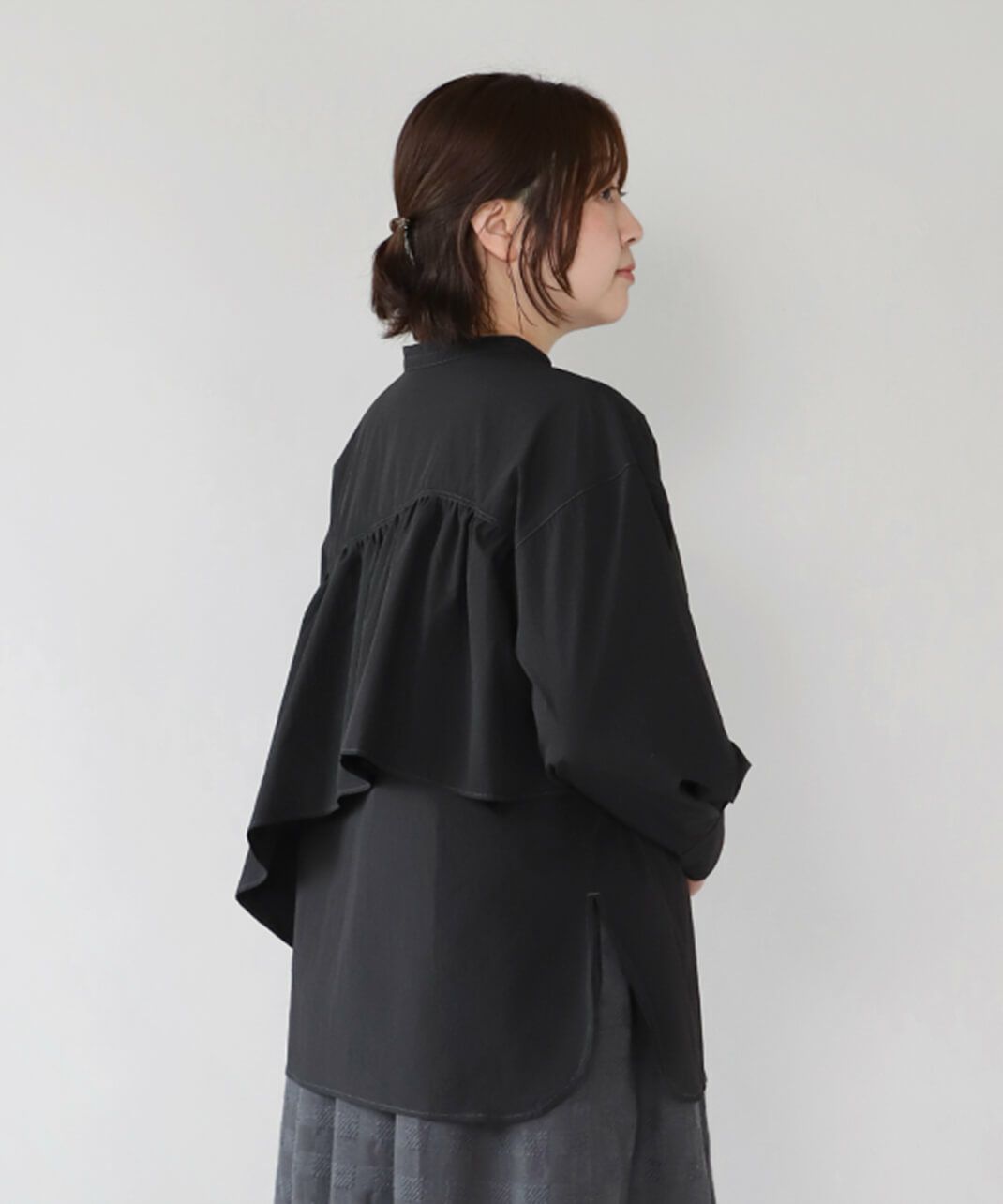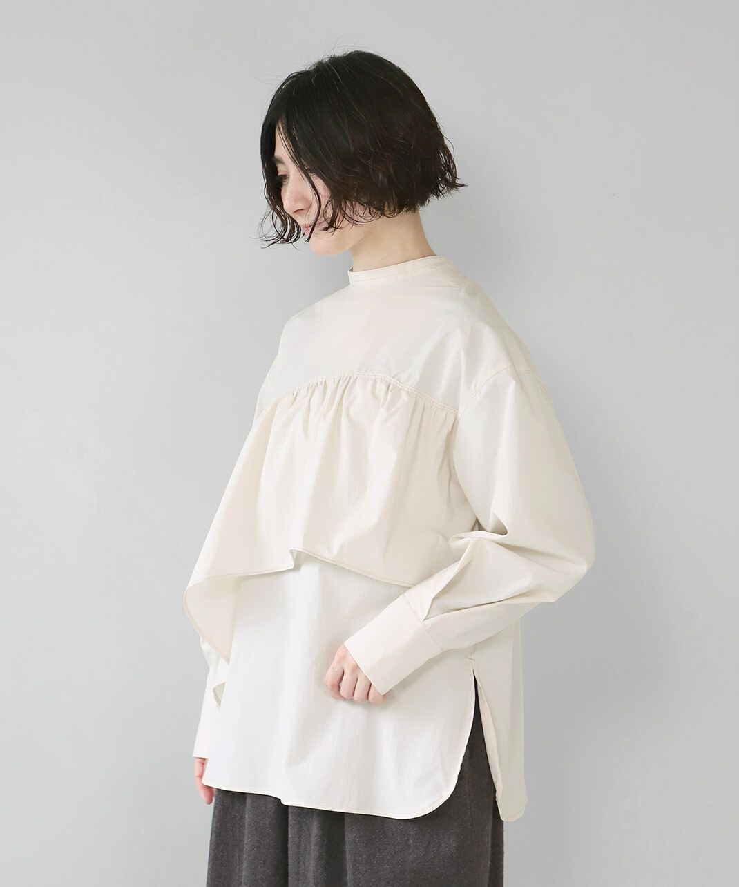 コットンのような風合いのポリエステルブロード素材を使用した前後2WAYブラウスです。 華やかなアシンメトリーフリルデザインと、シンプルなバンドカラーのデザインの前後2WAY仕様。袖のタックがきれいなシルエットをプラスしてくてれいます。 サイズは少しゆったりとして、リラックスした着心地です。その日の気分で雰囲気を変えることが出来る1着です。