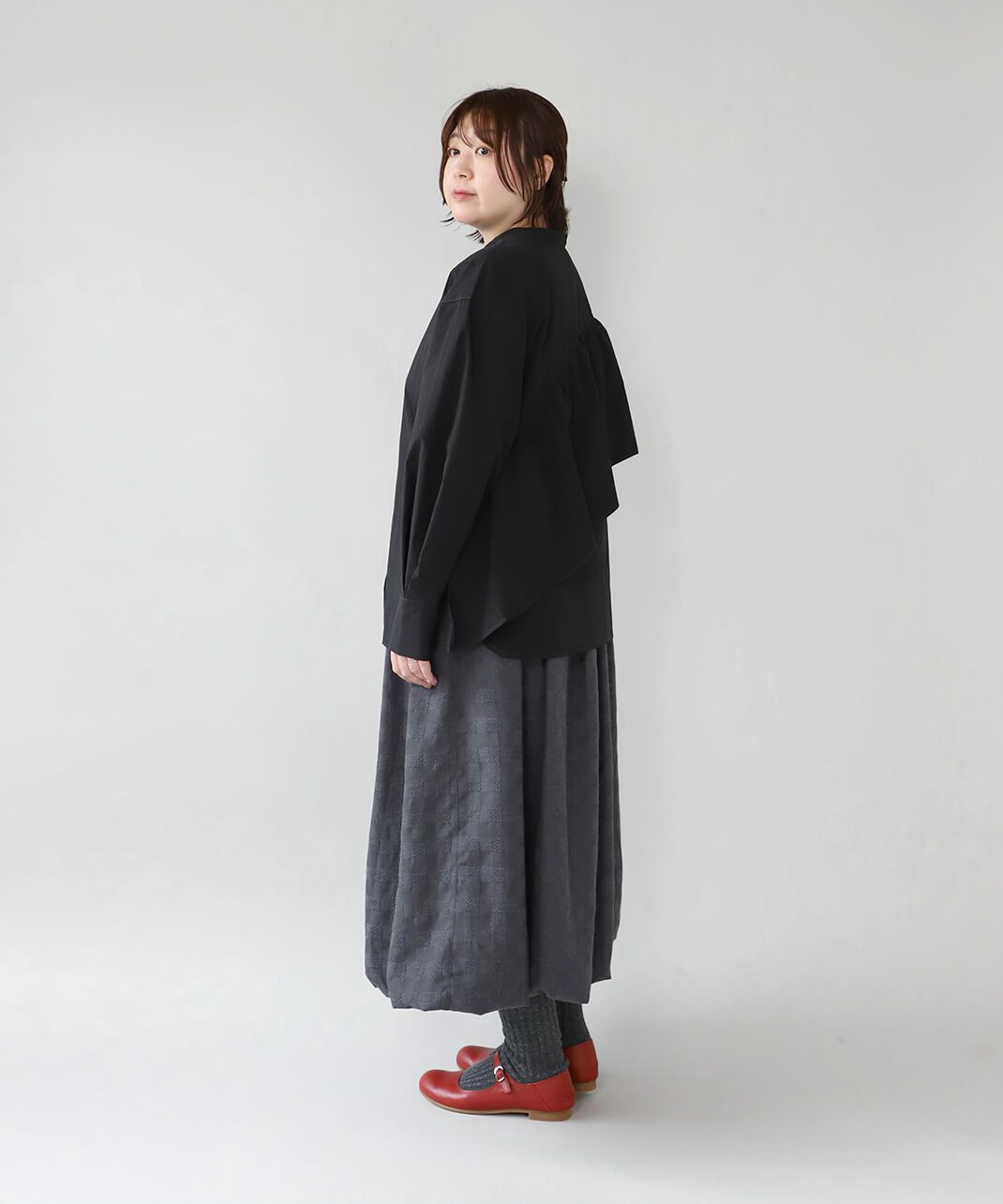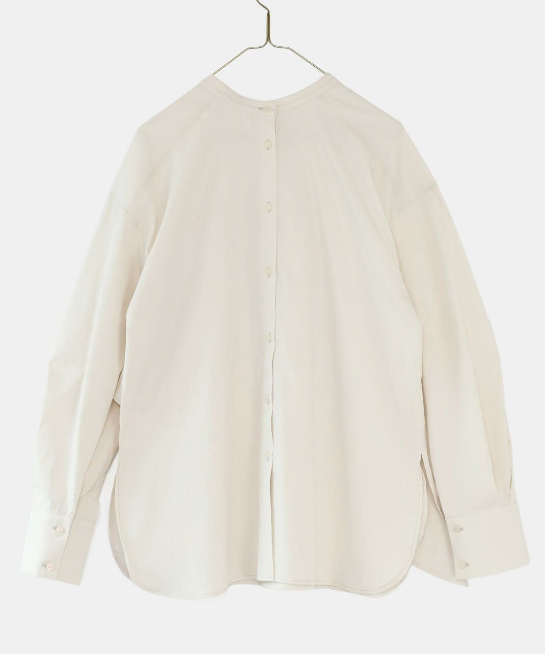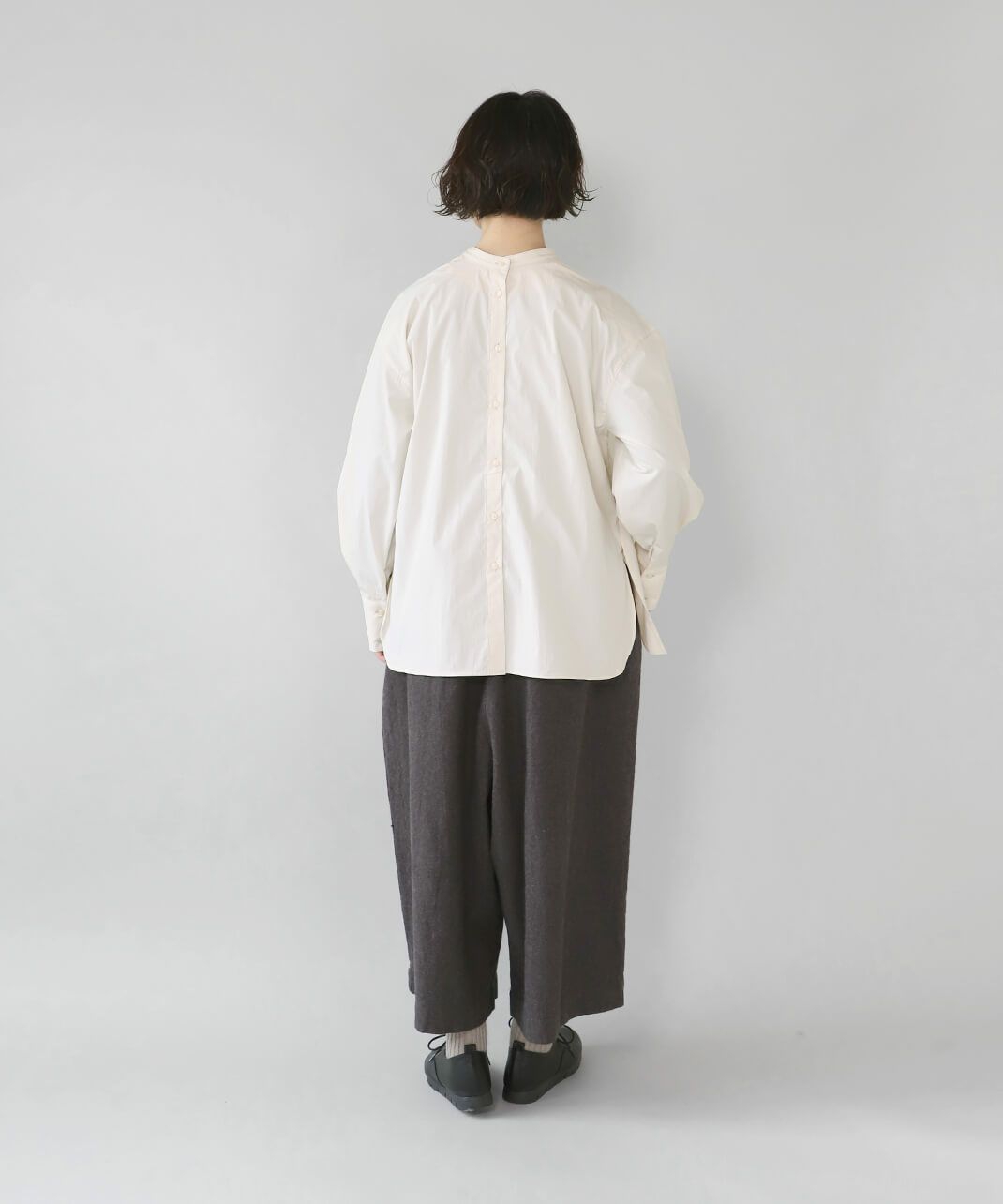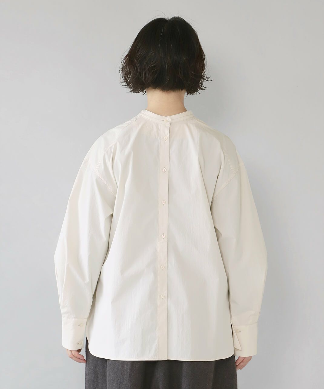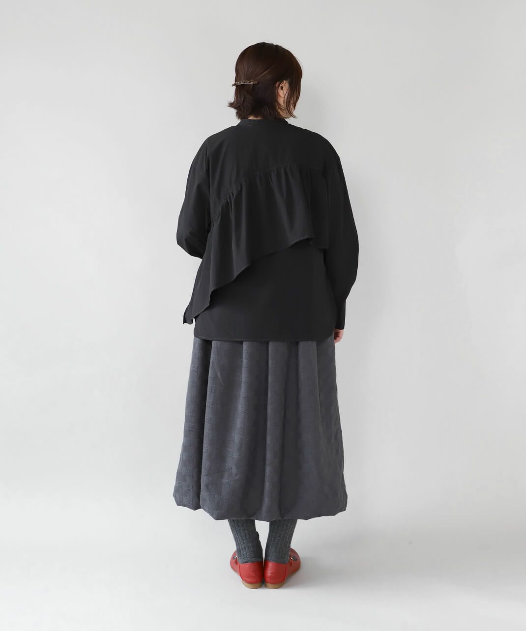 コットンのような風合いのポリエステルブロード素材を使用した前後2WAYブラウスです。 華やかなアシンメトリーフリルデザインと、シンプルなバンドカラーのデザインの前後2WAY仕様。袖のタックがきれいなシルエットをプラスしてくてれいます。 サイズは少しゆったりとして、リラックスした着心地です。その日の気分で雰囲気を変えることが出来る1着です。