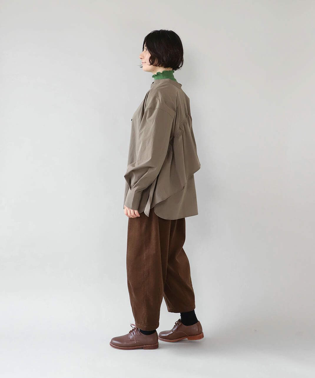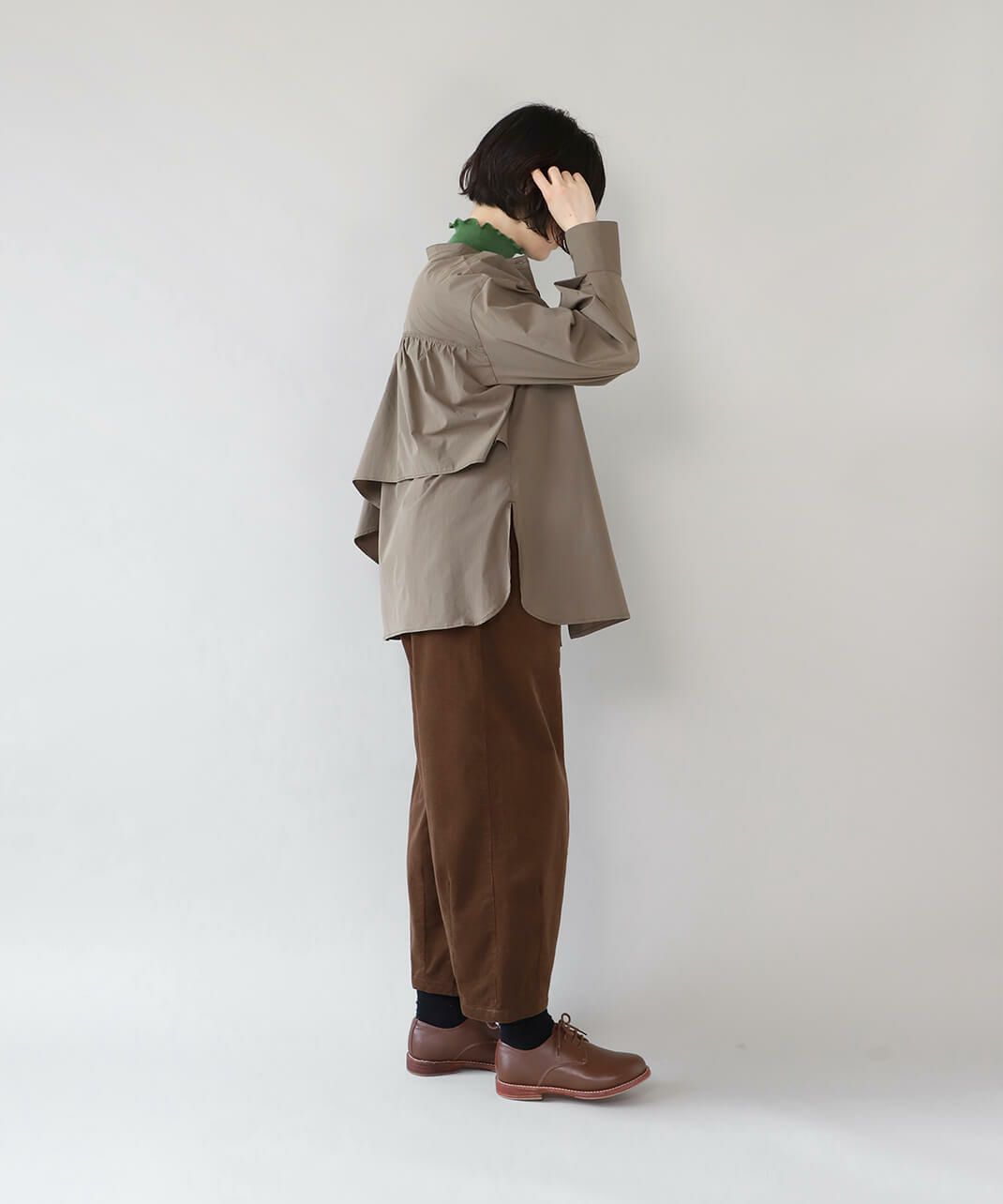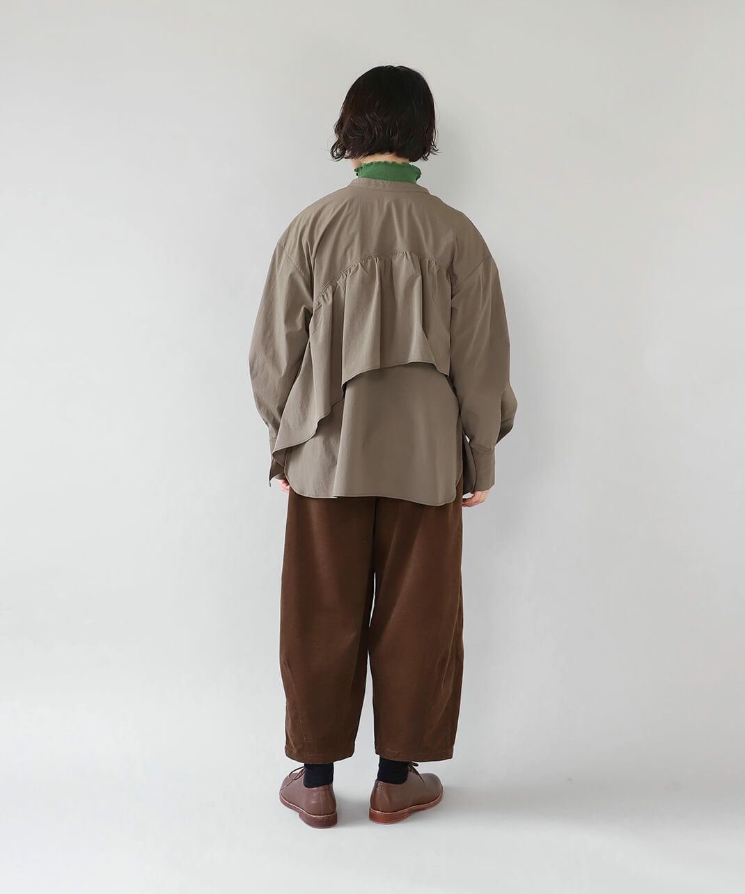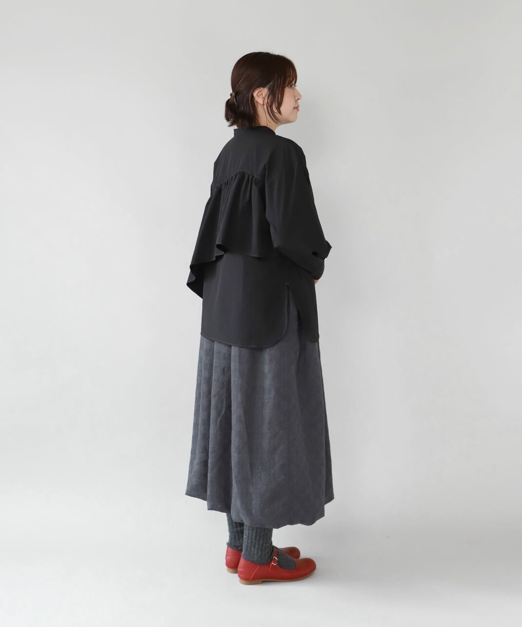 コットンのような風合いのポリエステルブロード素材を使用した前後2WAYブラウスです。 華やかなアシンメトリーフリルデザインと、シンプルなバンドカラーのデザインの前後2WAY仕様。袖のタックがきれいなシルエットをプラスしてくてれいます。 サイズは少しゆったりとして、リラックスした着心地です。その日の気分で雰囲気を変えることが出来る1着です。
