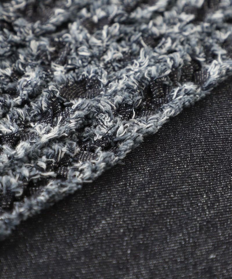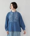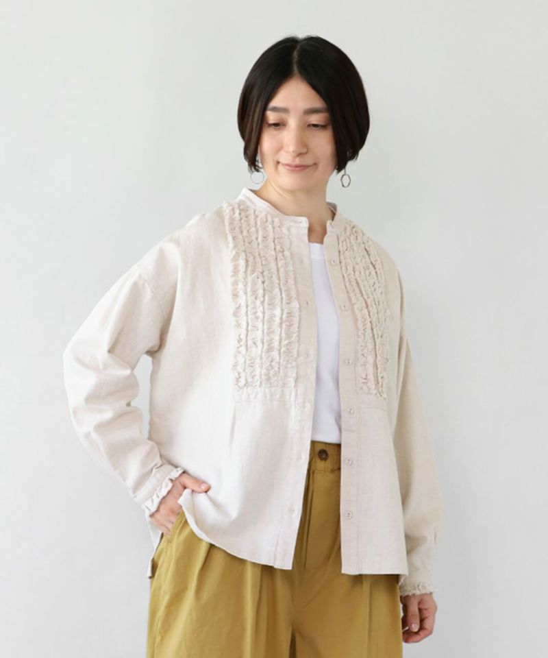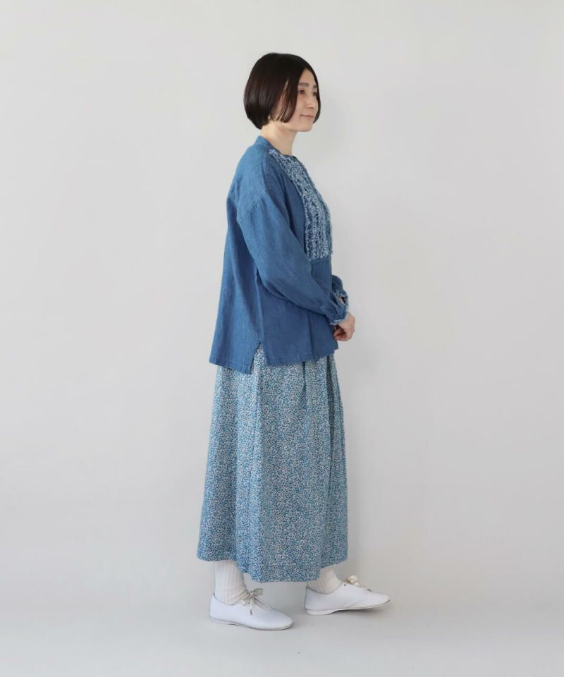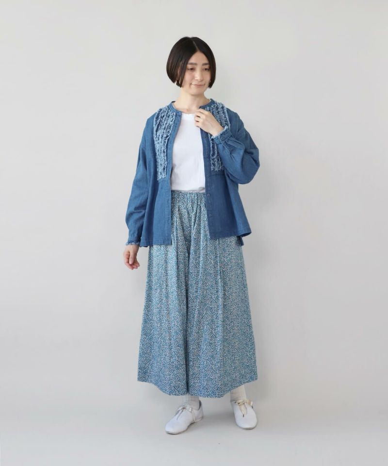やわらかな肌触りのコットンリネンの甘撚りデニムを使用したブラウスです。 立体的なフリンジフリルのデザインが顔周りを華やかにしてくれます。シンプルなバンドカラーにほどよいゆとりの身幅でリラックスした着心地。前後差のついた少し長めの着丈とサイドスリットで抜け感のある着こなしに。ブラウスとしてはもちろん、ボタンを開けて軽い羽織りとしての着用もおすすめです。