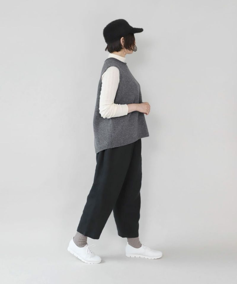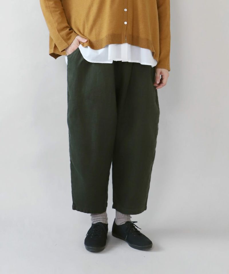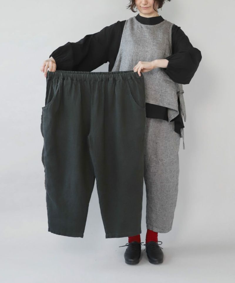 ネップ感のある起毛リネンを使用したパンツです。 ウエストがぐんと伸びるista-ireの定番、istaパンツ。太もも周りにゆとりがあり、テーパードの効いたアンクル丈のシルエットに仕上がっています。 柔らかく温かみのある風合いがナチュラルな雰囲気を演出してくれます。 同素材のベストとのセットアップもおすすめです。