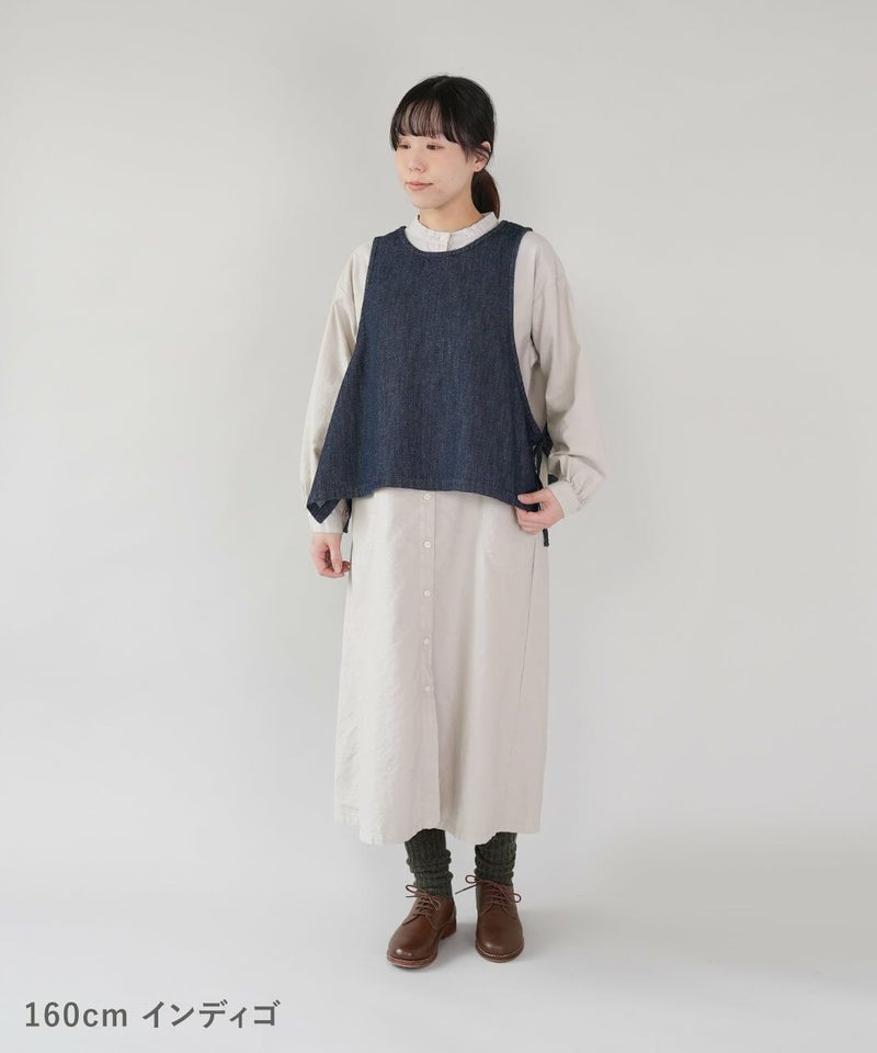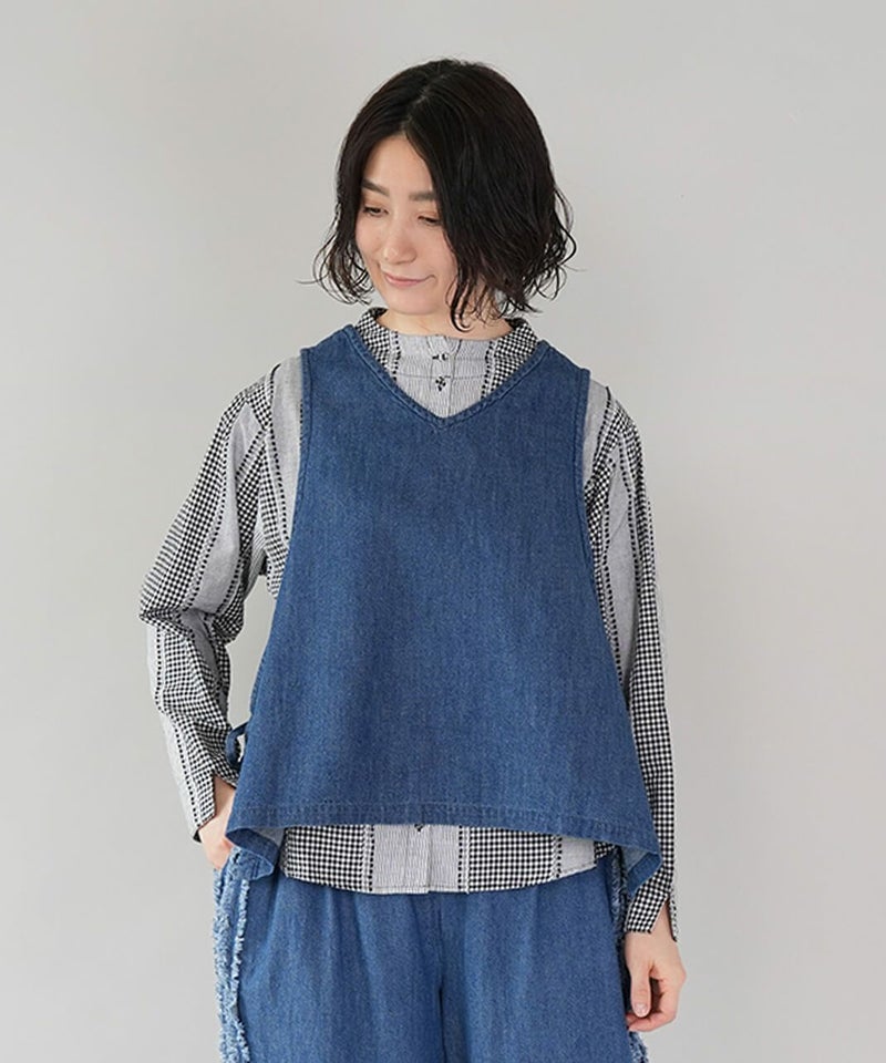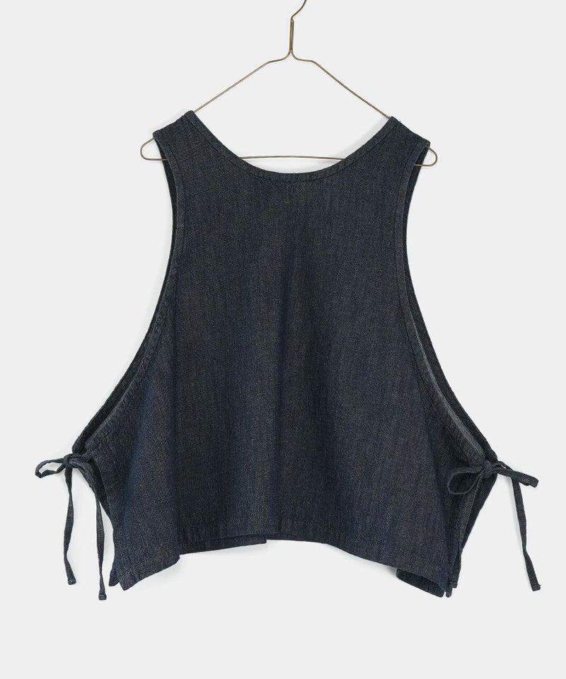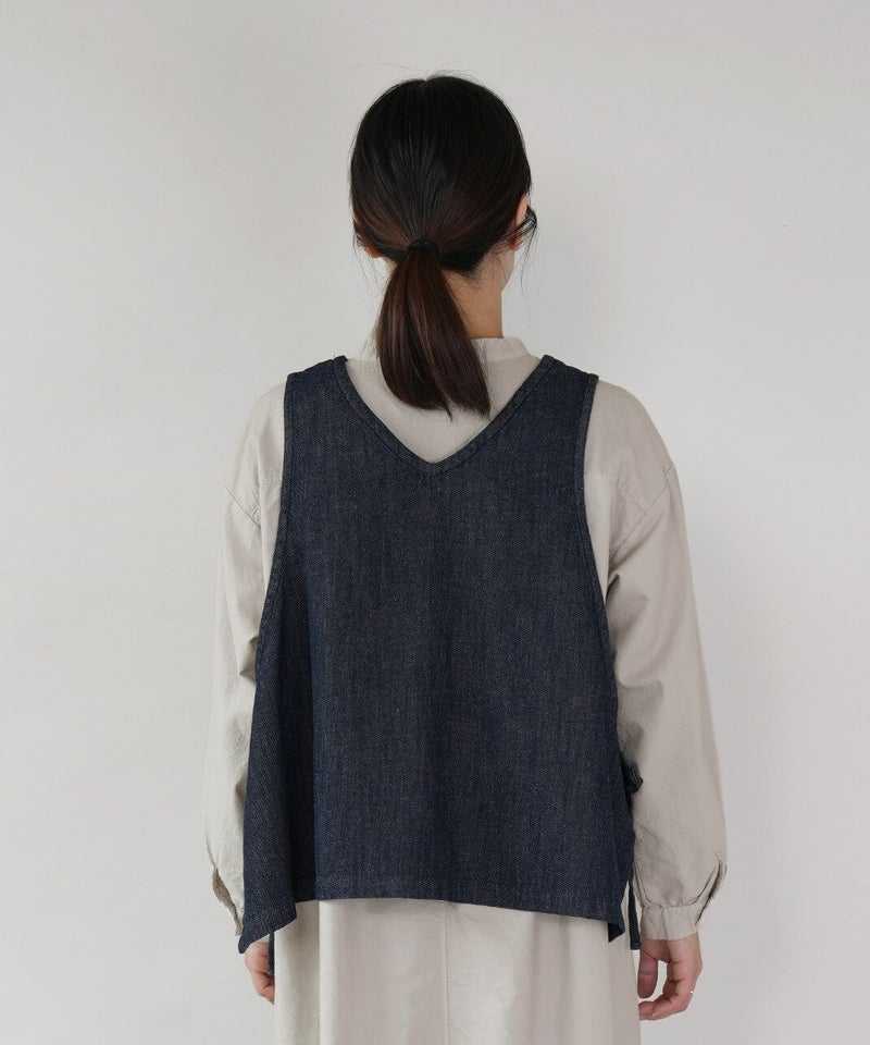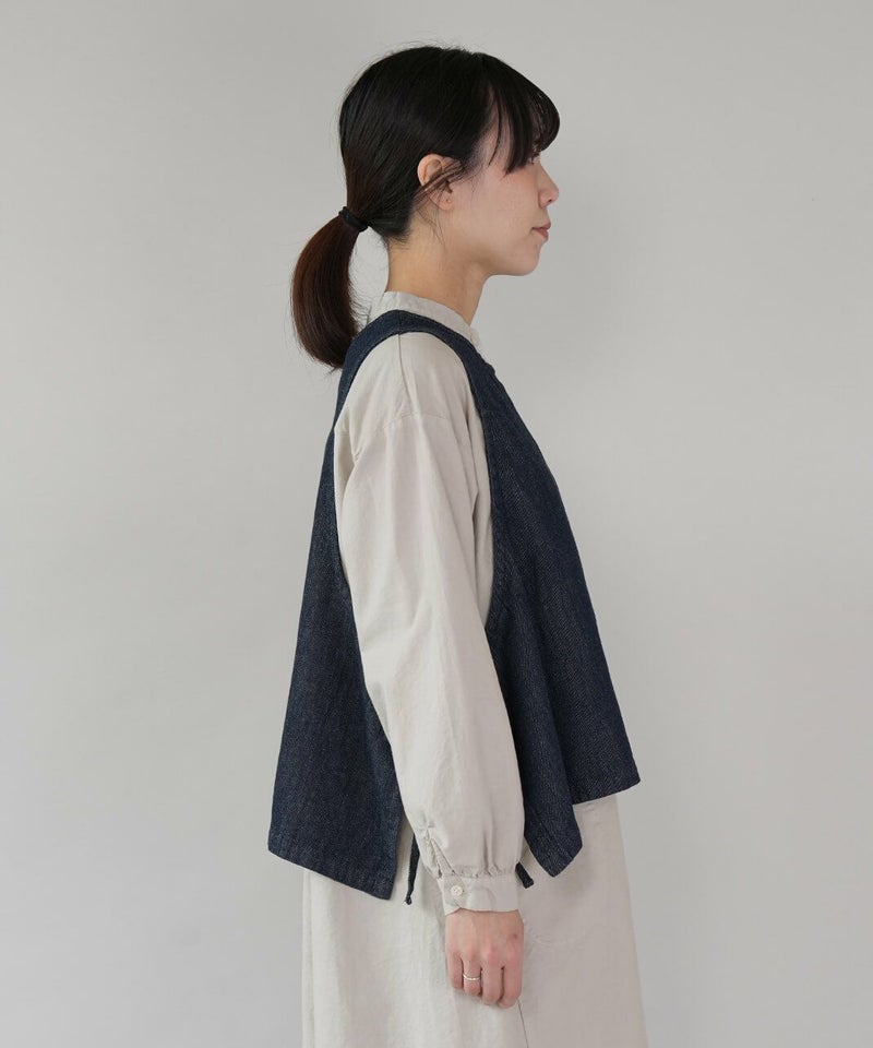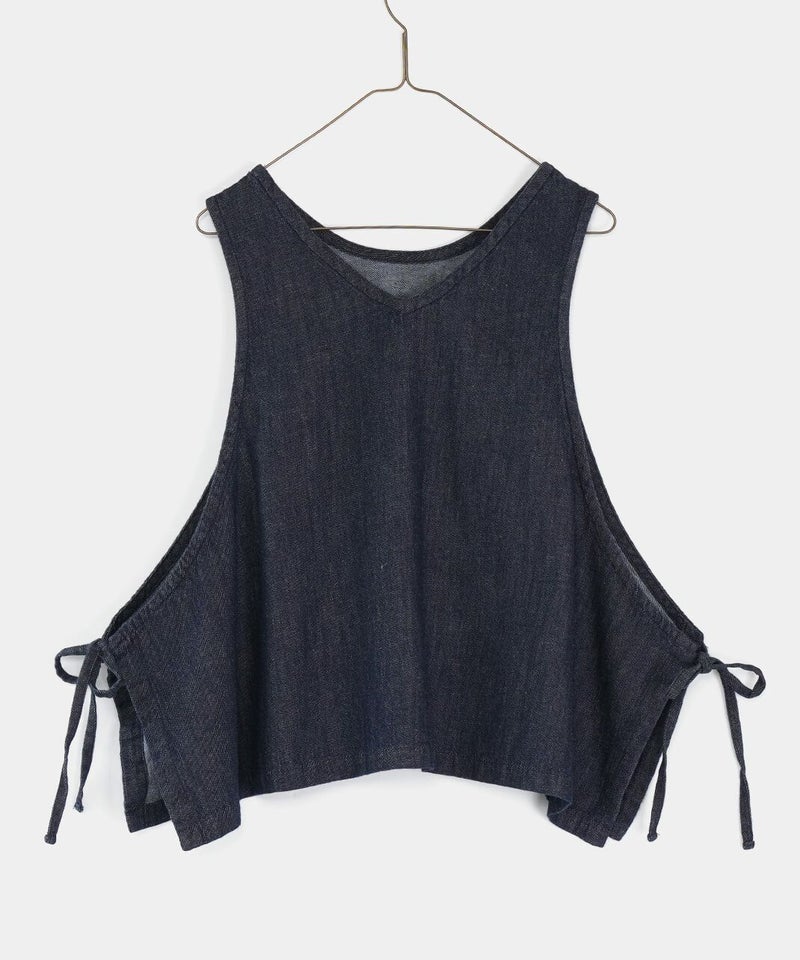 やわらかい6.5オンスのコットン甘撚りデニム生地のベストです。Vネックとクルーネックの前後着用可能な2WAY仕様。サイドのリボンがシンプルの中に可愛さをプラスしてくれ、ワンピースやブラウスなどいつものアイテムとのコーディネートのアクセントになります。同素材のパンツやジャケットとのセットアップもおすすめです。
