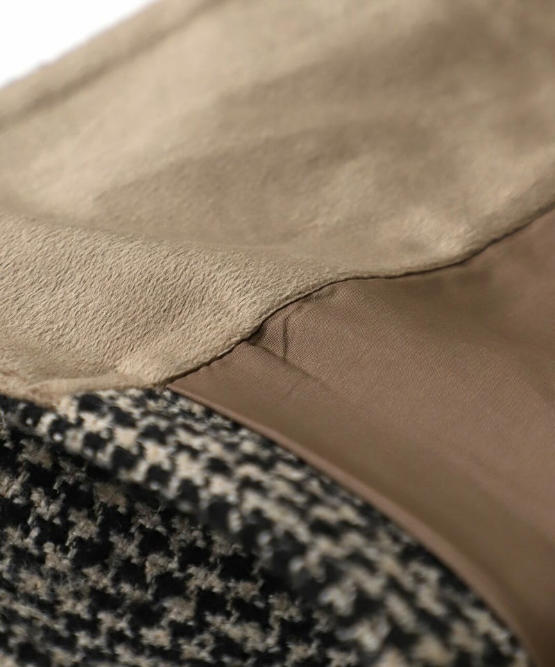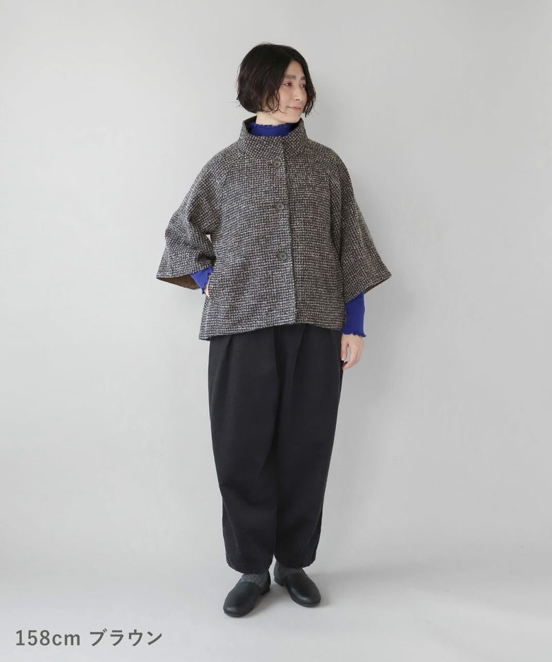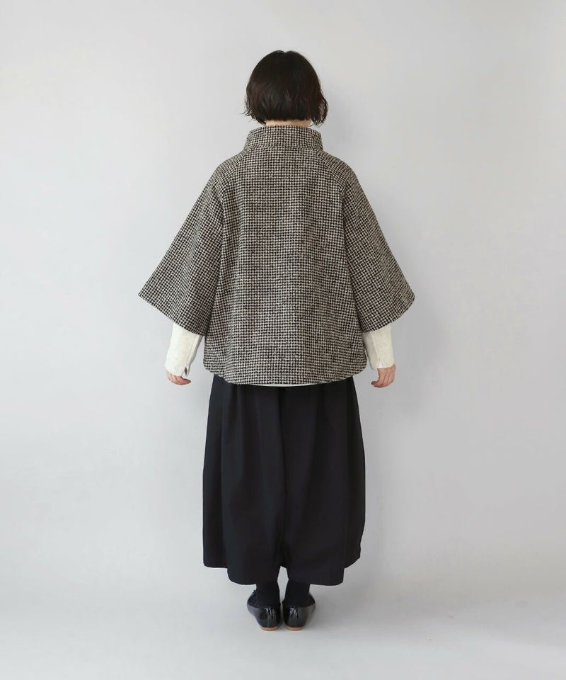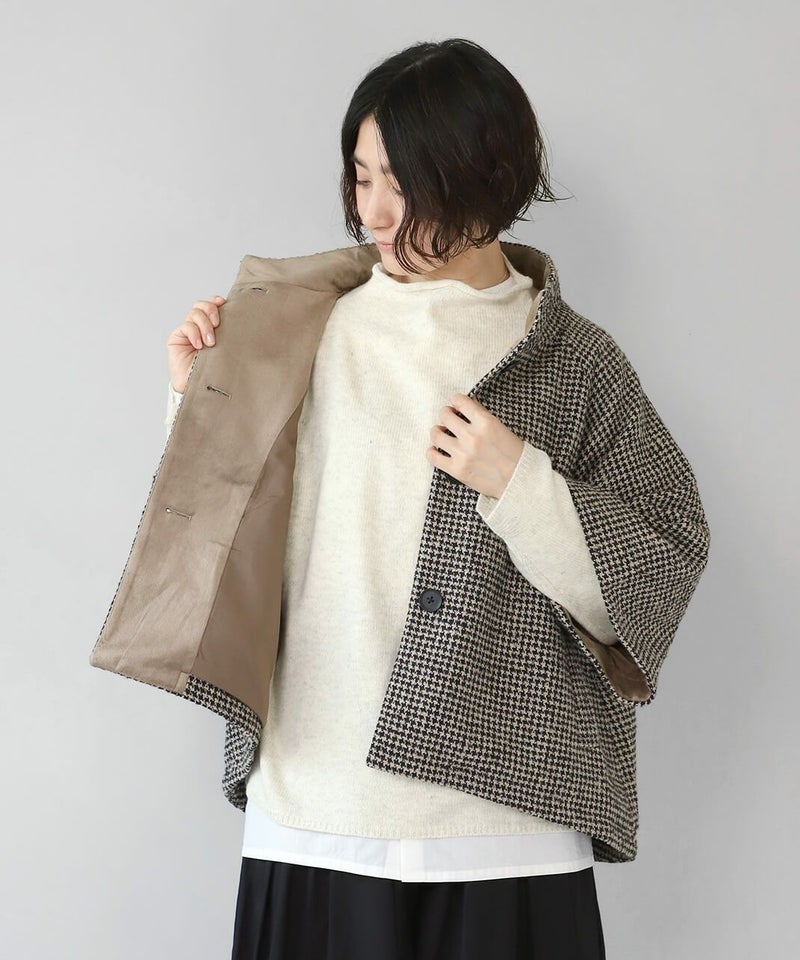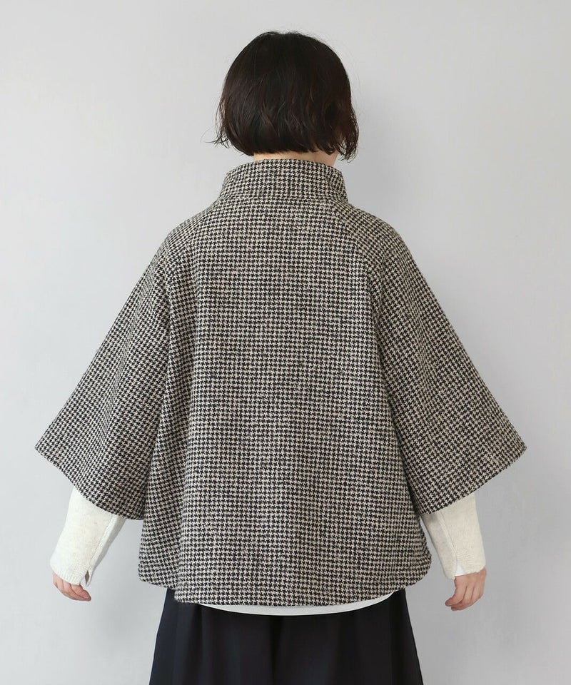 ざっくりと織り上げた千鳥チェックのポンチョシルエットコートです。 ツイード生地のような上品さで、クラシカルな印象の1着です。Aラインのポンチョのようなデザインで、コーディネートの主役にスタイリングを楽しむのがおすすめ。脱着がスムーズに行える、なめらかな裏地つきです。