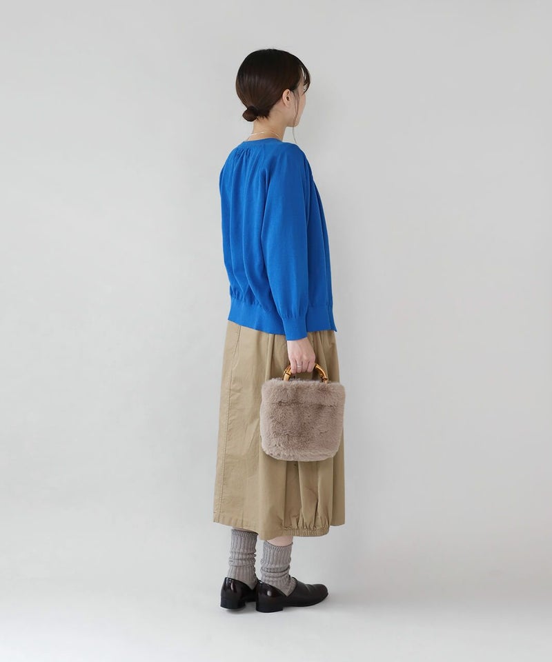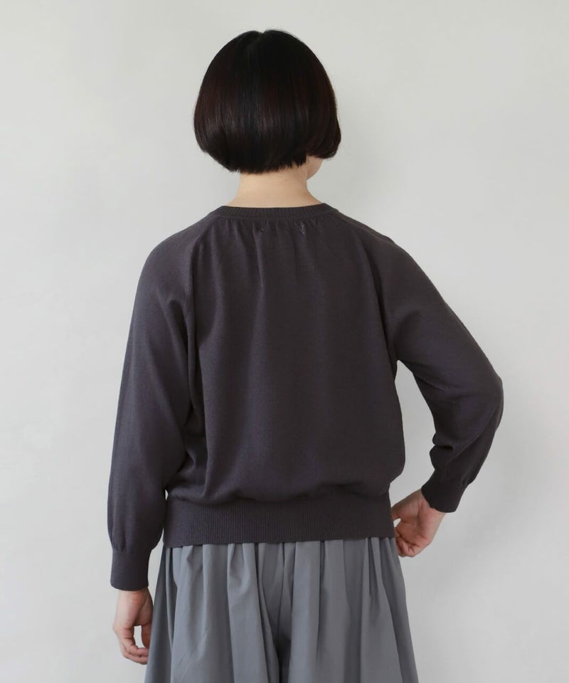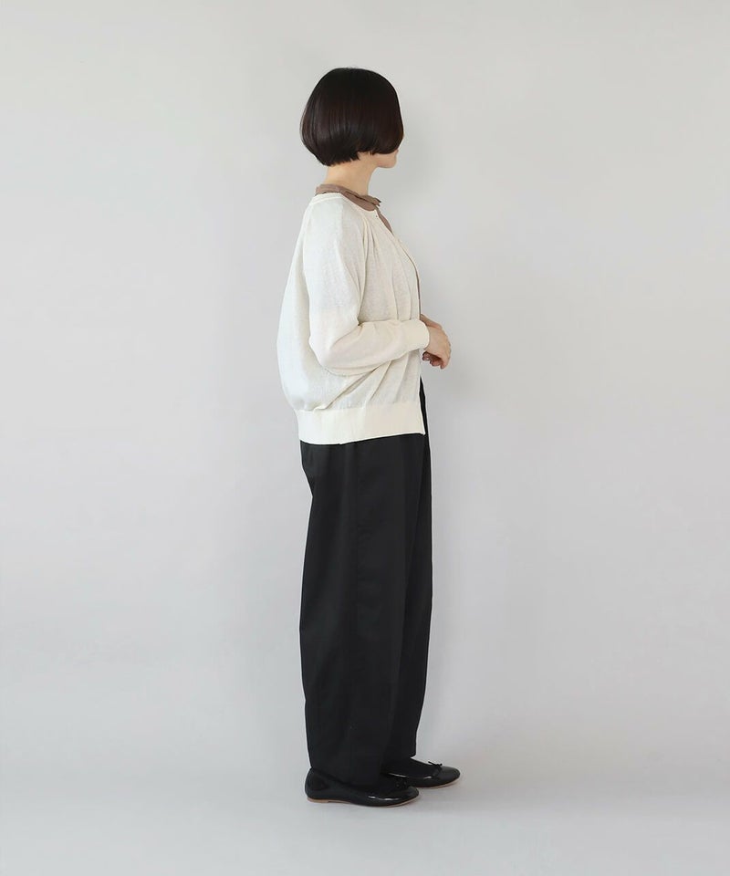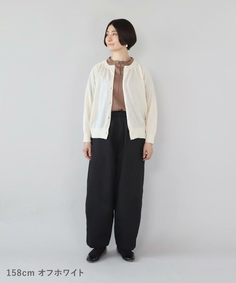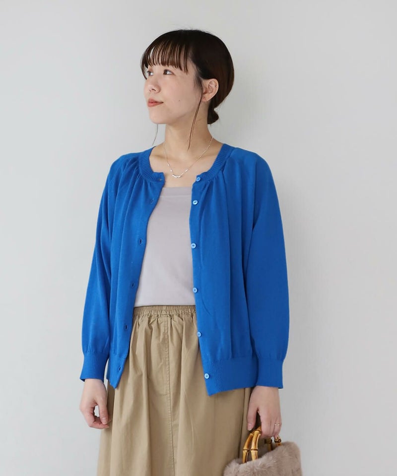 コットン強撚糸を使用し、ドライな肌触りのカーディガンです。 襟ぐりと裾・袖にギャザーが入ることで、ふんわりと軽い着心地に。コンパクトでシンプルなデザインです。ほどよいシアー感はこれからの季節におすすめの1着です。