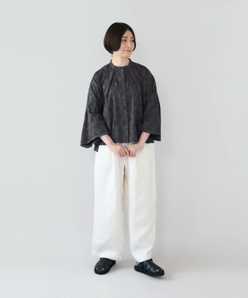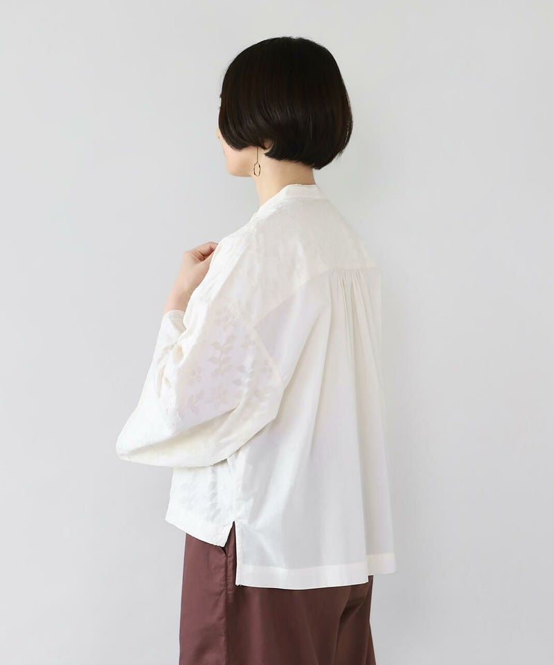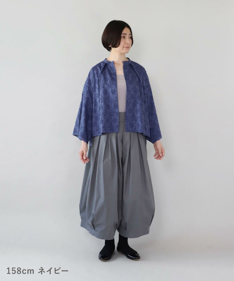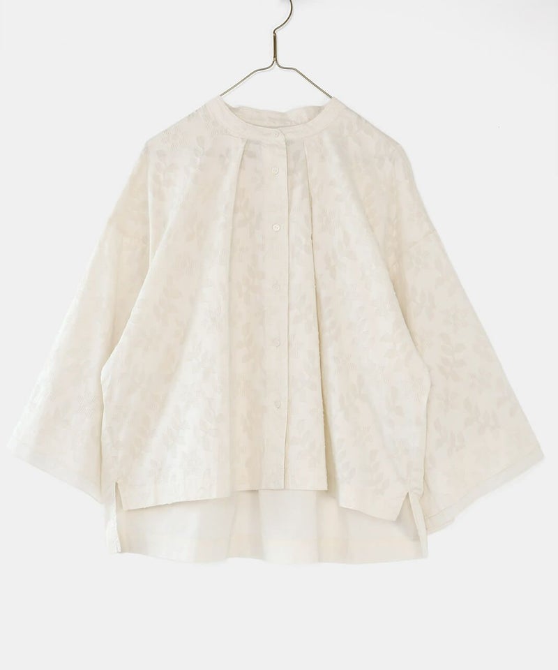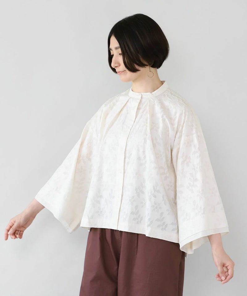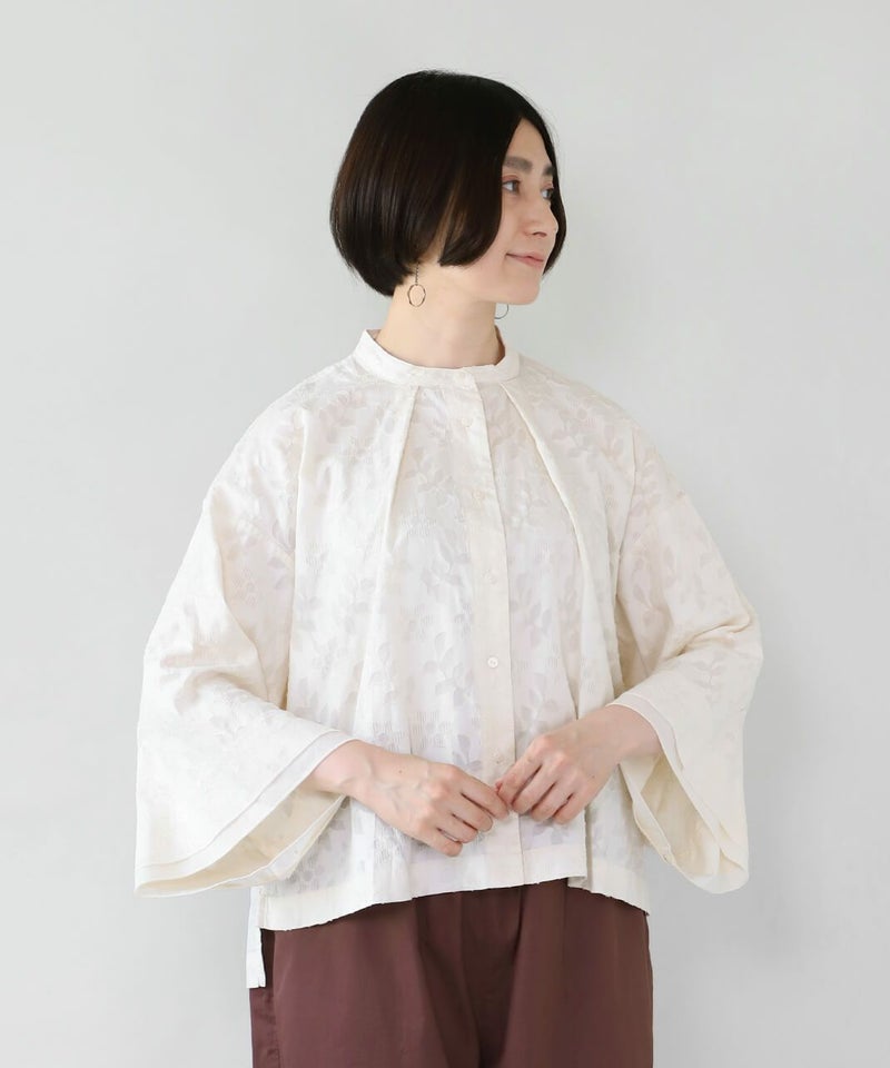 シアー感のあるジャガード柄を活かしたブロードコットン素材のブラウスです。 フレアシルエットにデザインされた袖が印象的な1着です。リンドウの花モチーフのジャガード柄がシックできちんとした印象を演出してくれます。すっきりとしたバンドカラーとワイドな身頃でゆったりとした着心地です。後ろは無地に切替え、すっきりとしています。ブラウスとしてはもちろん、ボタンを開けて羽織りとしての着用もおすすめです。