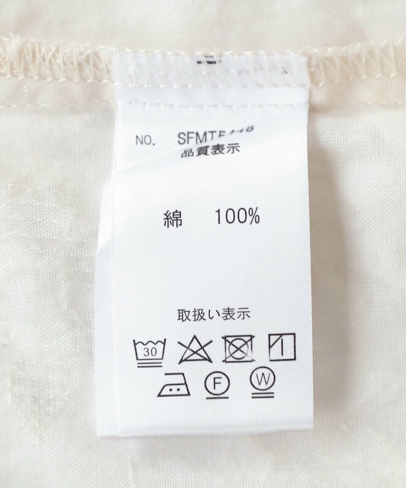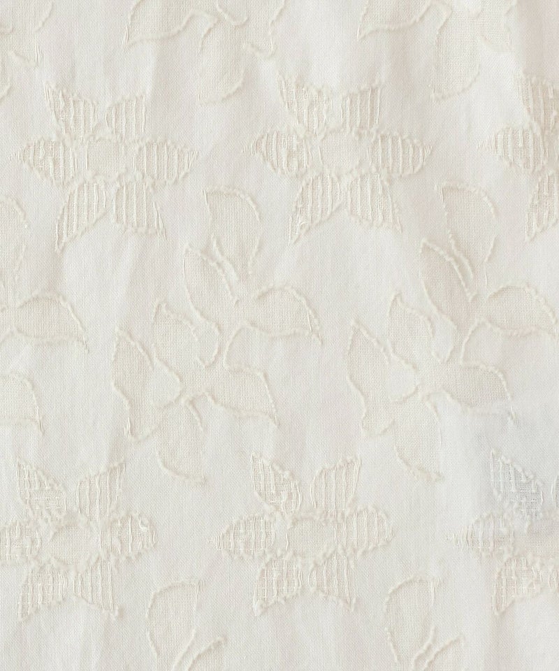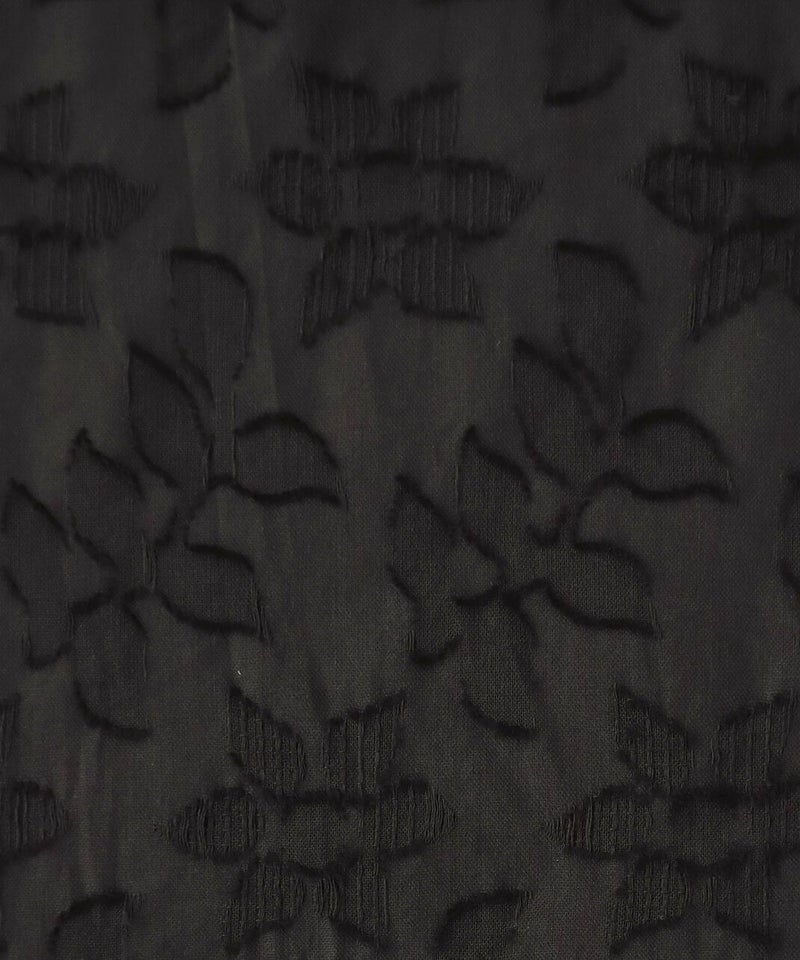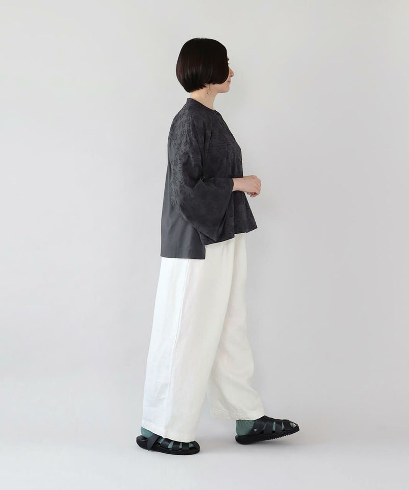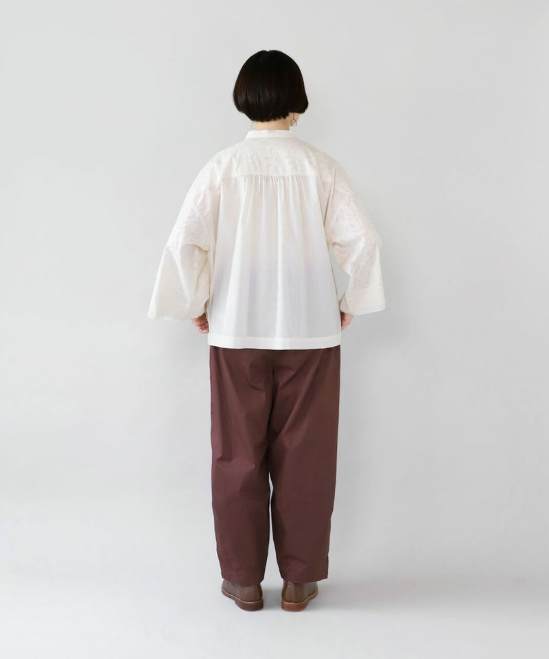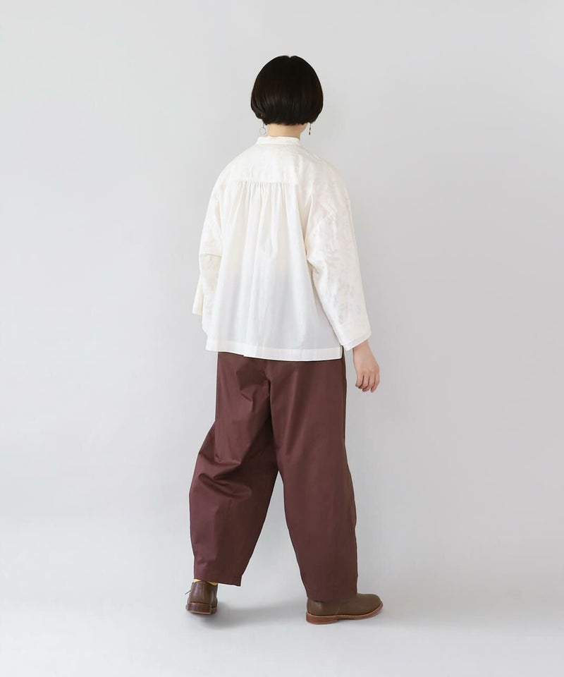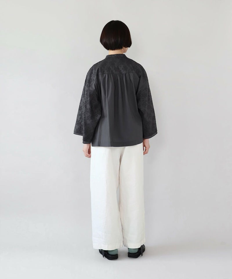 シアー感のあるジャガード柄を活かしたブロードコットン素材のブラウスです。 フレアシルエットにデザインされた袖が印象的な1着です。リンドウの花モチーフのジャガード柄がシックできちんとした印象を演出してくれます。すっきりとしたバンドカラーとワイドな身頃でゆったりとした着心地です。後ろは無地に切替え、すっきりとしています。ブラウスとしてはもちろん、ボタンを開けて羽織りとしての着用もおすすめです。