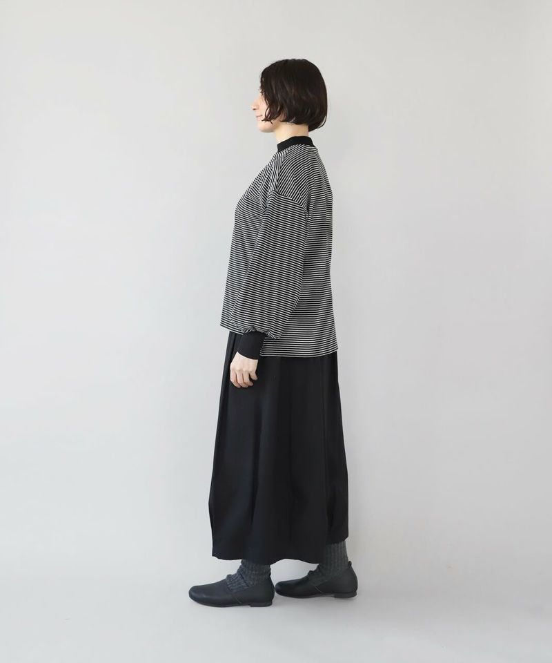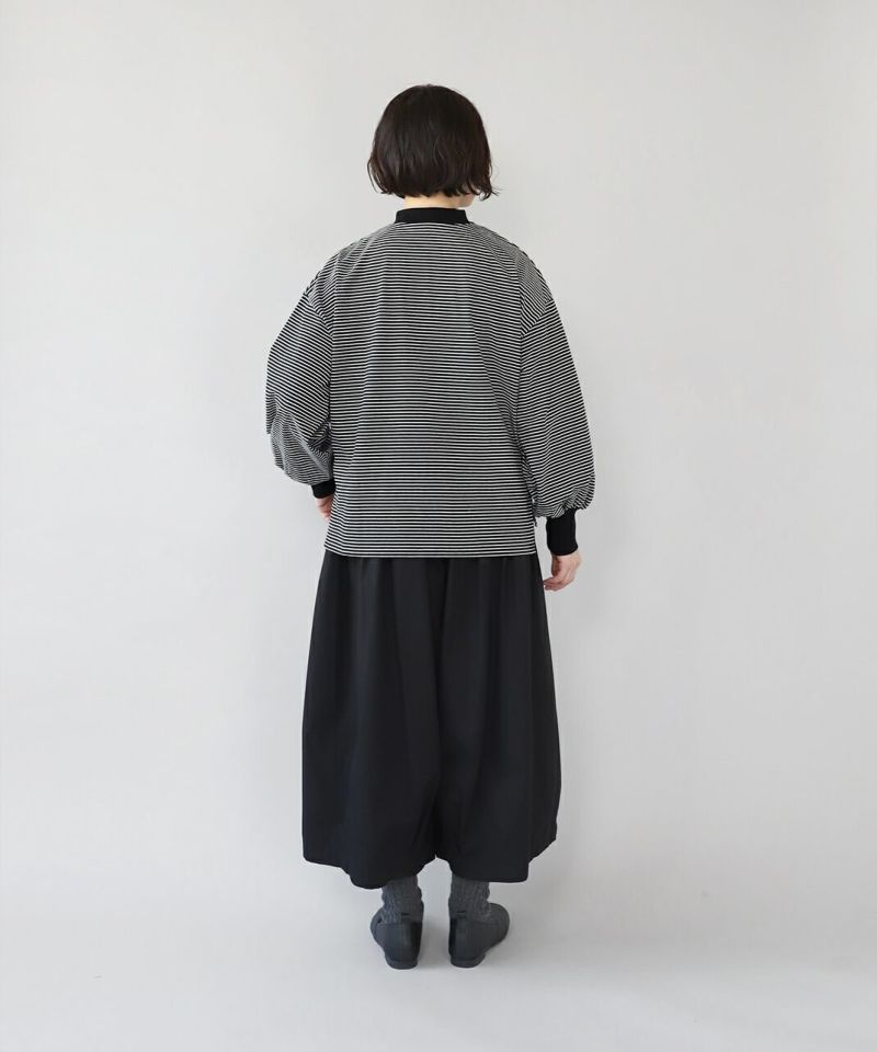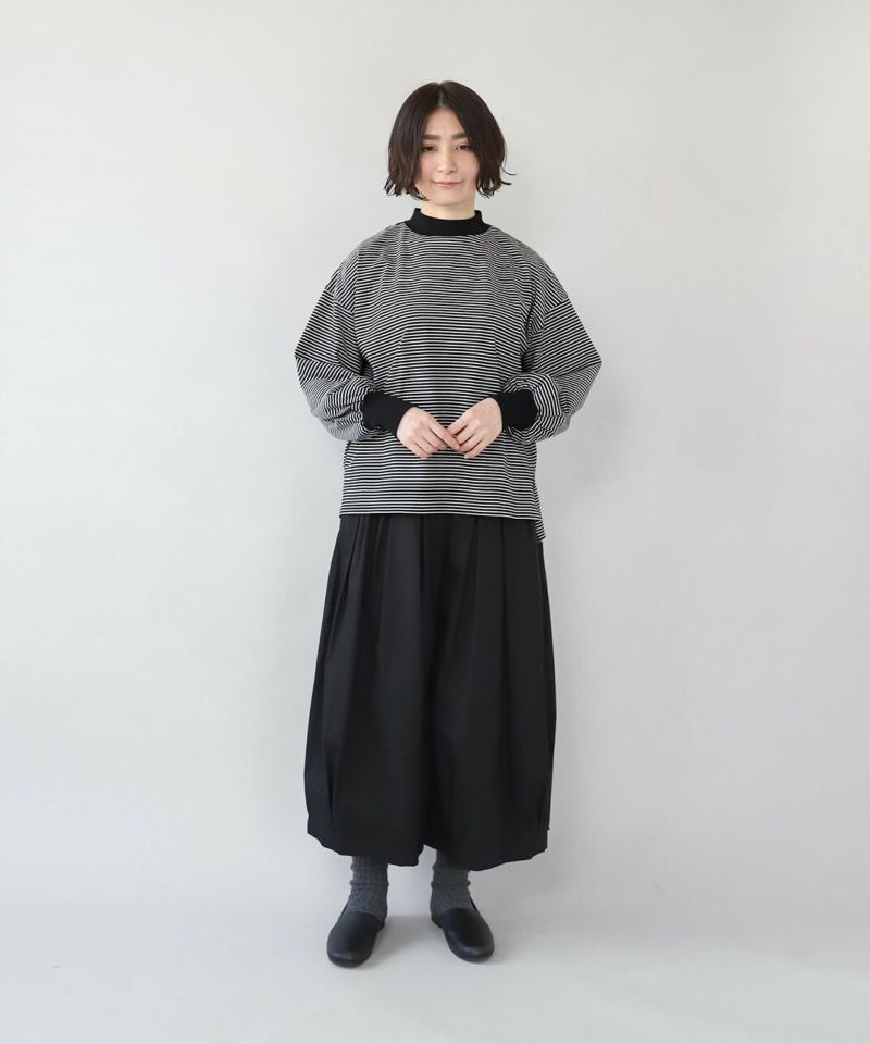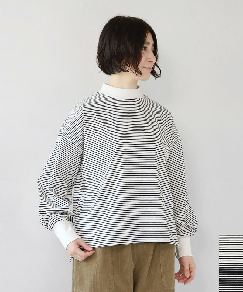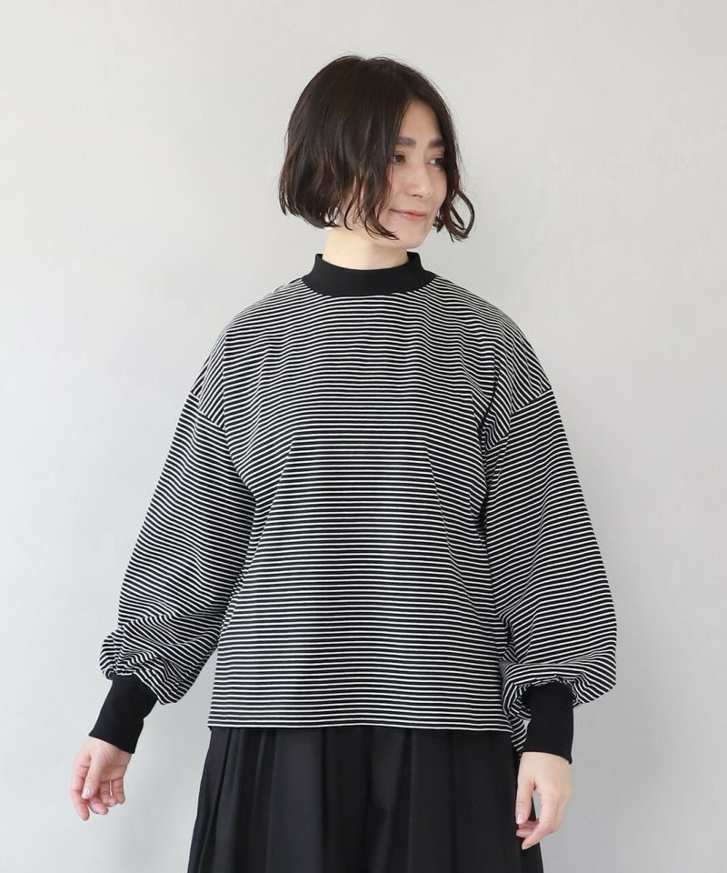 ハイネックと襟・袖口のリブ切替えの程よいカジュアルさと特徴的なボリューム袖が大人可愛い雰囲気を演出してくれます。