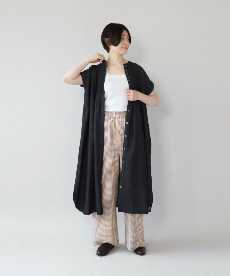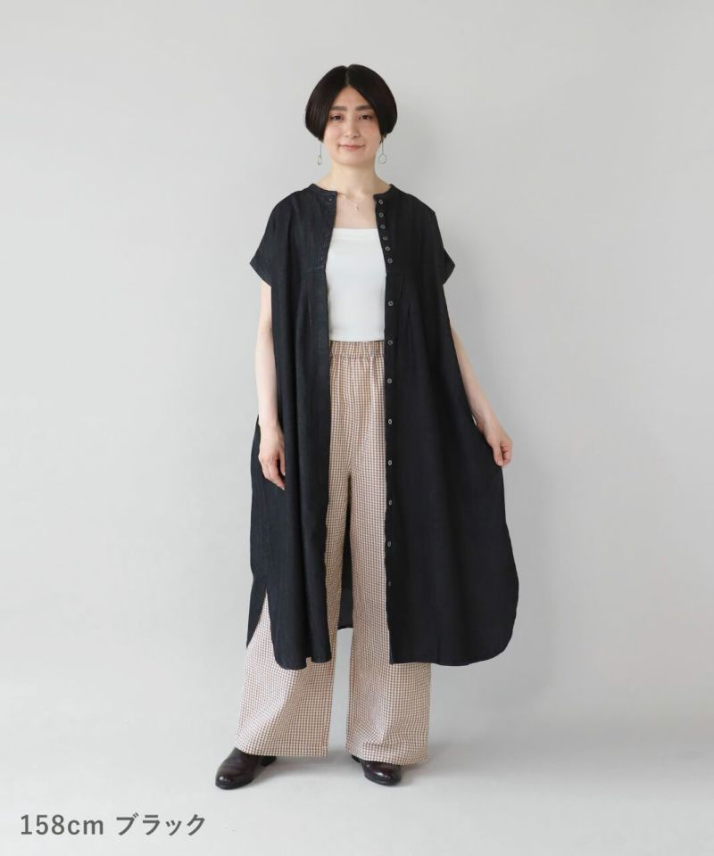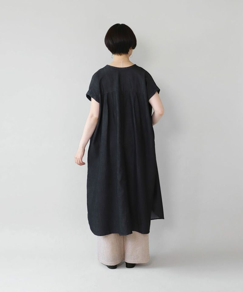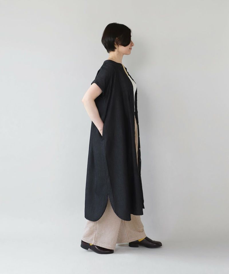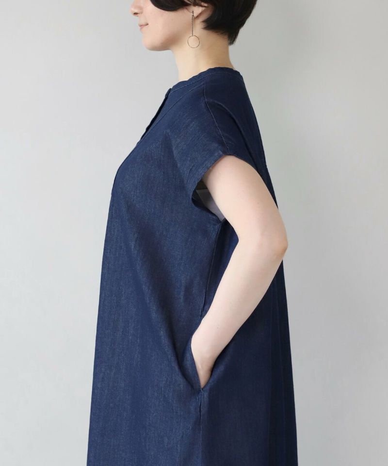 軽やかでさらりとしたコットンテンセルデニム生地を使用した2WAY切替えワンピースです。 首元はコンパクトなスタンドカラーですっきりと、肩がほんのり落ちるフレンチスリーブデザイン。前後にタックが入り、裾に向かってふんわり広がるきれいなシルエットです。身幅はゆとりがあり、リラックスして着用できます。さらに前後着用可能な2WAY仕様なため、雰囲気の違う着こなし。 さらに前後着用可能な2WAY仕様。1枚でさらっと涼しくワンピースとしてはもちろん、ボタンを開けて羽織りとしても着回せるおすすめの1着です。