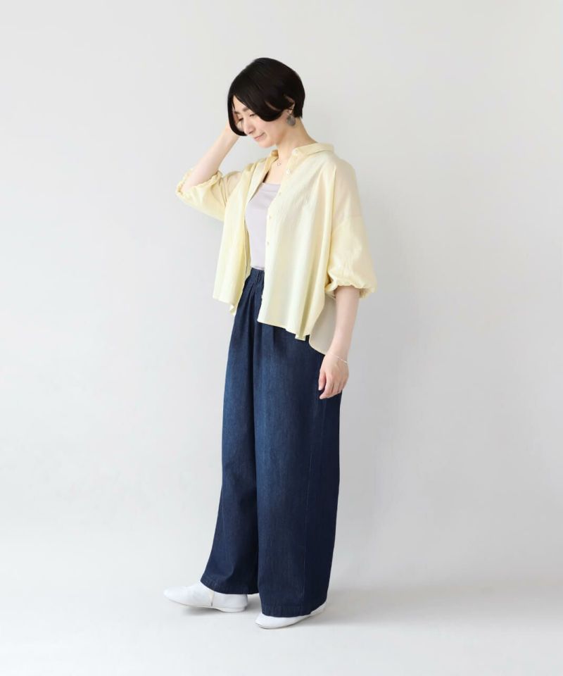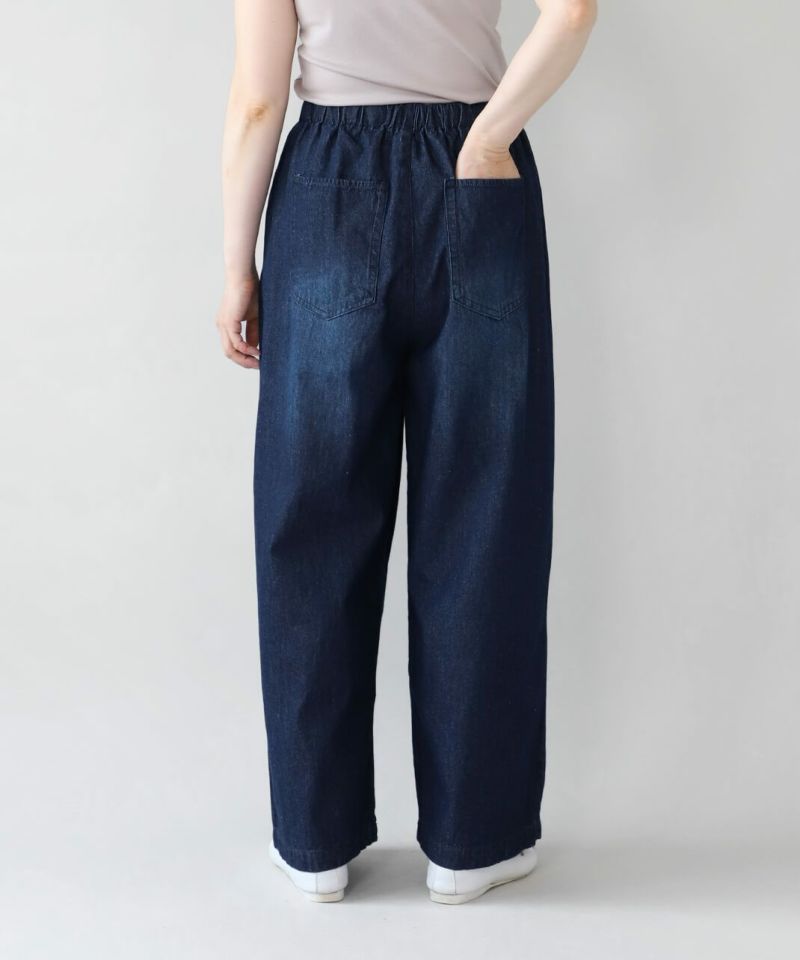 7.8オンスの甘織りソフトデニムを使用したワイドテーパードパンツです。 甘織りにすることで通常のデニムよりも柔らかくしなやかな生地に仕上げ、快適な着心地にこだわった1着です。ウエストは柔らかめのゴム仕様で内紐付き。1本タックが入ったワイドテーパードシルエットは、身体のラインを拾いにくくトレンド感のあるスタイルに。程よい色落ち加工がラフでカジュアルな印象を演出してくれます。