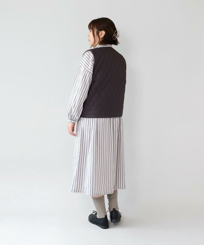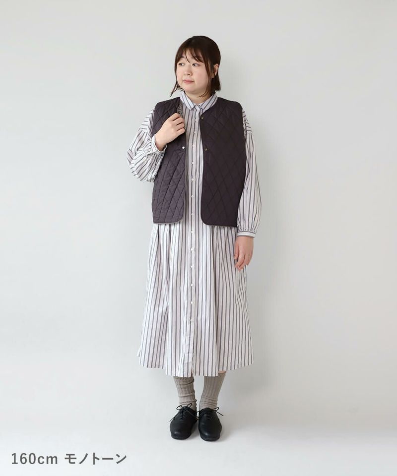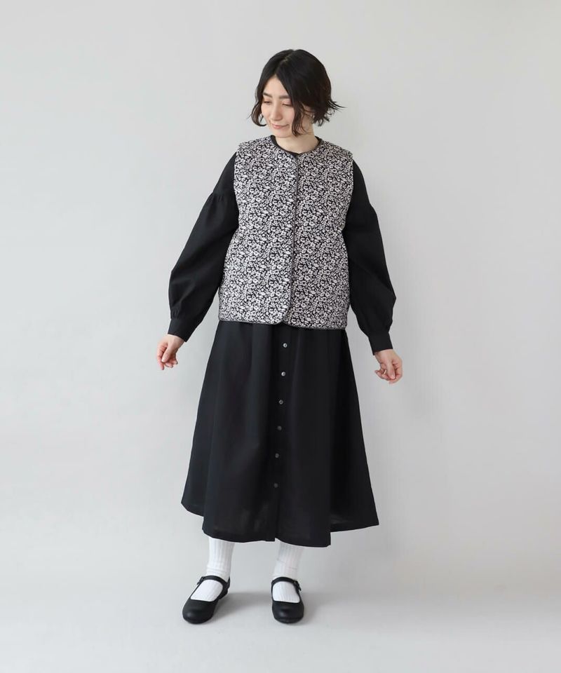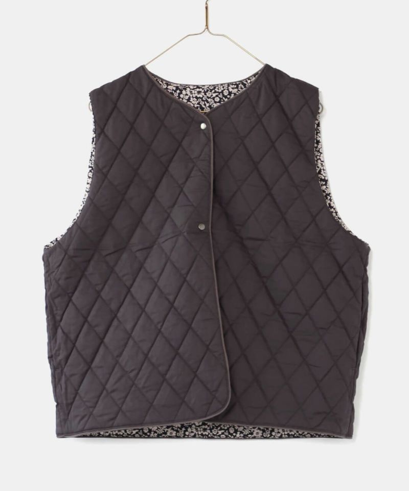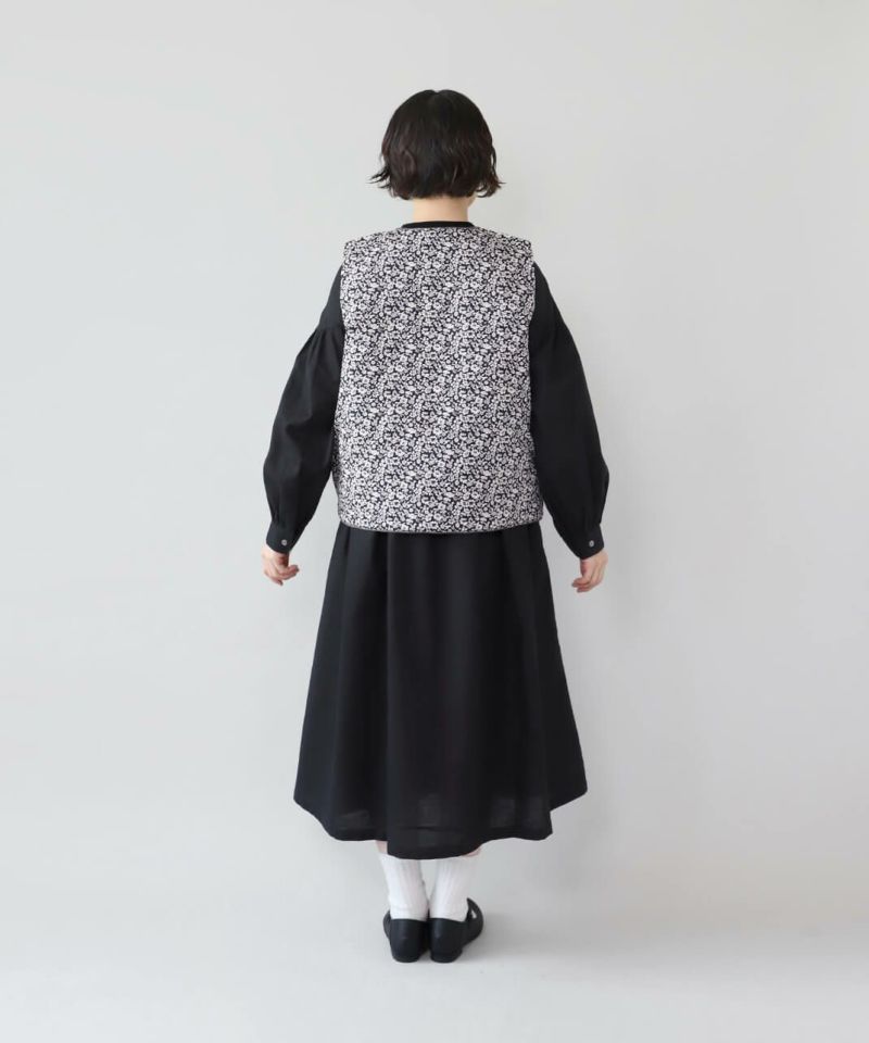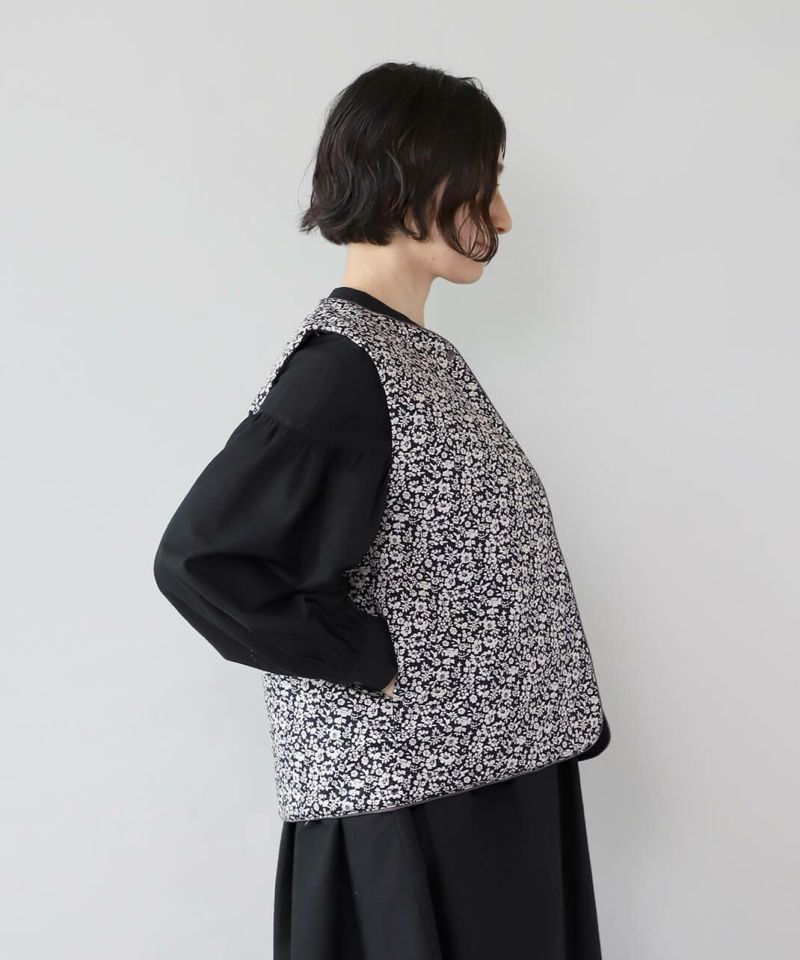 コットンブロード生地を使用した中綿リバーシブルベストです。 花柄と無地のリバーシブル仕様は、その日の気分で雰囲気をがらりと変えることが出来ます。シンプルなVネックにほどよいコンパクトなサイズ感ですっきりと仕上げました。やや広めのアームホールはインナーを問わずコーディネートの幅を広げてくれます。カットソーだけでなく、ワンピースとの合わせもおすすめです。