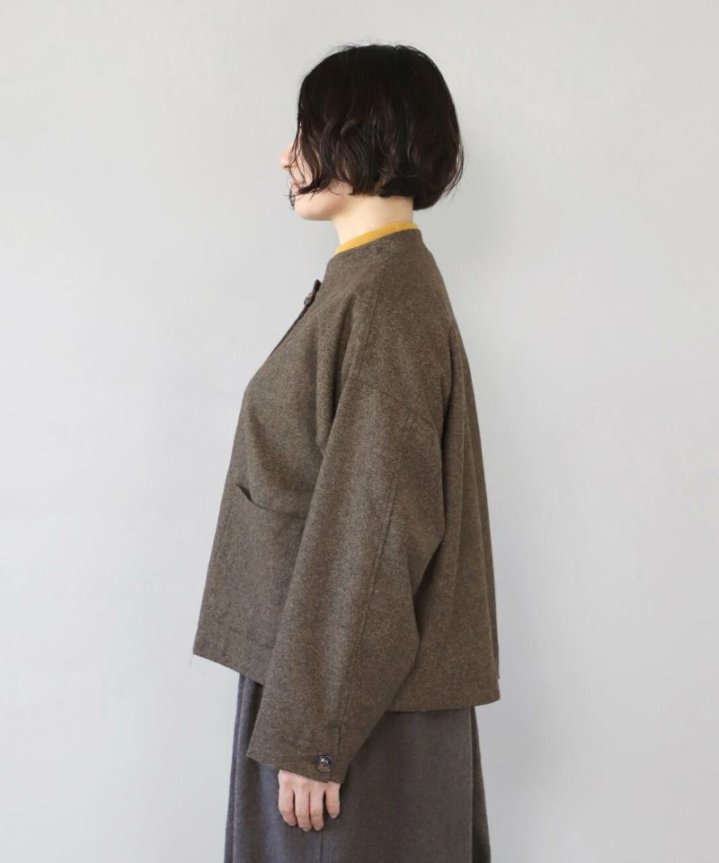 素朴で上品なツイード生地を使用したマオカラージャケットです。 適度なハリとやわらかさを持ちあわせた絶妙な風合いの1着です。 首元はマオカラーですっきりと、ワイドなシルエットでゆったりとした着心地。裏地に身頃はさらりとしたコットンを、袖には滑りのよいポリエステルが使用されています。 日常使いから、オフィスカジュアルまで幅広いスタイルに合わせやすく、1枚あると重宝します。