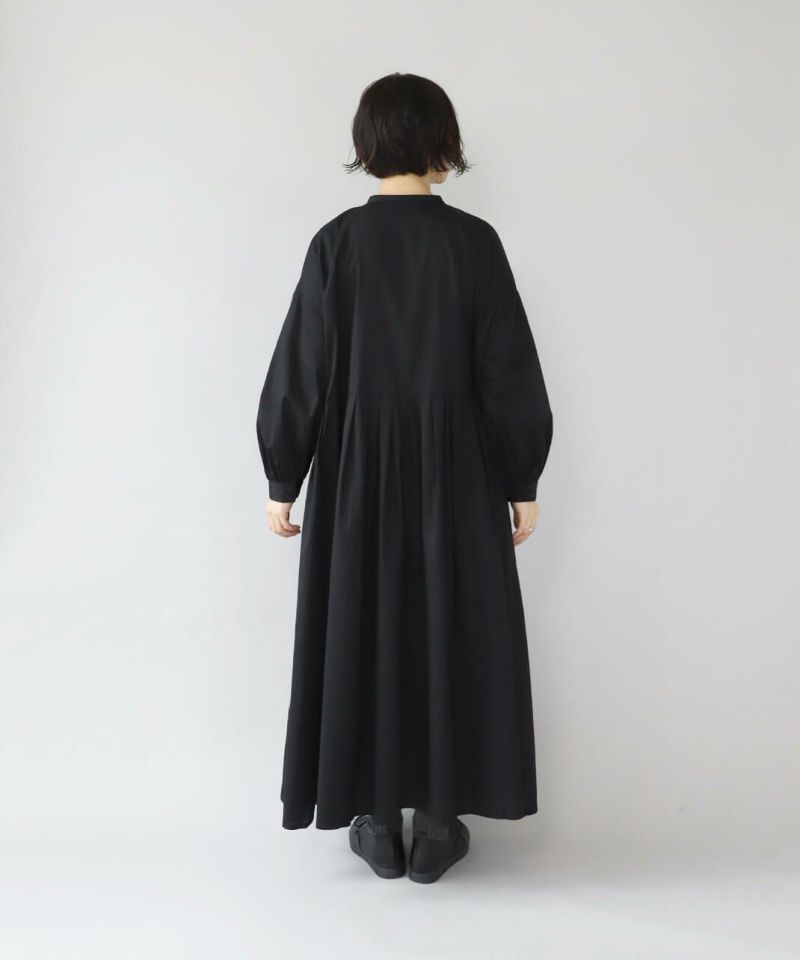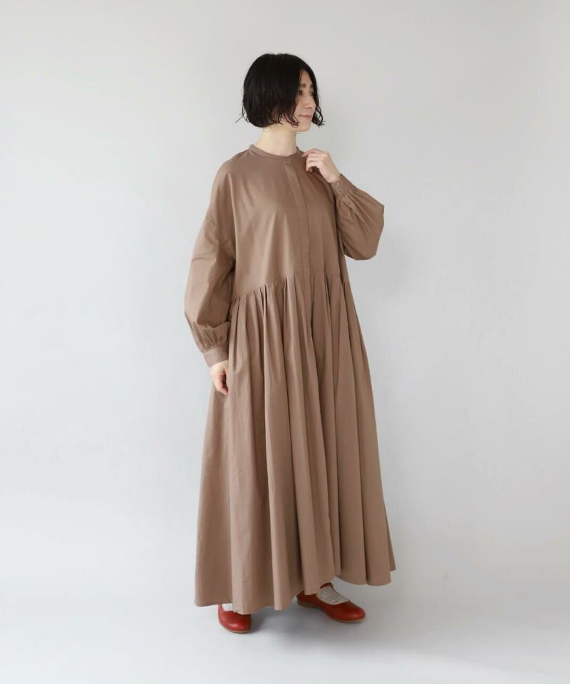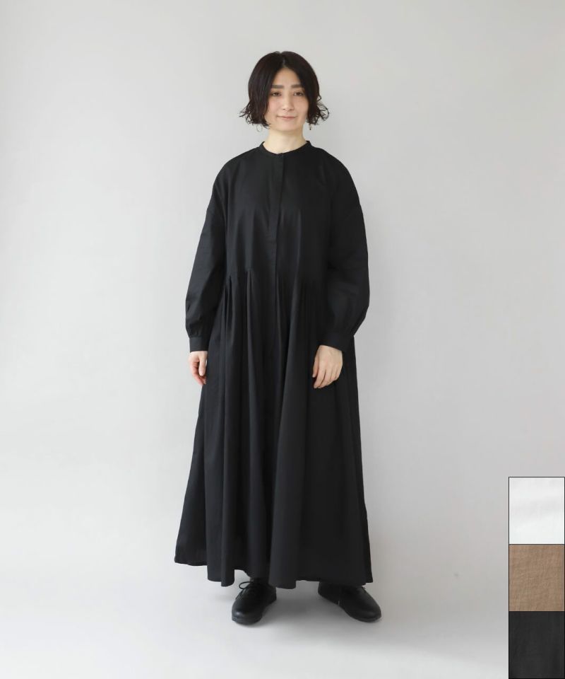 コットン素材を使用したノーカラーワンピースです。 首元はノーカラーですっきりと、ウエスト部分のたっぷりとしたタックがふんわりと広がり、シンプルでありながら可愛さを演出してくれます。 ベストやニットを重ねたり、ボトムスを合わせたり、コーディネートの幅が広がる1着です。