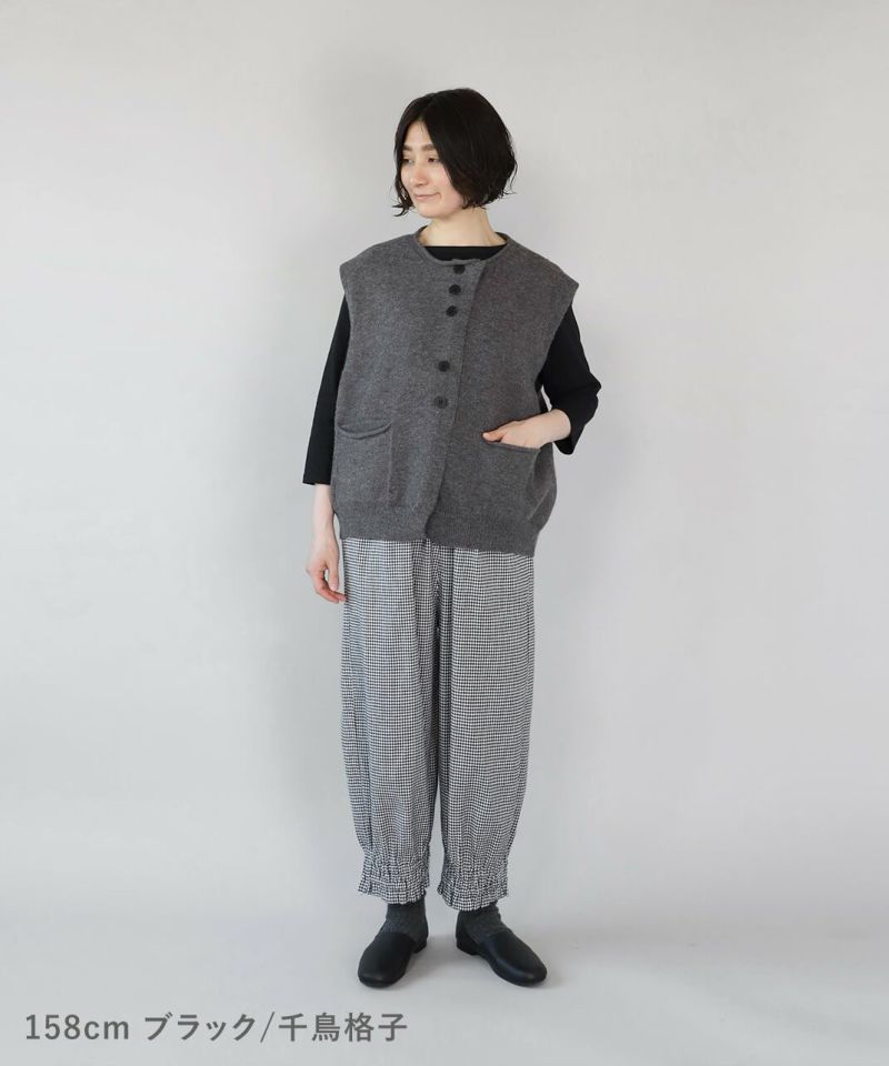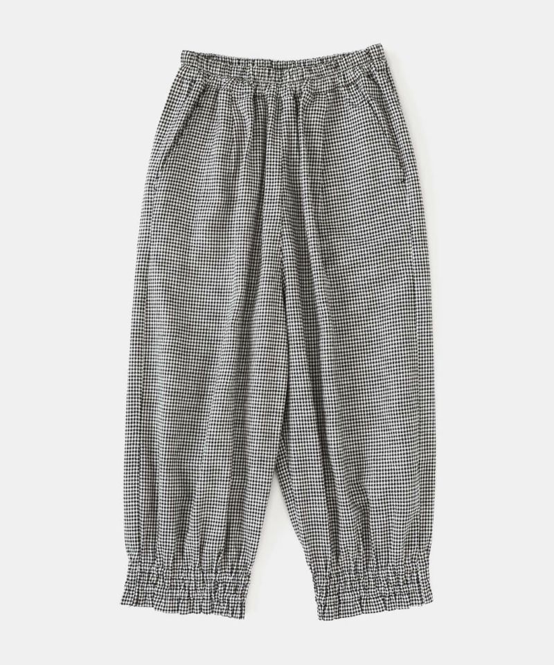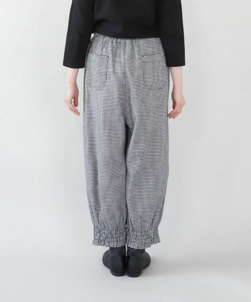 リネンと、落ち感のあるポリエステルとレーヨンをミックスした適度な厚みのツイル生地を使用したパンツです。裾にゴムシャーリングを施し、ふんわり丸みのあるサルエルシルエットの仕上がりです。ウエストはタック入りでゴム仕様のため、ゆったりリラックスした着心地。少し短めなので、もたつかず動きやすいのもポイントです。パンツとしてはもちろん、ワンピースやチュニックのぺチパンツとしてもおすすめです。丈夫でシワになりにくく日常使いに活躍します。