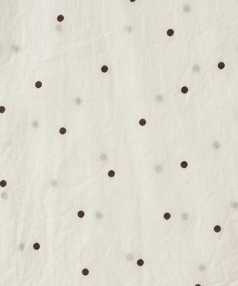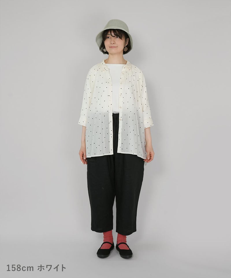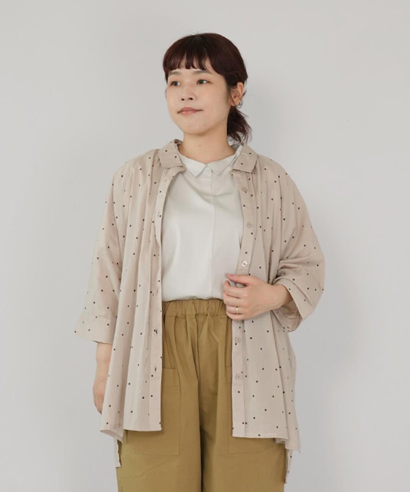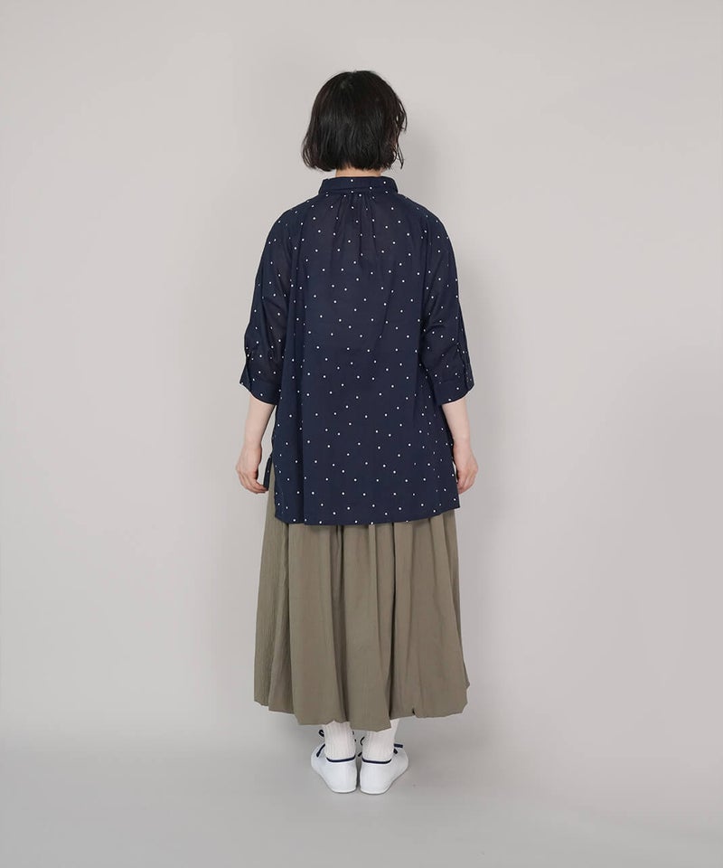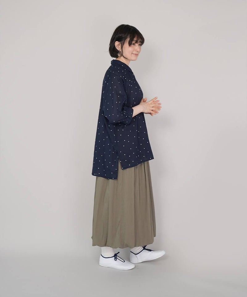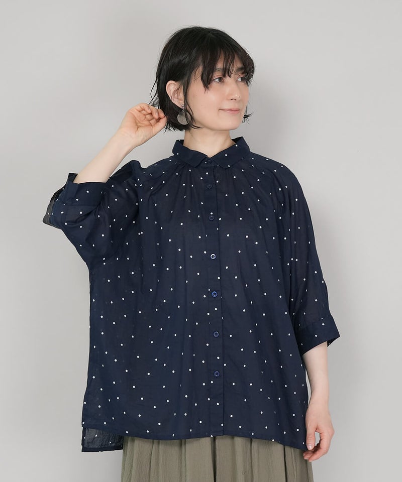 軽くてやわらかなコットンボイル生地を使用したチュニックブラウスです。やや大きめの襟とワイドな身頃、ラグランスリーブでゆったりとした着心地に仕上げました。ネックまわりに施したギャザーが、ふんわりとしたシルエットを演出。小さめのピンドット柄がコーディネートに取り入れやすく、ほどよいアクセントになります。ブラウスとしてはもちろん、軽やかな羽織りとしても活躍する一着です。