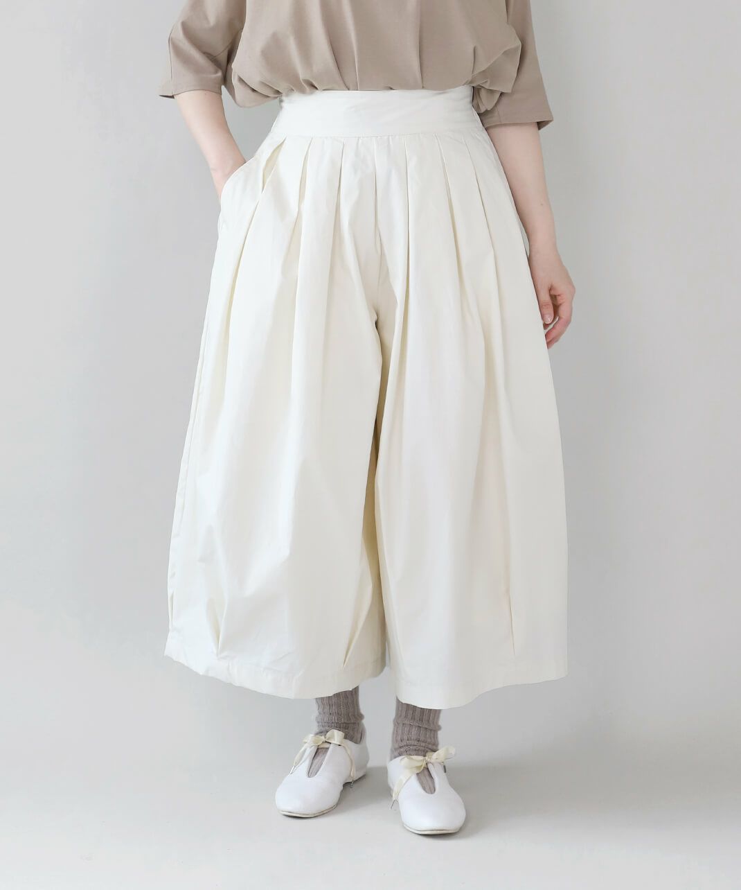 ゆったりとしたバルーンシルエットに、太めのウエスト帯と裾のタックがメリハリを効かせています。