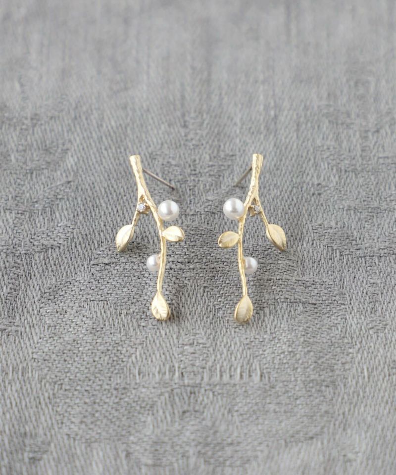3枚の葉っぱの付いたリーフモチーフにイミテーションパールやストーンがついた上品なピアスです。