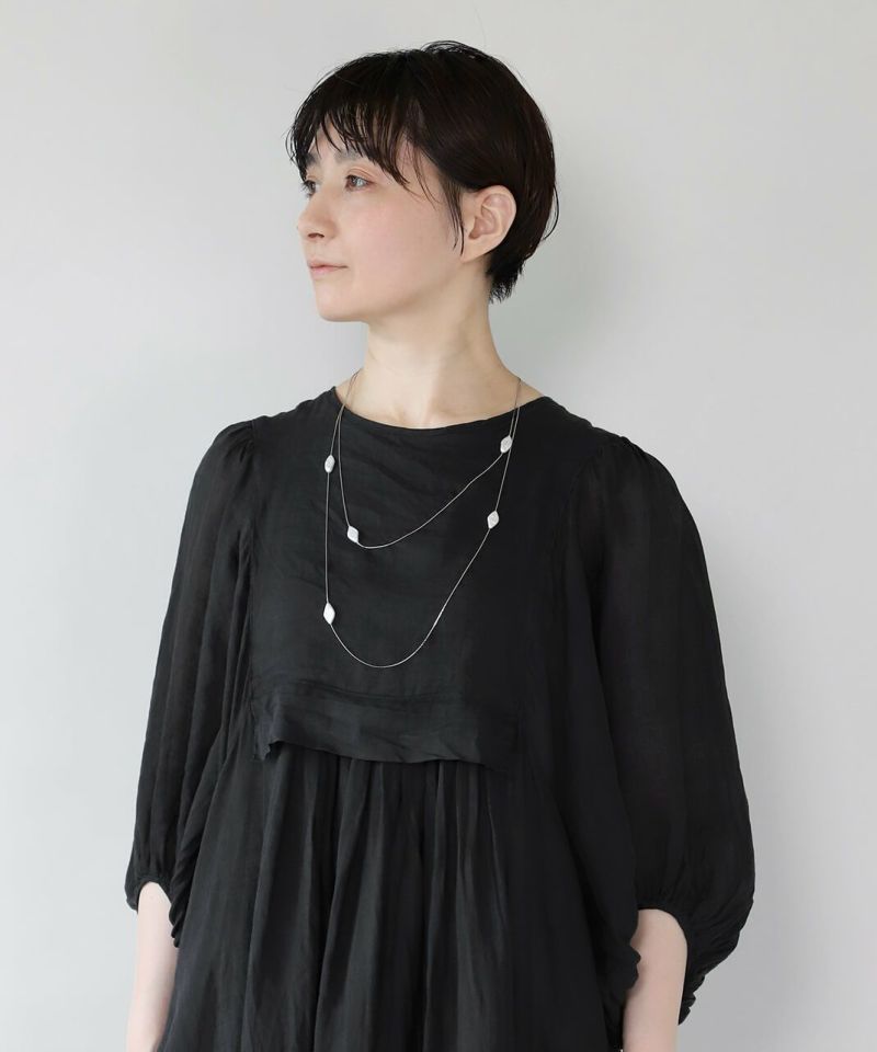 動くたびに光を反射してチェーンとパールがきらきらと輝き、首から胸元にかけてのアクセントに。