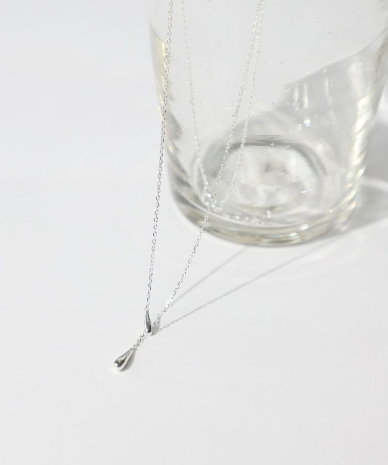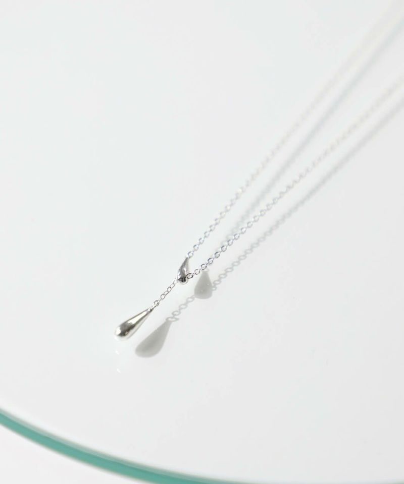 一方の雫型パーツにチェーンを通したデザインで、スライドすることで長さ調整が可能。