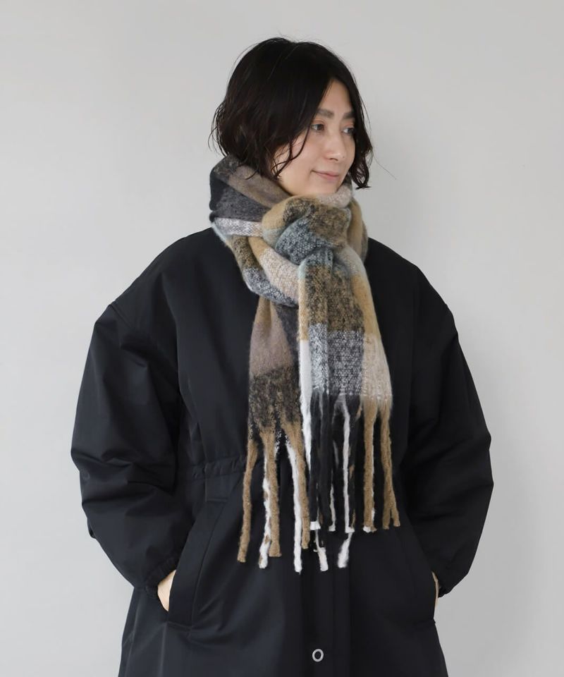 ふんわりとしたボリューム感が魅力のチェックストールです。 柔らかく起毛した素材が首元をやさしく包み込み、冬の冷たい風からしっかりと守ってくれます。 大判サイズのため巻き方のアレンジがしやすく、肩に掛けてショールのようにもお使いいただけます。 色がくっきりしすぎず、やわらかくにじむようなチェック柄がポイントです。 主張しすぎない落ち着いたデザインなので、どんなスタイルにも自然と溶け込みます。