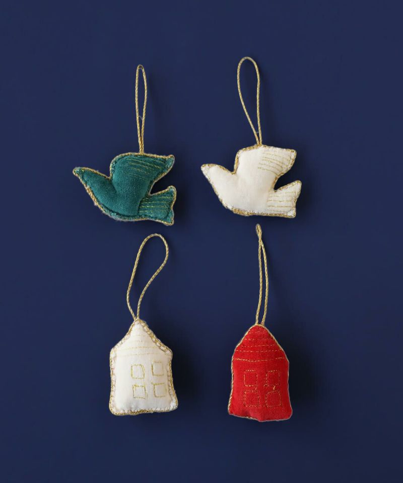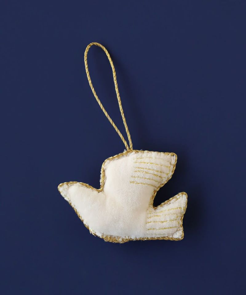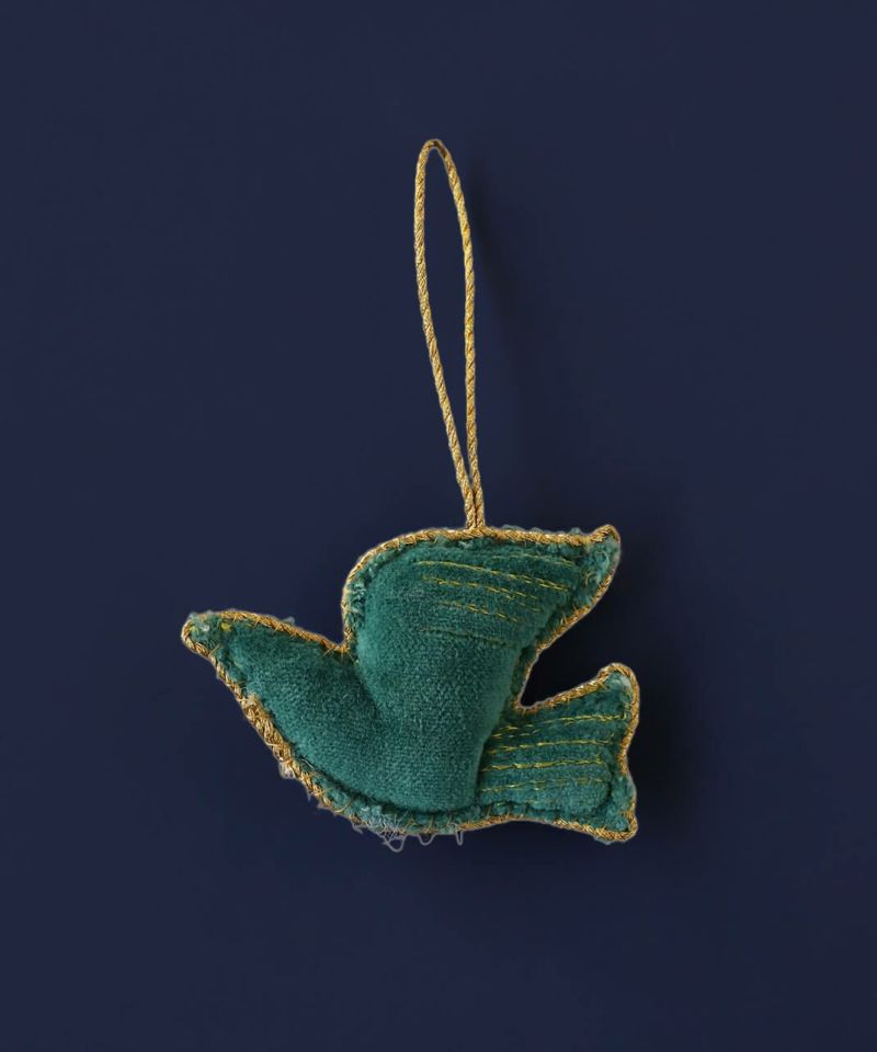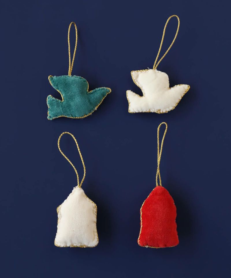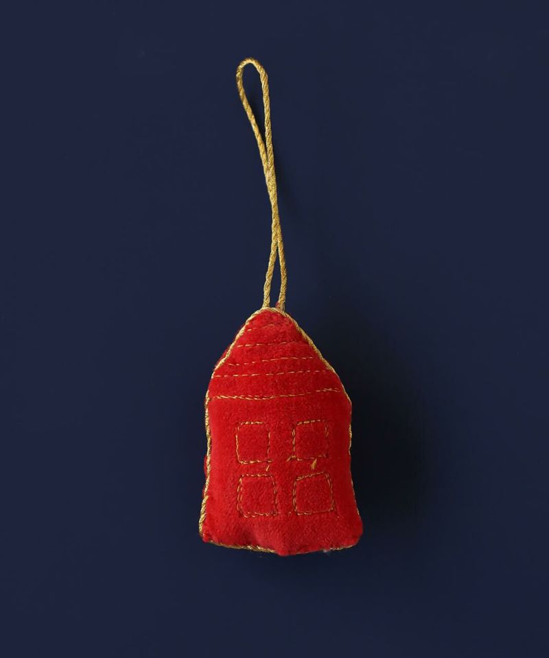ベルベットコットンの生地がかわいいオーナメントです。立体感のあるオーナメントは存在感があり、ツリーがパッと華やかに。程よい光沢のベルベットコットンの生地にゴールドのステッチを施し、金糸のツイストコードを縁に縫い付けて可愛くなりすぎないデザインになっています。