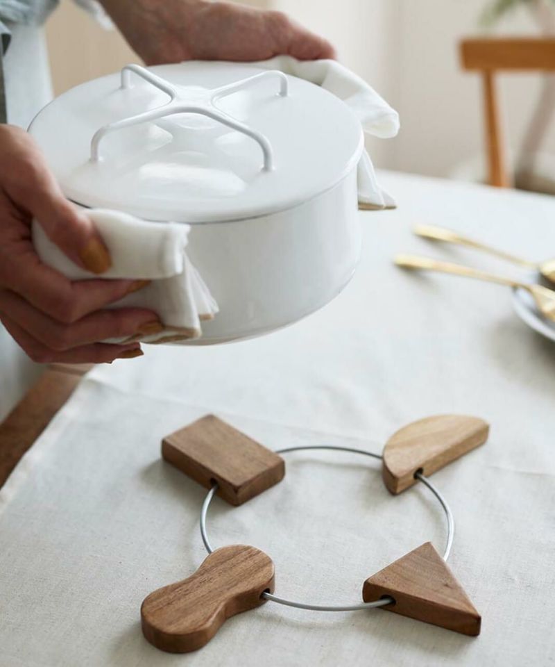 アルミと木を組み合わせた温かみある素材で作られた鍋敷き。内側に倒せばコンパクトに、外側に倒せば大きくなるので、鍋や器のサイズに合わせて使えるのがポイント。一つ一つ形が異なるモチーフがキッチンに温かみと遊び心を加えます。使わないときはリングに引っ掛けて簡単に収納でき、空間をスッキリ保てます。おしゃれで機能的なアイテムは、ダイニングやキッチンのアクセントにもぴったりです。