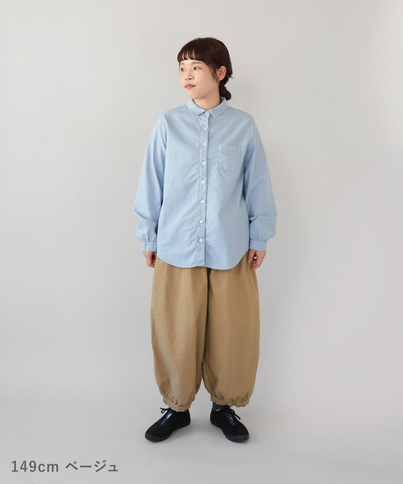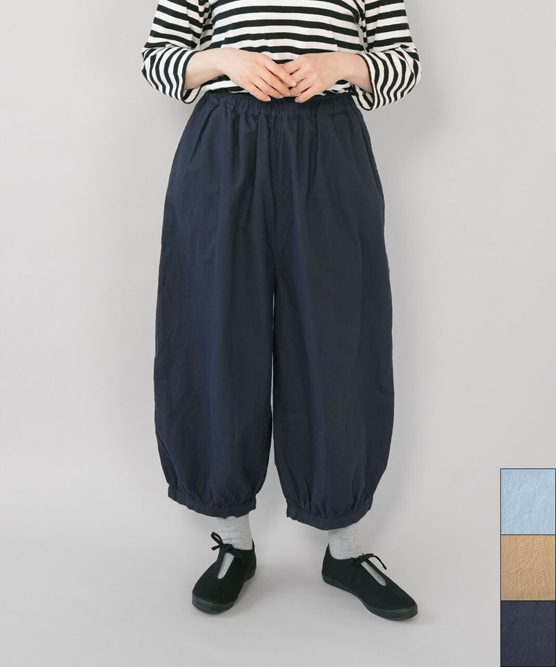 さらりとした肌ざわりで、やわらかなオックス生地のパンツです。国内の職人の手で、製品染めに。奥行きのある表情に仕上がっています。裾にはさりげなくギャザーを入れて、丸みのあるシルエット。立体感がありながらもシンプルなデザインです。ウエストはゴム仕様で、締めつけ感も少なくリラックスしたはき心地。1枚でパンツとしてはもちろん、ワンピースやスカートの下に合わせるペチパンツとしてもおすすめです。