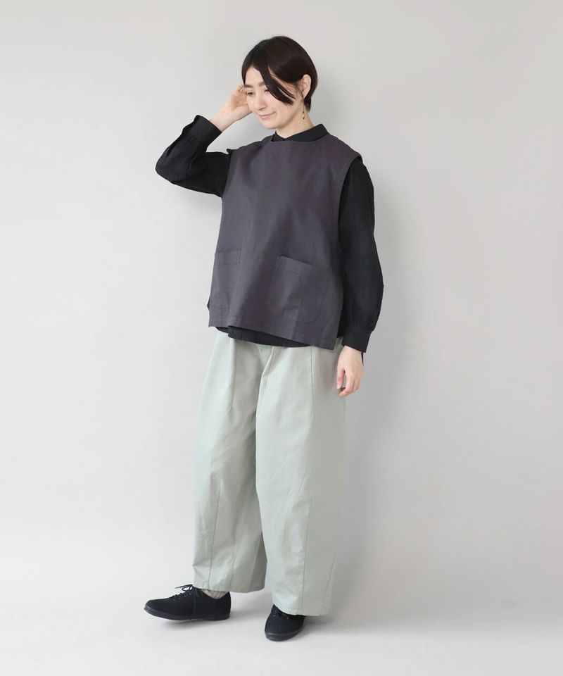 立体的なバルーンシルエットがきれいなタックパンツです。 ウエストのドロストコードでフィット感を調整することができ、スタイリッシュなデザインに。シルエットをキープするやや厚みが感じられるしっかりとした丈夫な素材を使用し、裾のダーツが身体のラインを拾いにくいバルーンシルエットのデザインになっています。デイリー使いに重宝する1着です。