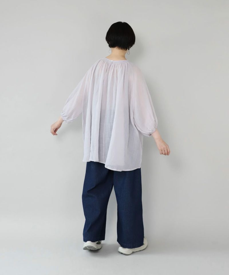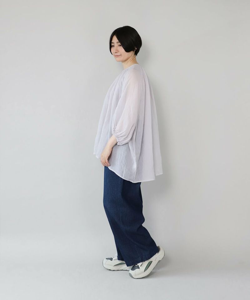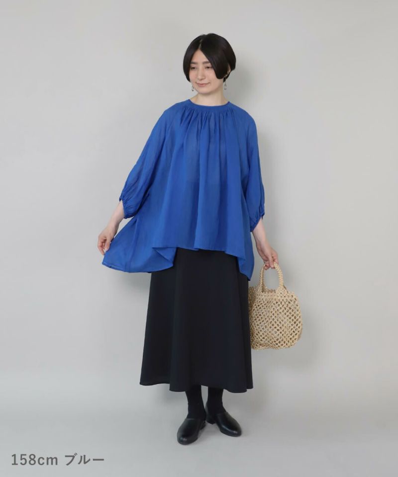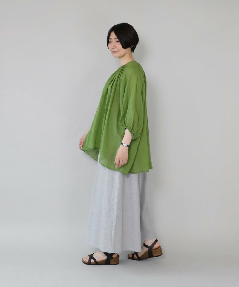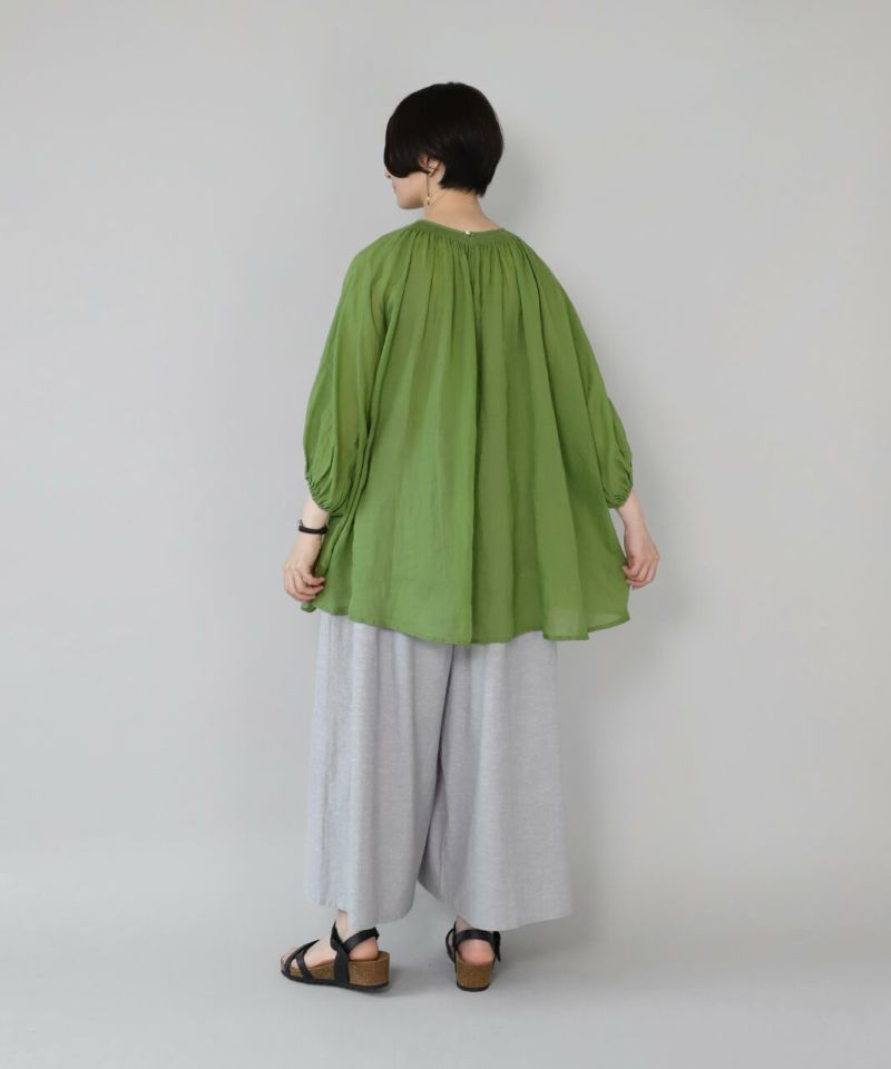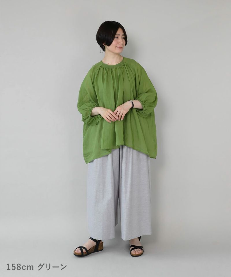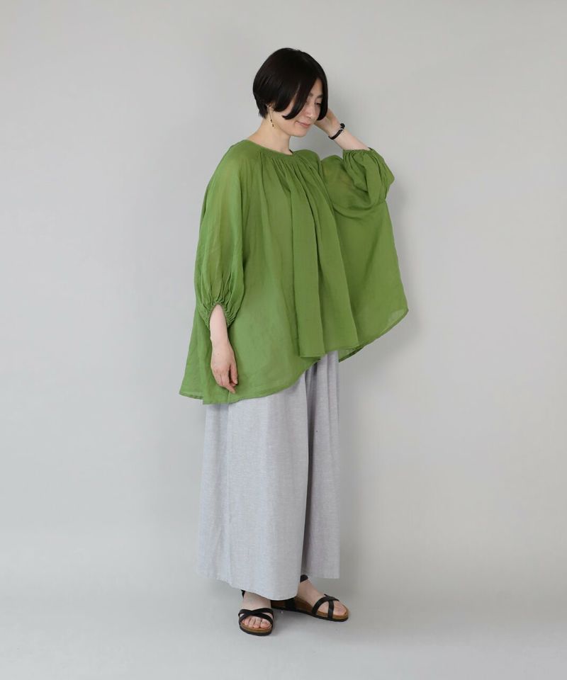 天然素材の風合い豊かなラミーリネンを使用したシャーリングギャザーブラウスです。 ほのかにシャリ感を持ったドライな生地は通気性が良く吸水性も高いため、これからの季節にぴったりです。シンプルなクルーネックのフロントに繊細なシャーリングを施し、ふんわりと肌離れの良いゆったりとしたシルエット。気になる体型もカバーしてくれます。袖先はゴム仕様で丈の調節がしやすく、実用性にも優れています。シアー感と動くたびにゆらゆら揺れるシルエットが大人の女性の雰囲気を演出してくれます。