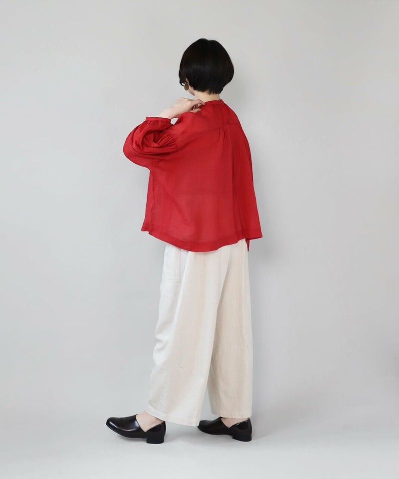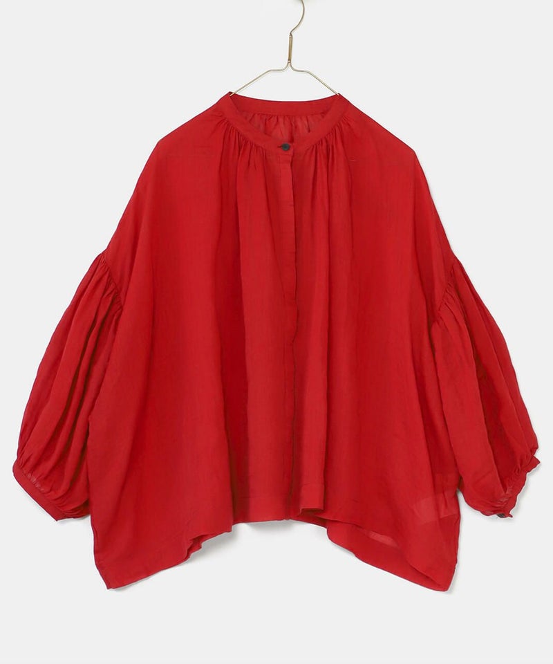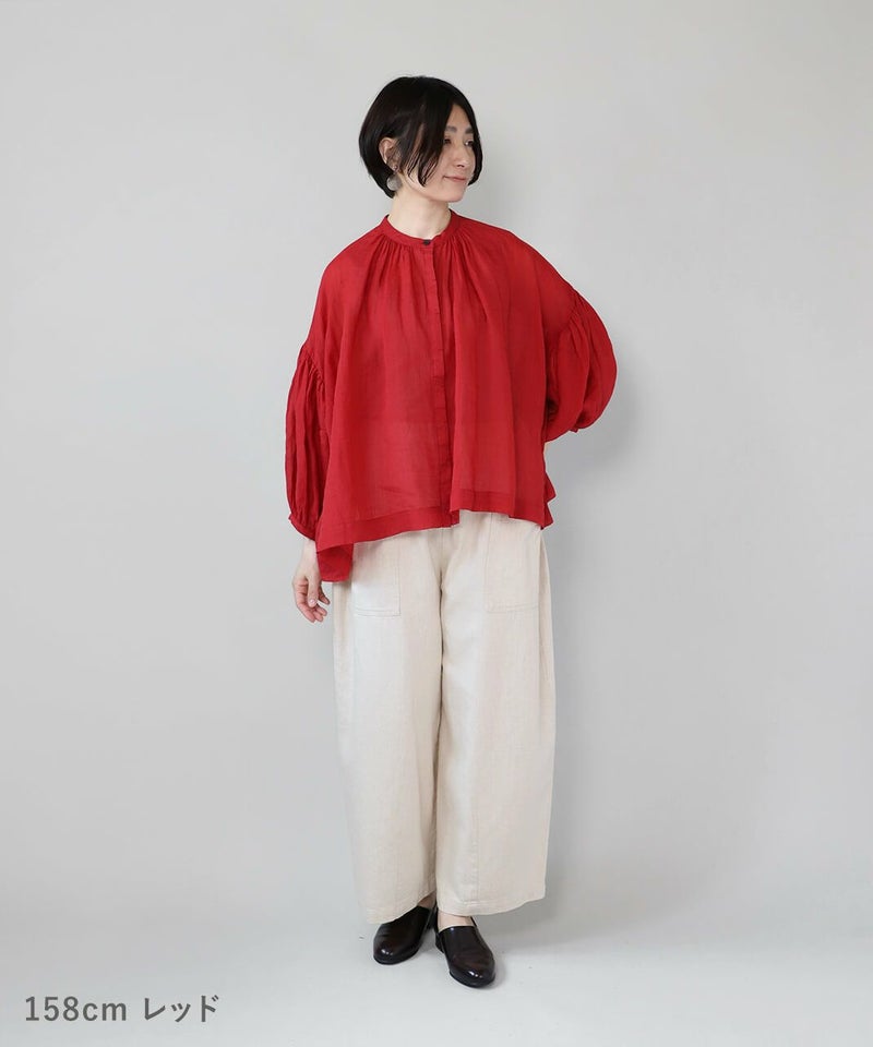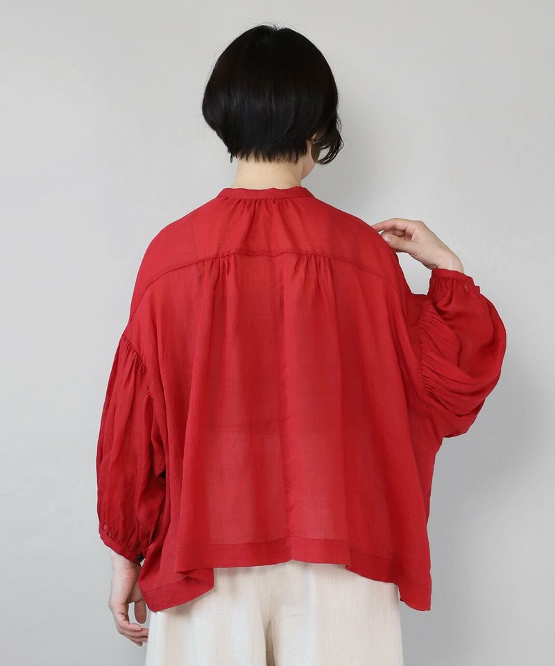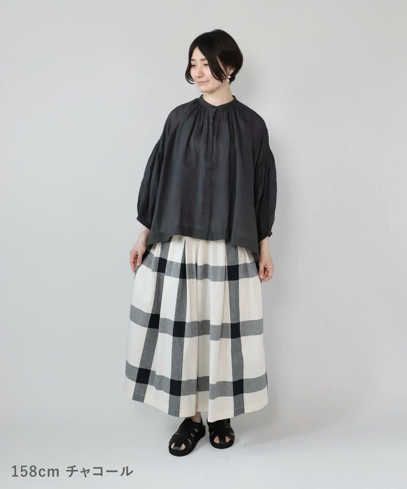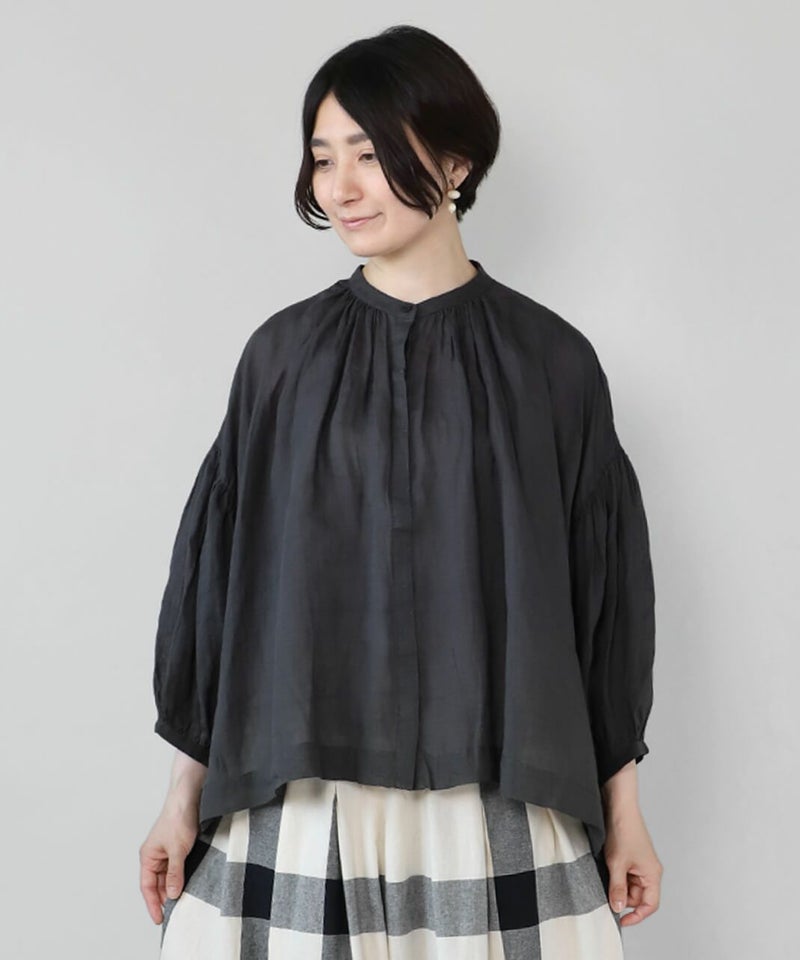 ネック周りにたっぷりとギャザーを寄せたデザインが、自然なふくらみと落ち感を生み出し、 着るだけでふんわりと優しい印象に仕上がります。
