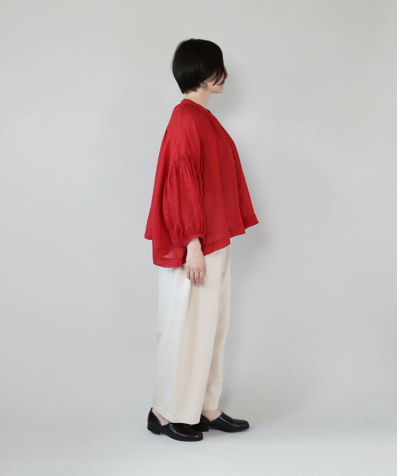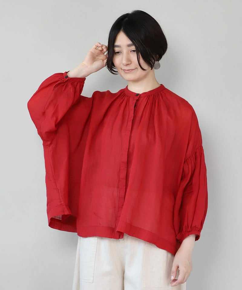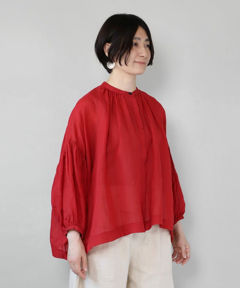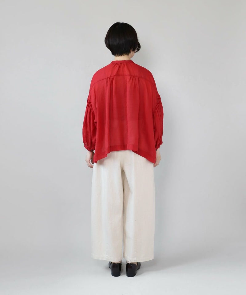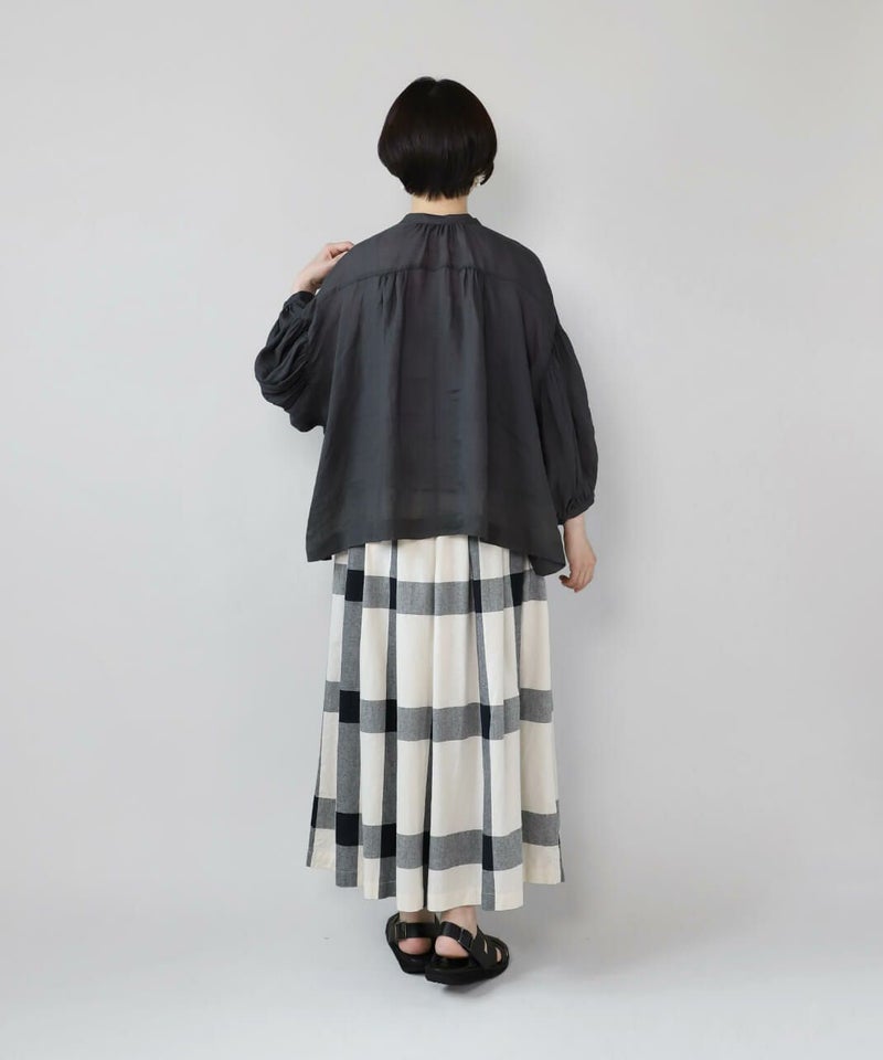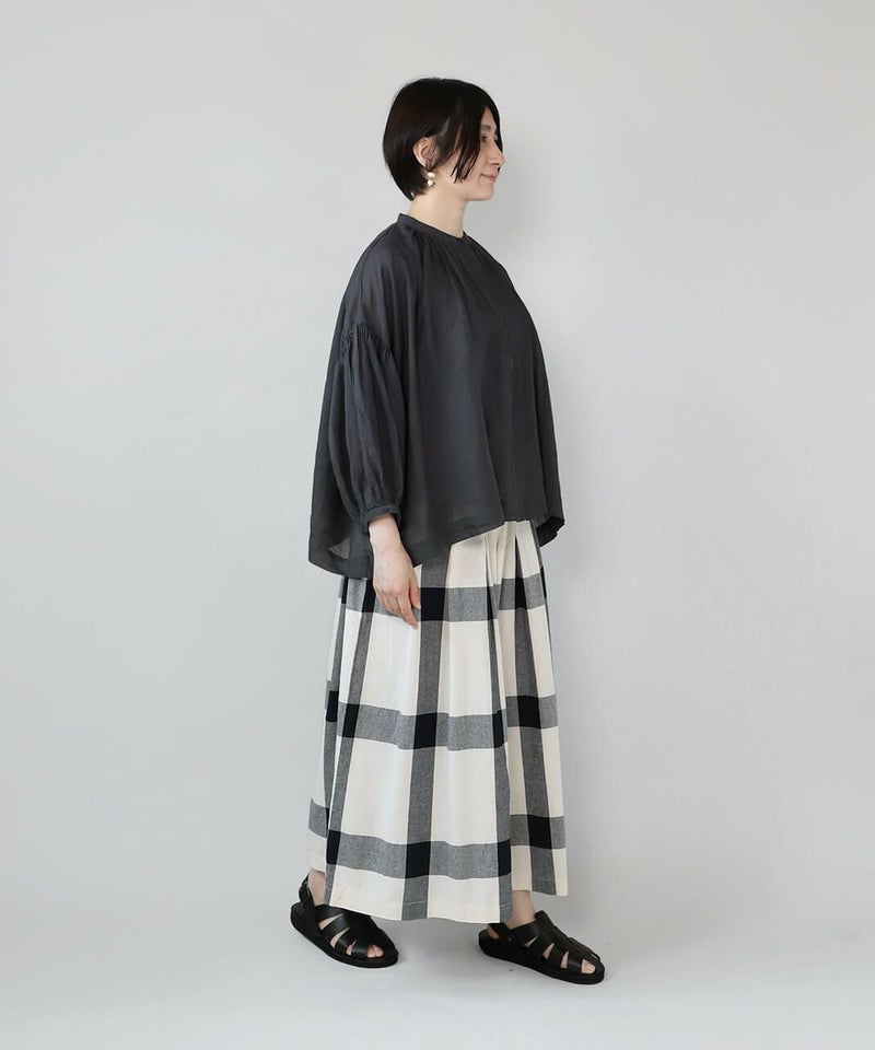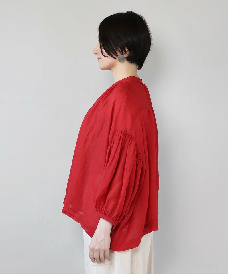 ネック周りにたっぷりとギャザーを寄せたデザインが、自然なふくらみと落ち感を生み出し、 着るだけでふんわりと優しい印象に仕上がります。