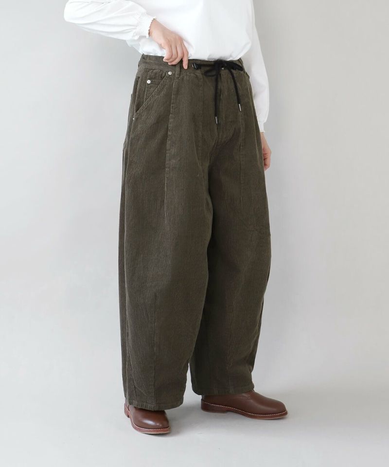 上質なコットンコーデュロイ生地を使用したタックバルーンパンツです。 ウエストと裾のダーツがボールの様な立体的なシルエットの1着。ゆったりとしたウエストはドローコードタイプの紐でジャストサイズに調整可能です。リラックスしたサイズ感は足のラインを拾わず、トップスとのバランスも取ってくれます。