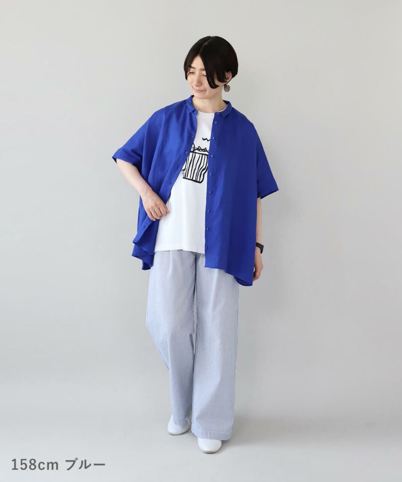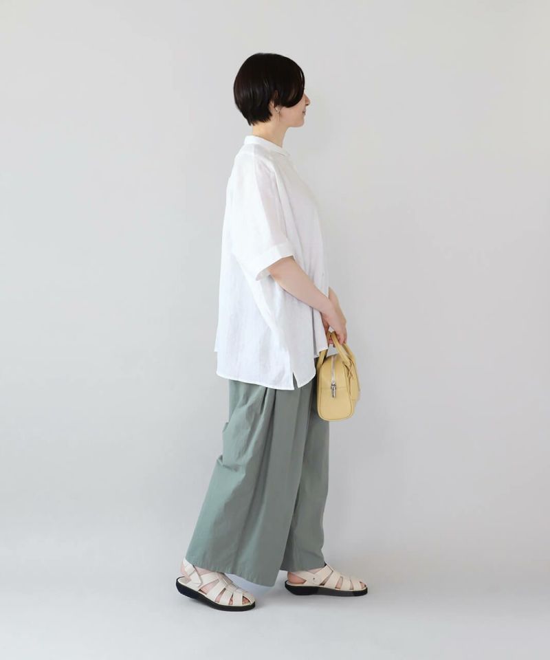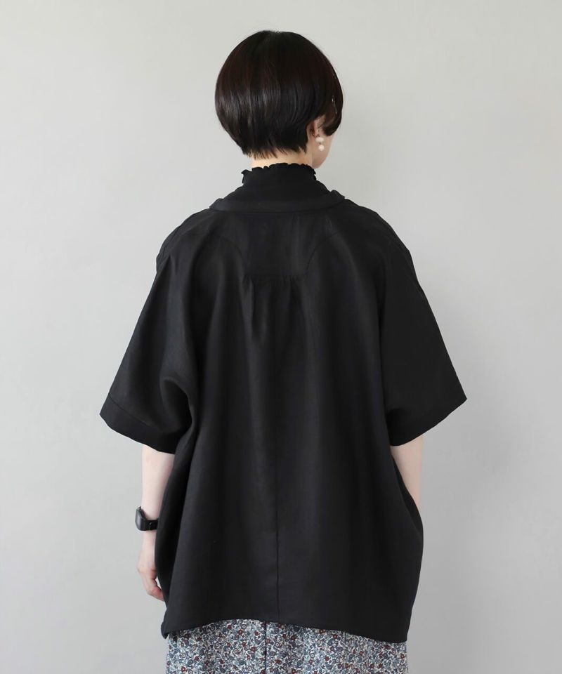 やや光沢のあるリネンを使用した小さな襟のワイドブラウスです。 ワイドなボックスシルエットでゆったりとリラックスした着心地。同じリネン生地のくるみボタンを使用しています。肩周辺の切替えは身体に沿うようにデザインされています。シンプルながら洗練されたナチュラルな雰囲気を演出してくれます。 きれいなシルエットなので、羽織りとしてもおすすめです。