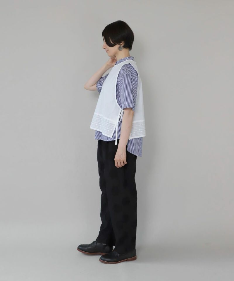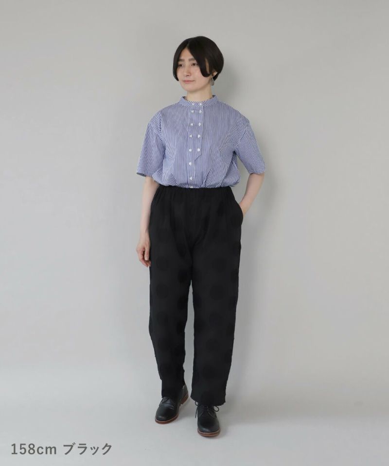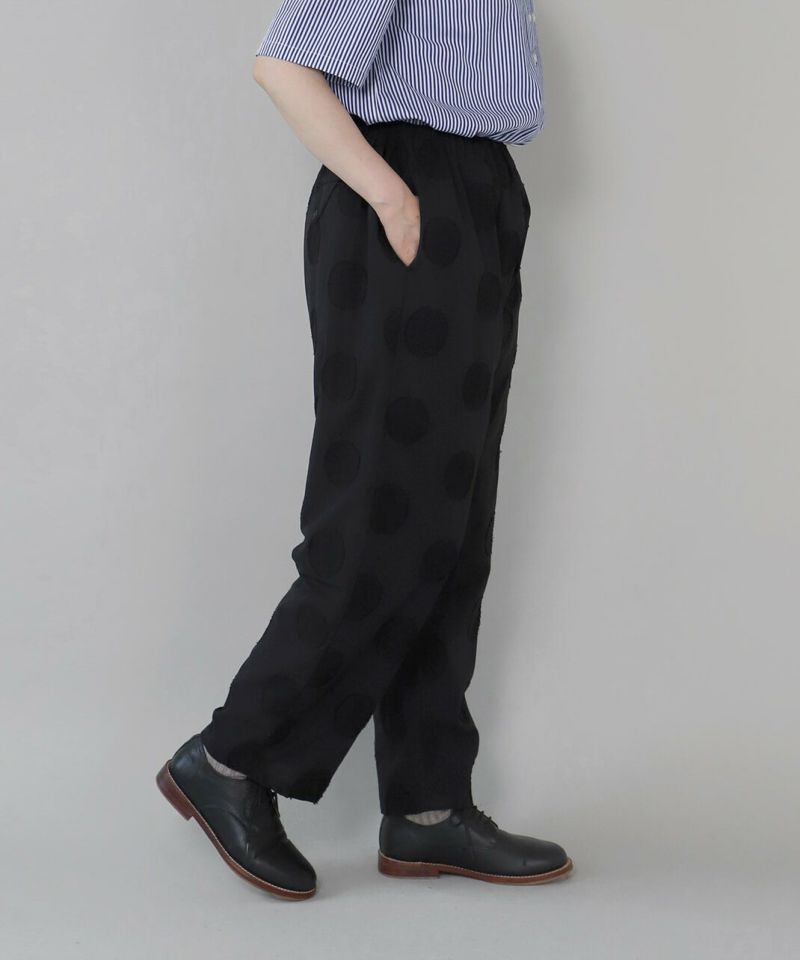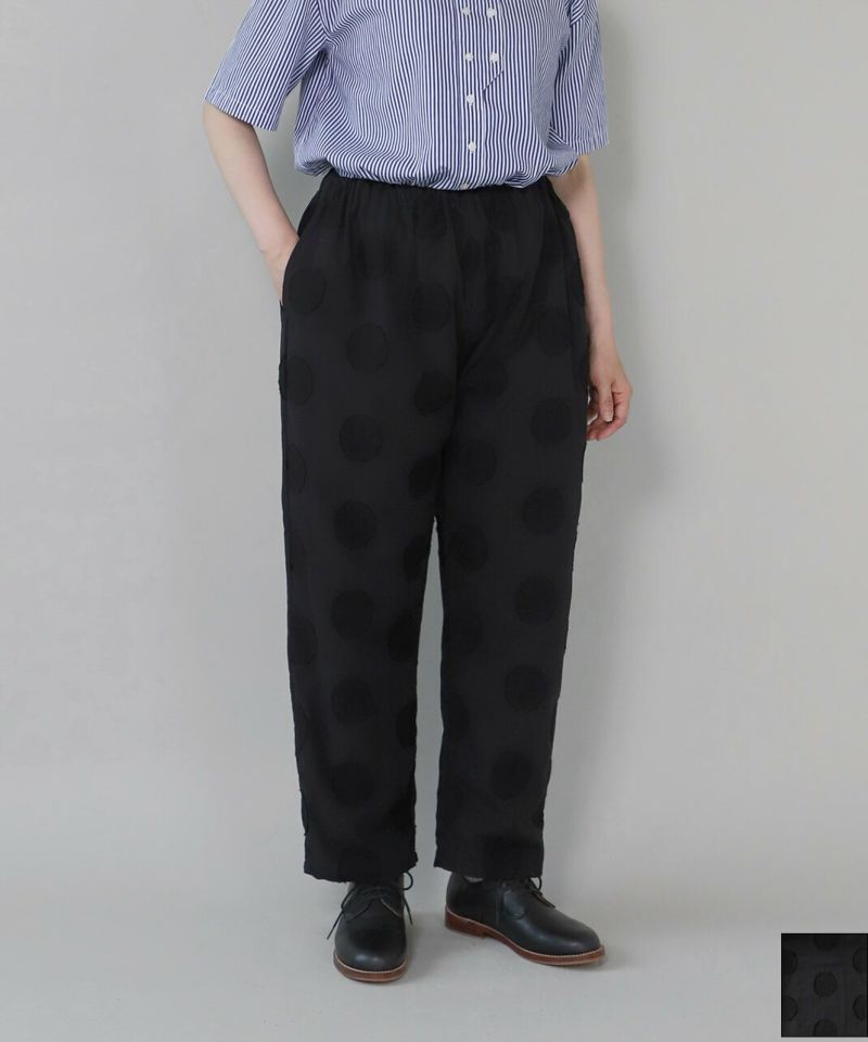 コットンリネンのドットジャガード生地を使用したテーパードパンツです。 ウエストはたっぷりとゴムが入ってよく伸び、さらに内紐付きのためサイズ調整が可能。リラックスした履き心地です。裏地もしっかりと付いているため透ける心配もありません。同色のドットジャガードはコーディネートしやすく、シルエットもとてもきれいな1着です。