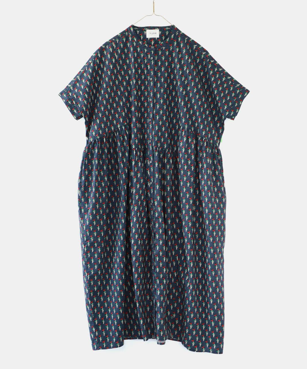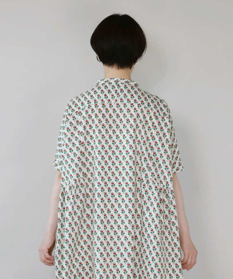 ほどよいハリのあるコットン素材を使用したワンピースです。 シンプルなスタンドカラーですっきりと、フロントと脇にギャザーの切替えが入ったふんわりシルエット。ドルマンスリーブがさらにゆったりとした着心地に。目を惹くボタニカル柄はコーディネートの主役になります。ワンピースとしてはもちろん、羽織りとしての着用もおすすめです。