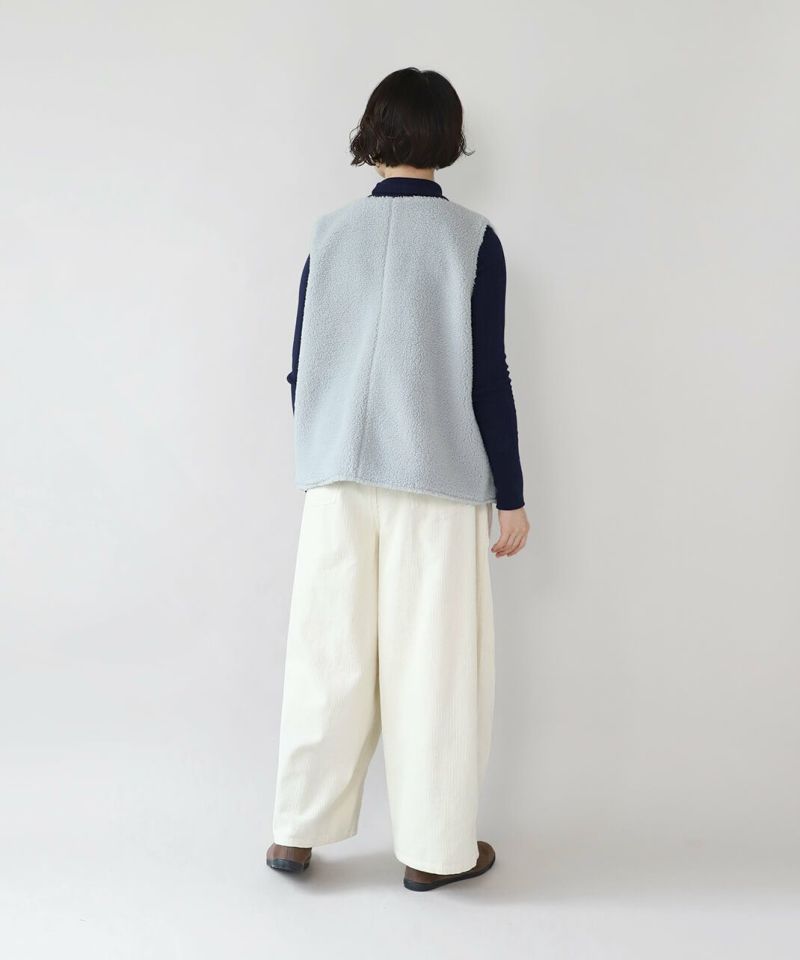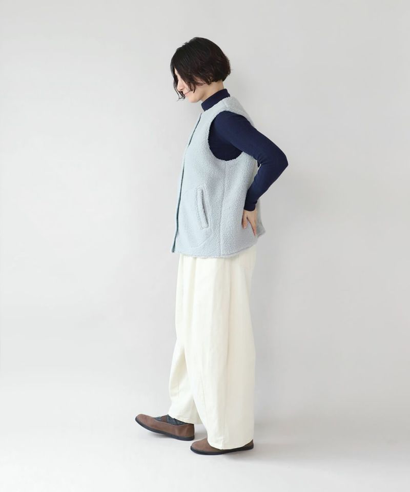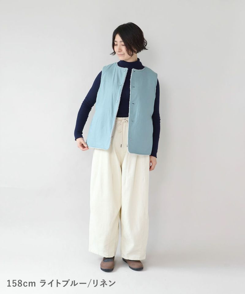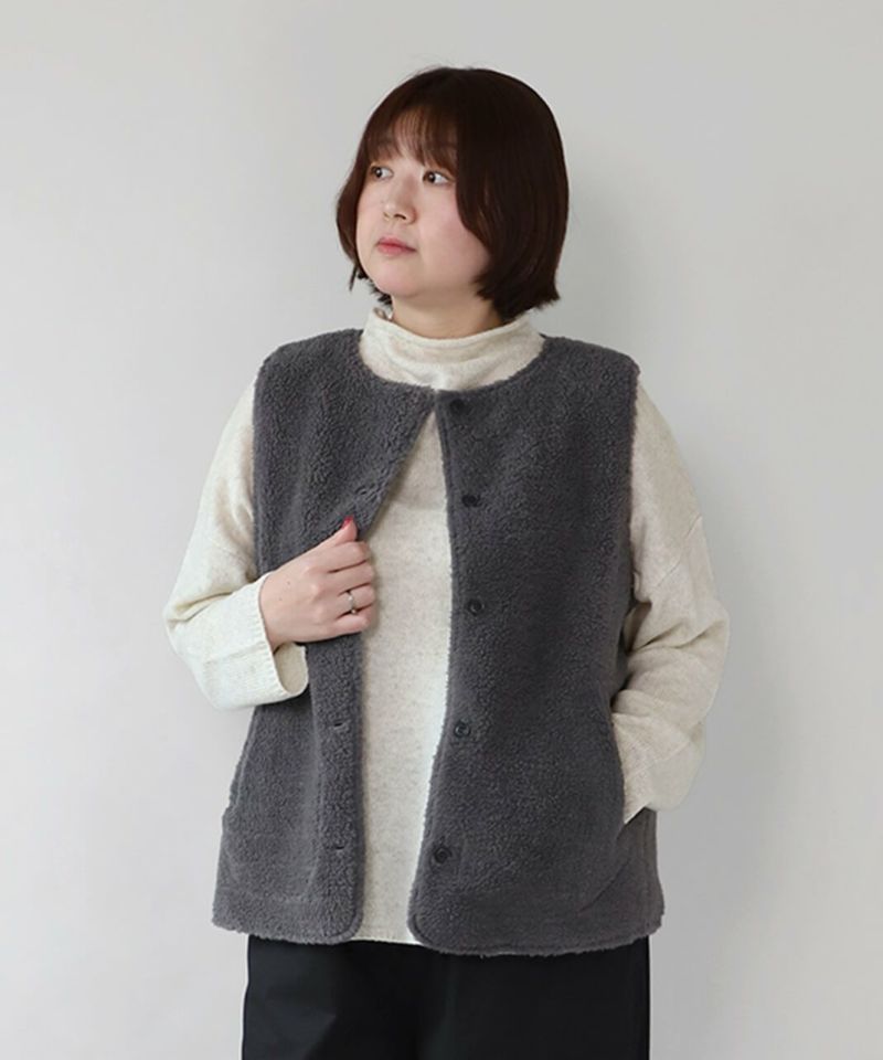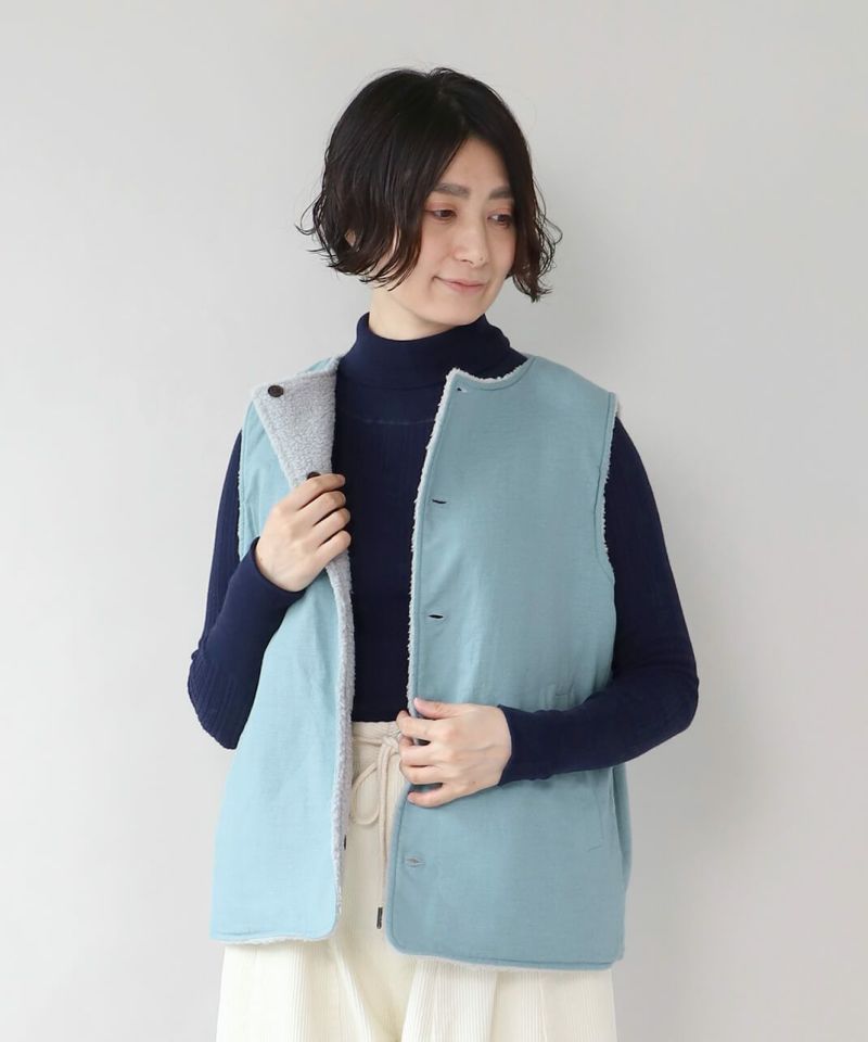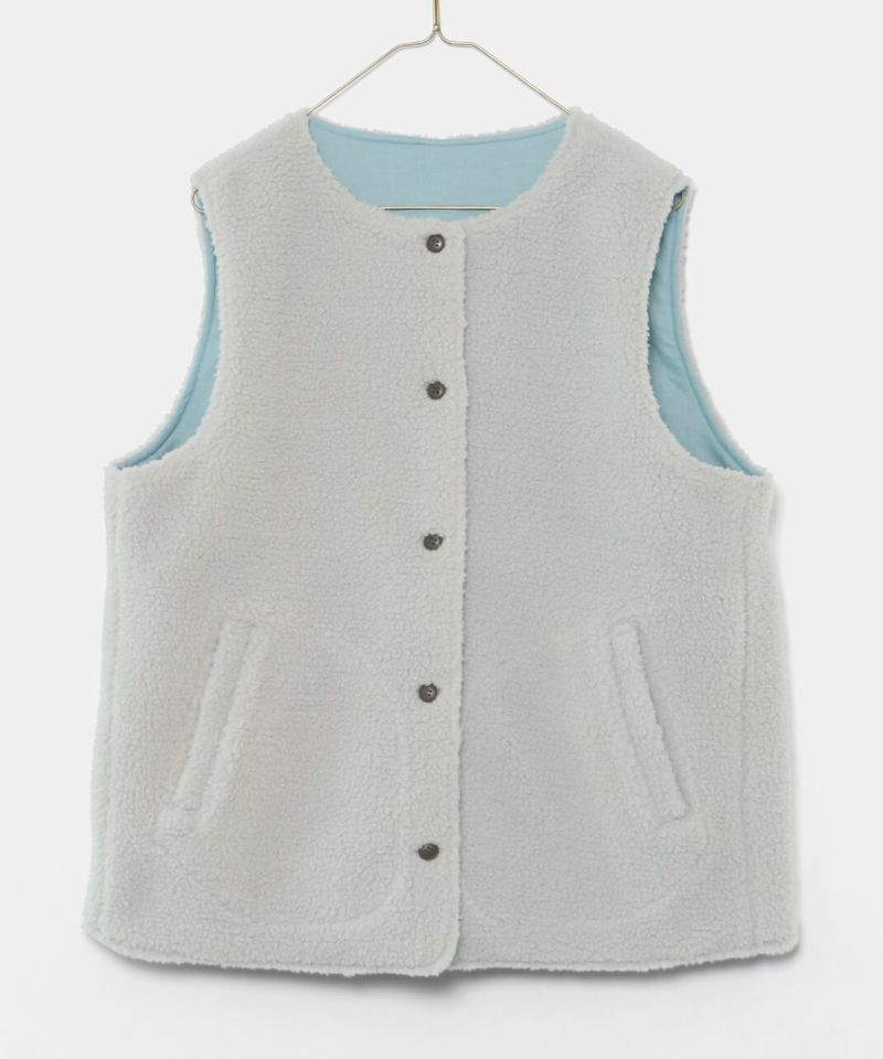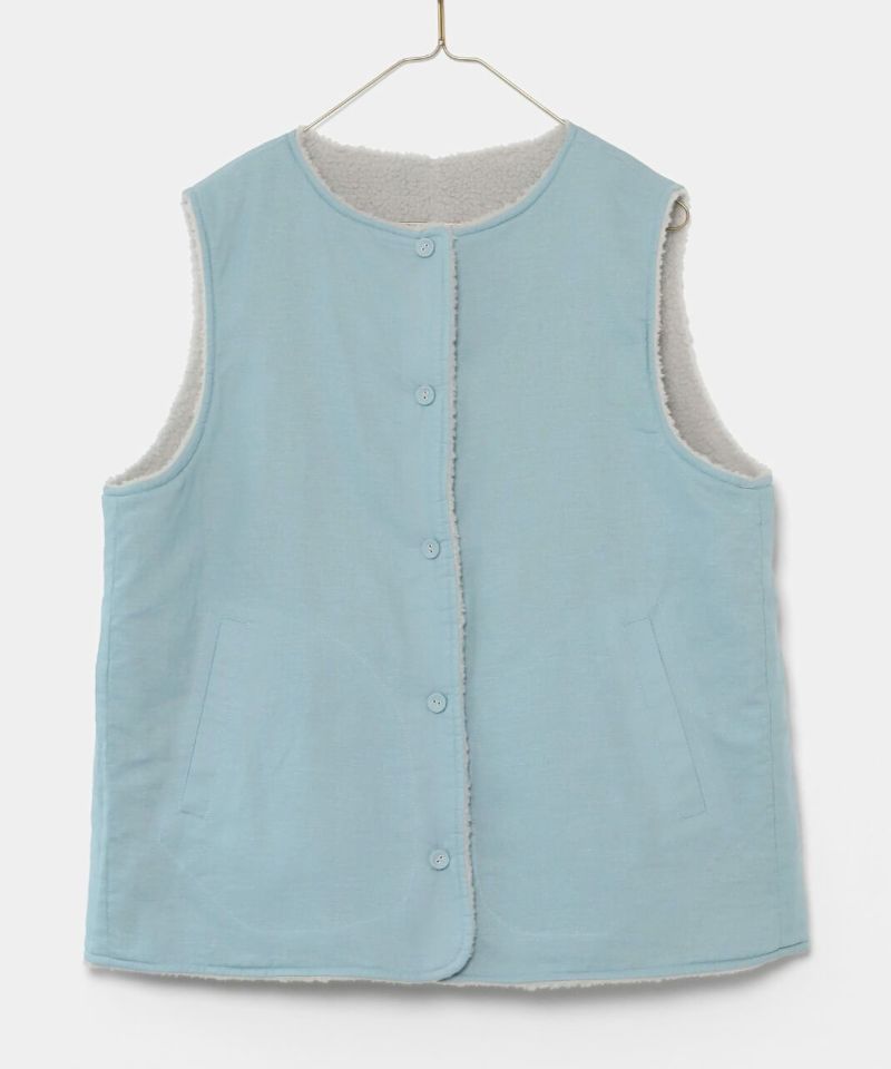 暖かいボアとコットンリネンを使用したリバーシブル2WAYベストです。 シンプルなデザインに加え、ボアとコットンリネンのそれぞれの面の表情が異なるので幅広いコーディネートを楽しめる1着です。ボタンも雰囲気に合った素材を採用。ほどよいボリューム感と軽いのに着膨れしないのも嬉しいポイントです。 アウターとしても、コートのインナーとしても活躍してくれ、ちょっと肌寒い室内でも活躍してくれる万能アイテムです。