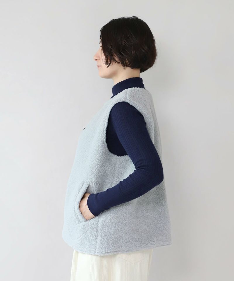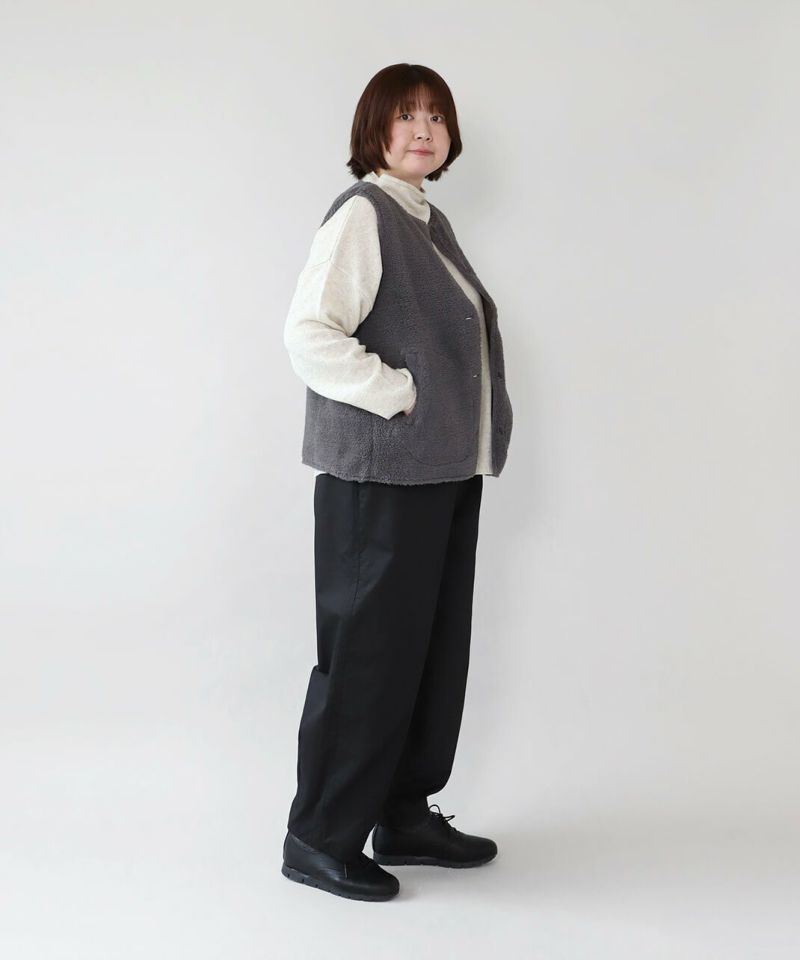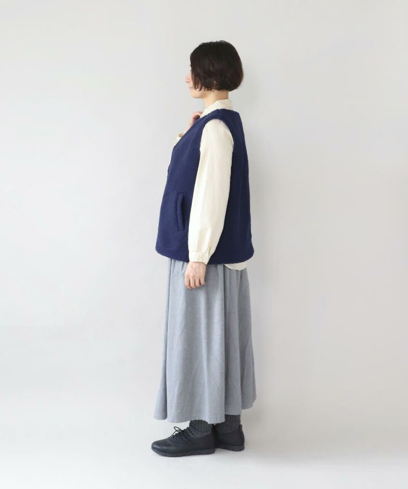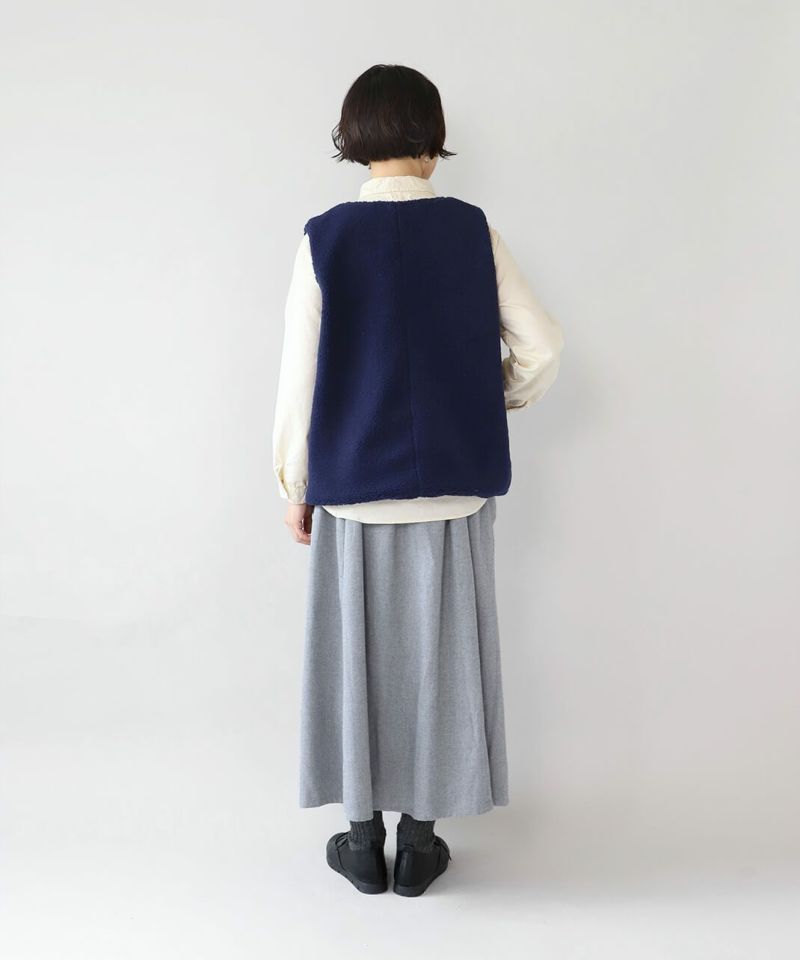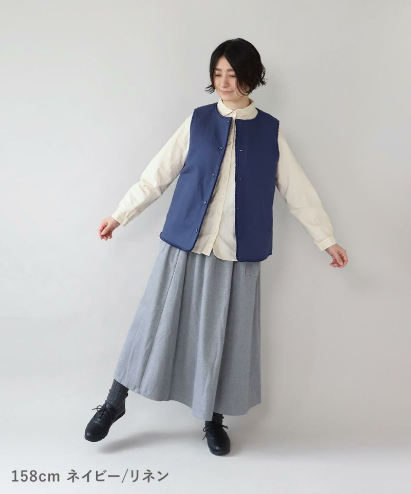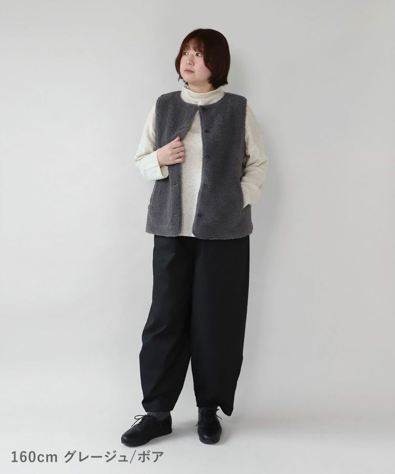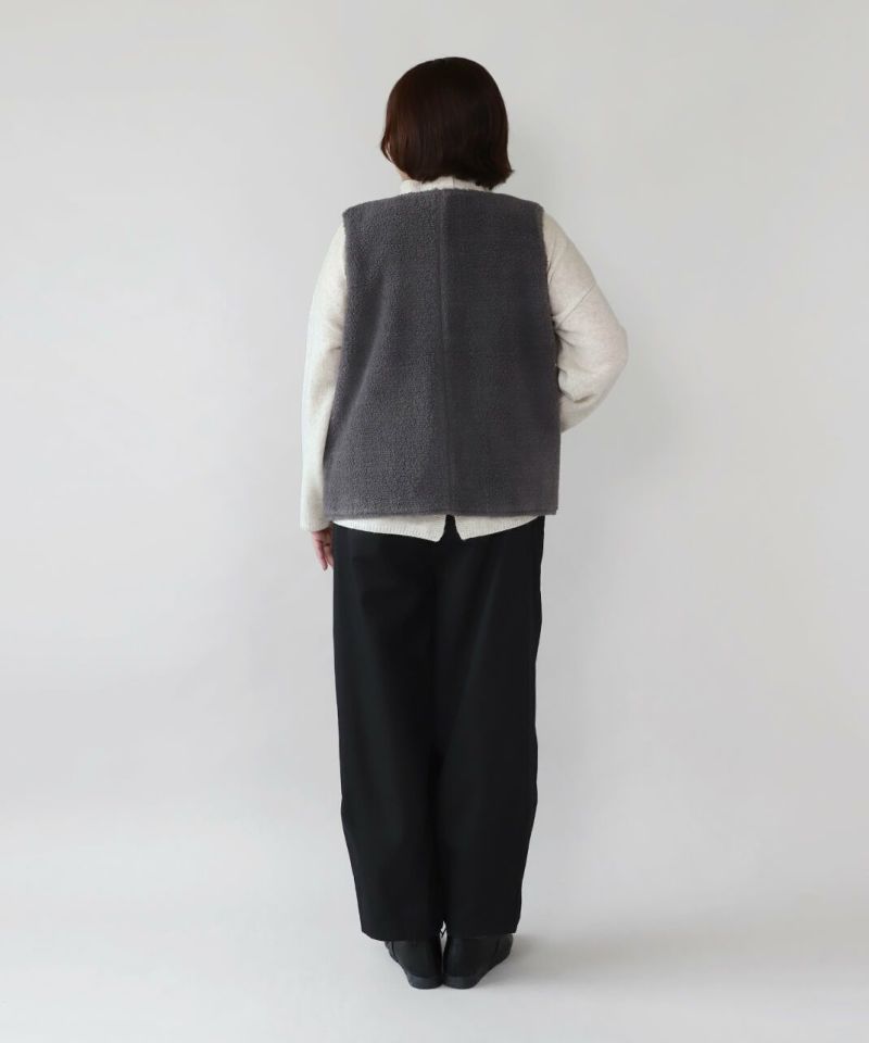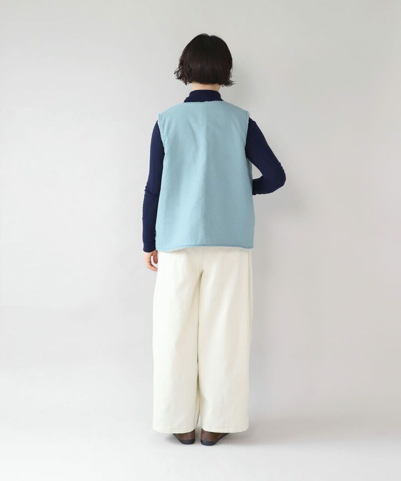 暖かいボアとコットンリネンを使用したリバーシブル2WAYベストです。 シンプルなデザインに加え、ボアとコットンリネンのそれぞれの面の表情が異なるので幅広いコーディネートを楽しめる1着です。ボタンも雰囲気に合った素材を採用。ほどよいボリューム感と軽いのに着膨れしないのも嬉しいポイントです。 アウターとしても、コートのインナーとしても活躍してくれ、ちょっと肌寒い室内でも活躍してくれる万能アイテムです。