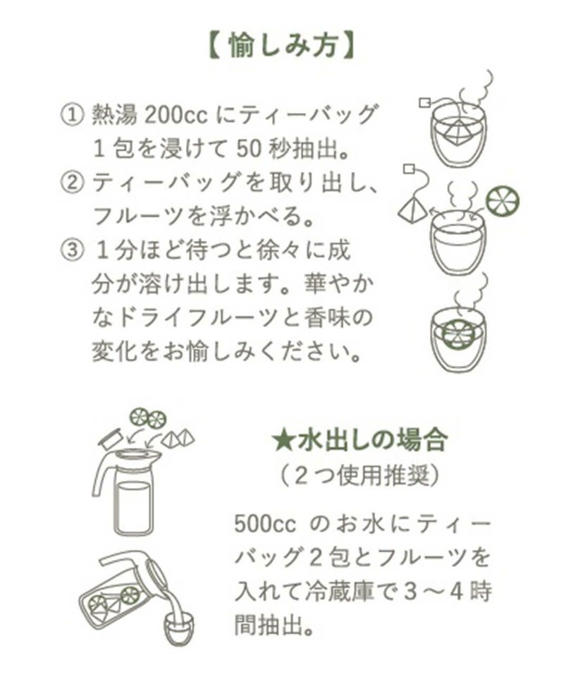 保存料・砂糖・香料不使用の「天然自然な味わい」にこだわりました。 ティーバッグとドライフルーツを入れるだけ、HOTでもICEでも愉しめます。 サイダーやジュース、ジンやウイスキーなどのお酒で割っても◎
