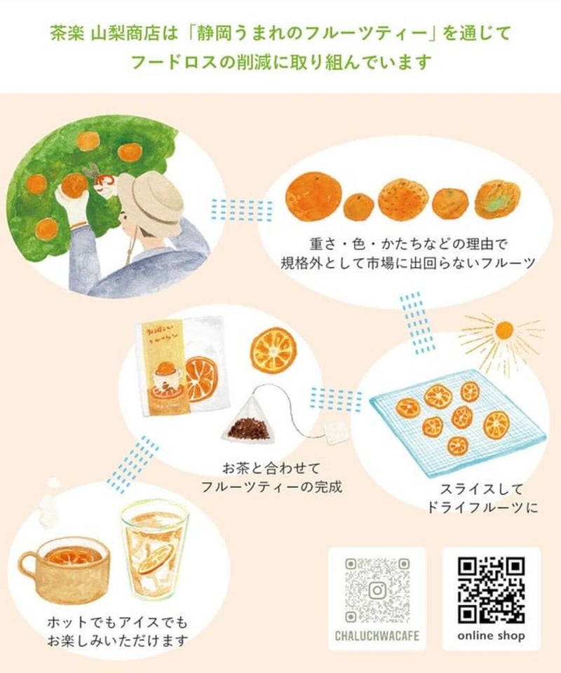 規格外品として撥ねられてしまうフルーツを使用した、サステナブルなお茶です。