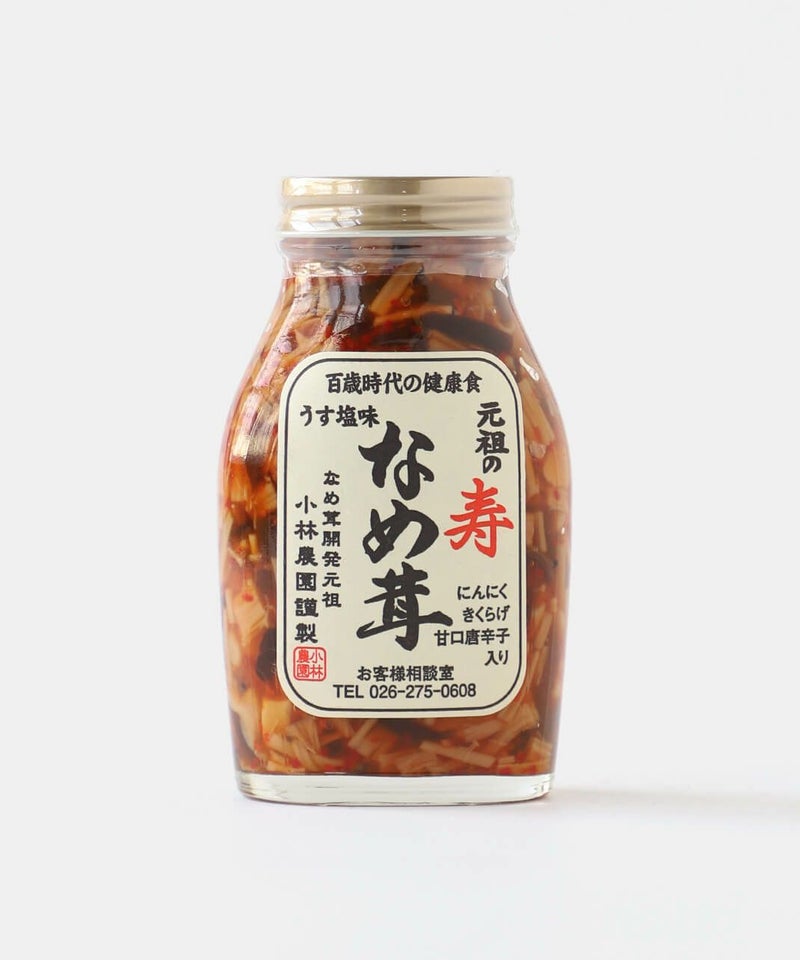 元祖の寿なめ茸:榎茸(信州)、本醸造醤油(大豆・小麦を含む)、きび粗糖、干にんにく、干きくらげ、干唐辛子、玄米黒酢、素だし(煮干・さば節・かつお節)、本みりん、食塩