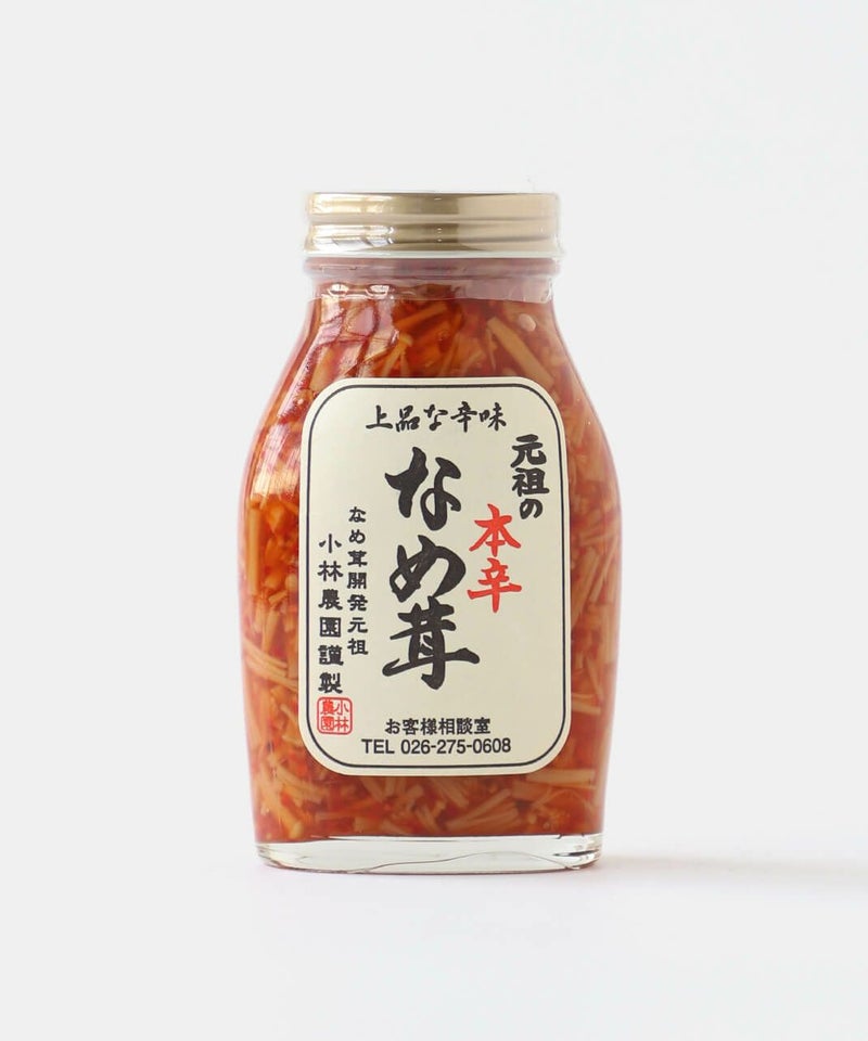 元祖の本辛なめ茸:えのき茸(長野産)、本醸造醤油(大豆・小麦を含む)、麦芽水飴、本みりん、唐辛子、昆布だし、酵母エキス、玄米黒酢、食塩