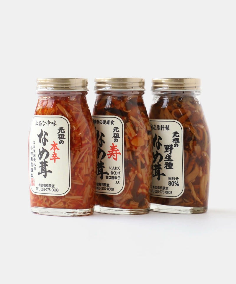 元祖の野生種なめ茸:野生種榎茸(長野県)、本醸造醤油(大豆・小麦を含む)、麦芽水飴、本みりん、昆布だし、酵母エキス、玄米黒酢、食塩
