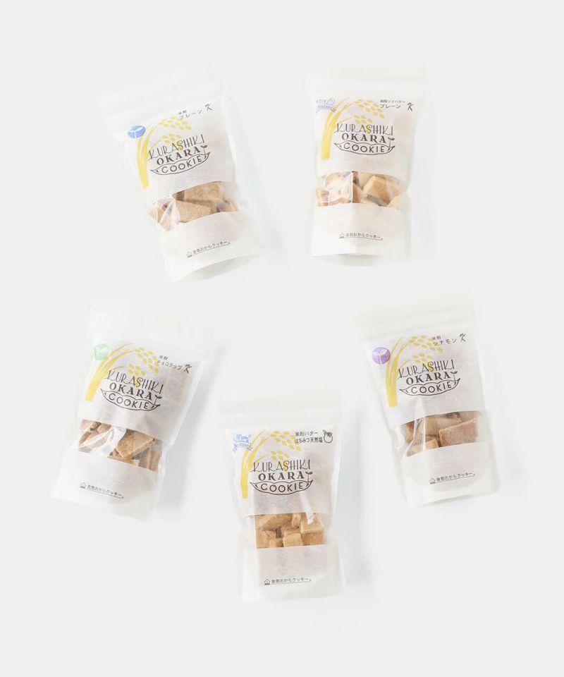 小麦粉を使わず、岡山県産の米粉を使用したグルテンフリーのクッキーです。毎朝お豆腐屋さんで採れる100%国産大豆の新鮮な生おからを使用しています。生おからならではの優しい味わいとサクサクとした食感が特徴です。