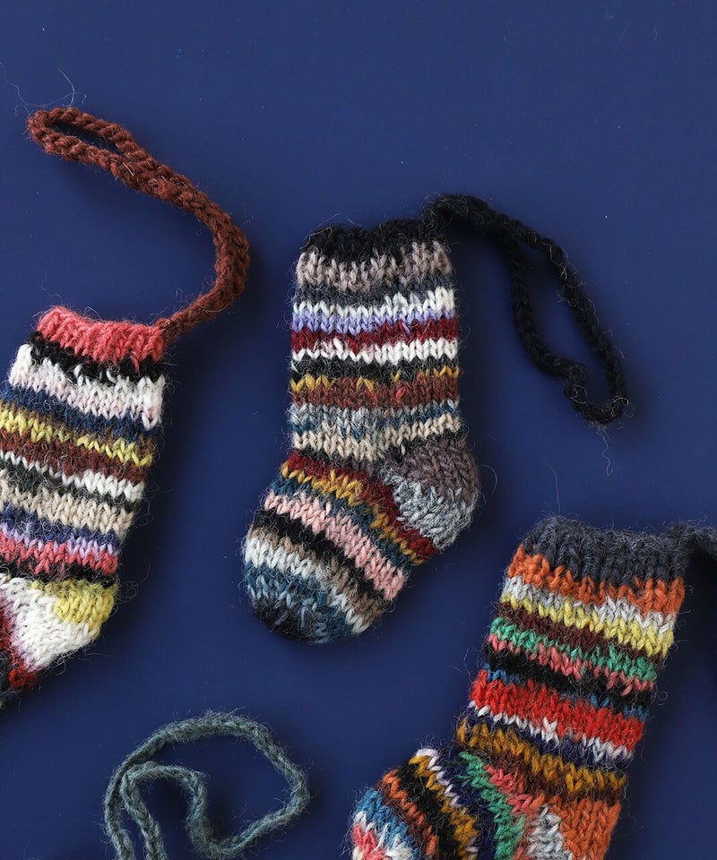 色とりどりの毛糸で手編みしたミニサイズのソックスは、見ているだけで心が弾むかわいらしさです。 ネパールの生産者パートナーがセーターなどを作ったときに余った毛糸(リサイクルウール)を利用して作っています。 ツリーのオーナメントやギフトのラッピングに使っても。ピープルツリー定番のチョコレートを入れてプレゼントにおすすめです。