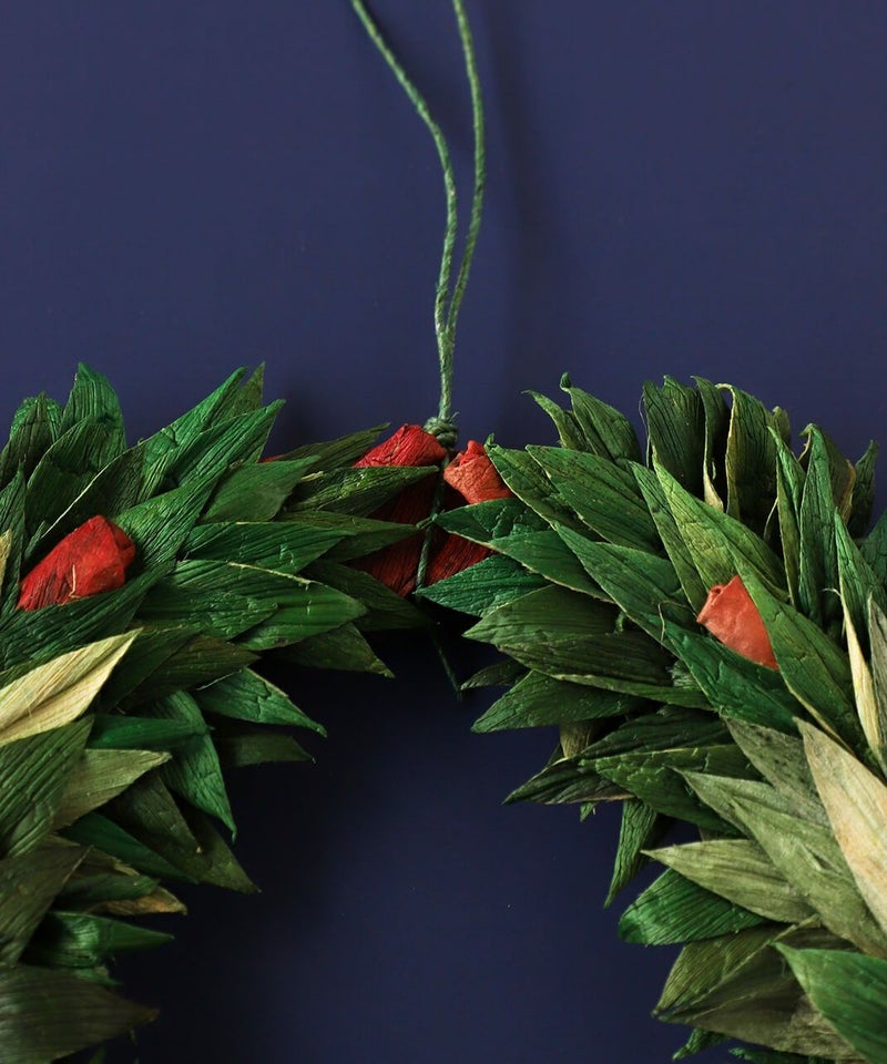 ホテイアオイの茎を染め、葉の形にカットしたものをリースにしました。 小ぶりなサイズなのでフックを使って気軽に飾れます。