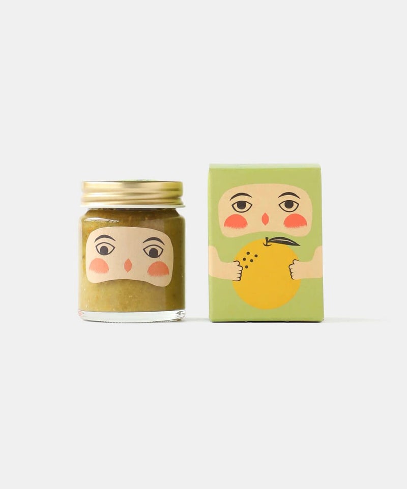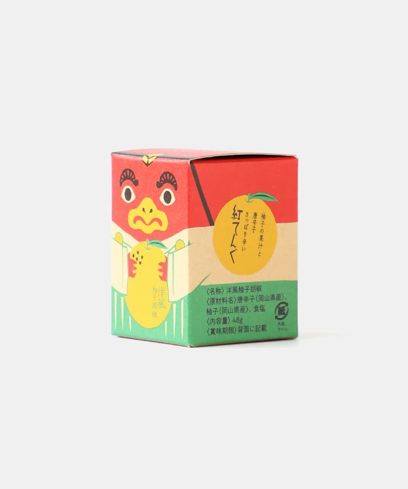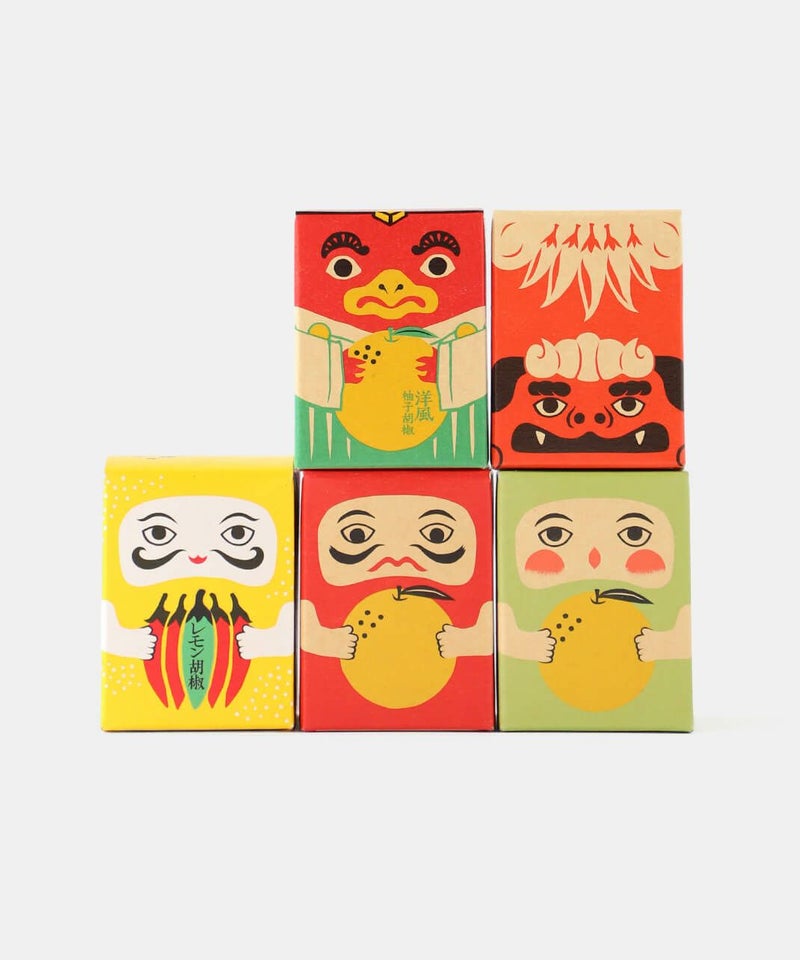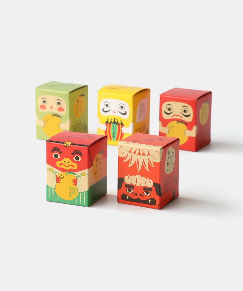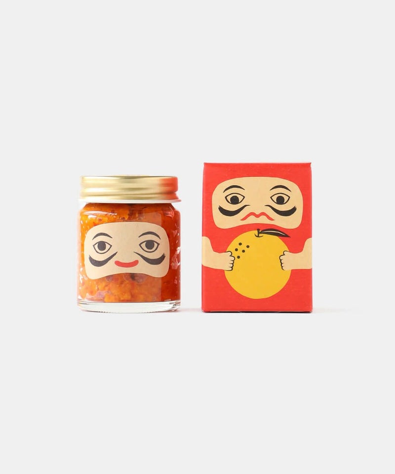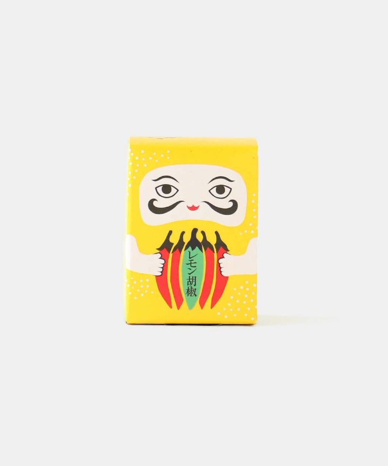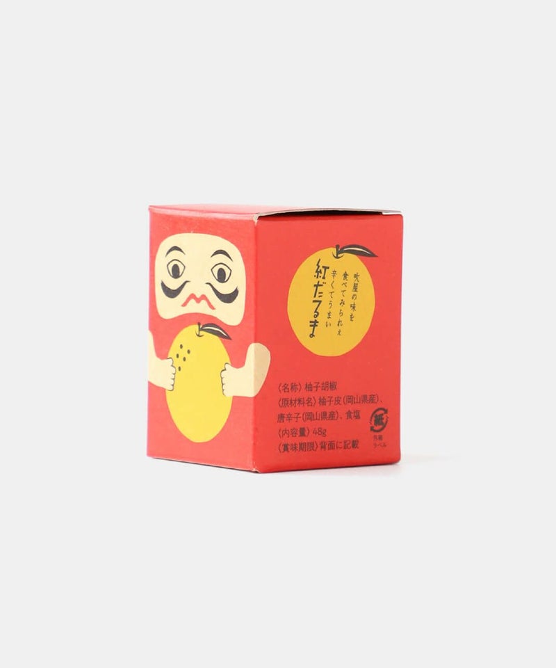 なんとも言えない愛くるしい表情のだるまの中には鮮やかな赤色の柚子胡椒が入っています。蓋をあけると広がる柚子の香り、一口食べるとピリリと辛い唐辛子。
