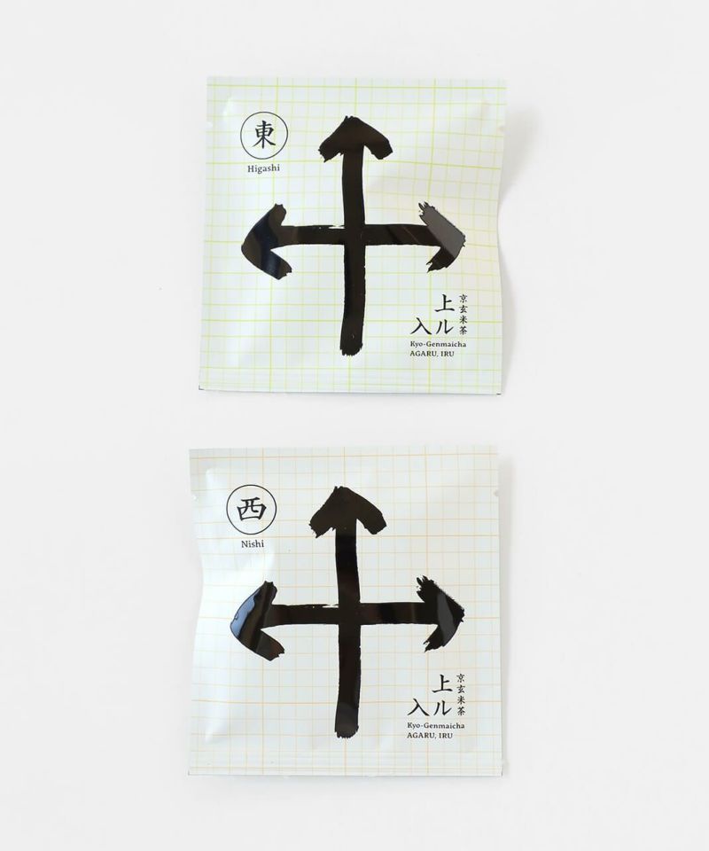 パッケージは上品で愛らしい箱入りスタイルで、「東」「西」玄米茶 2種類をセットにしました。