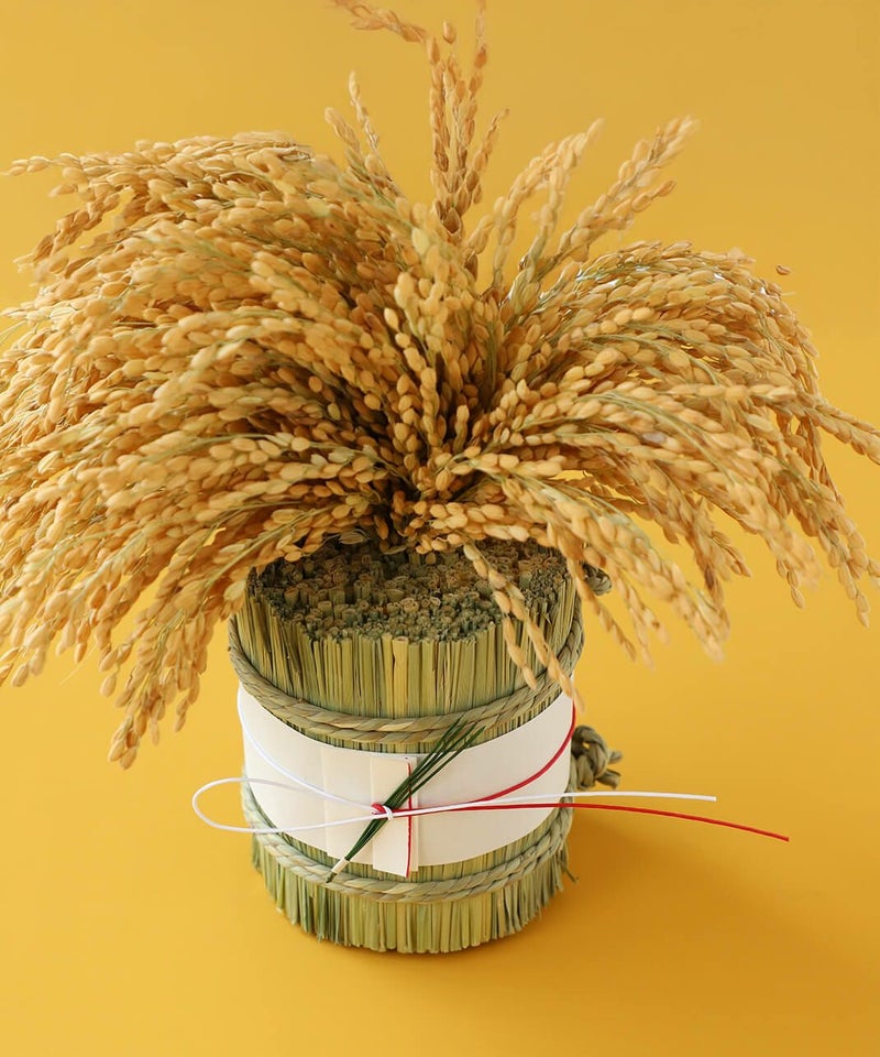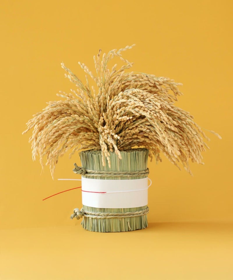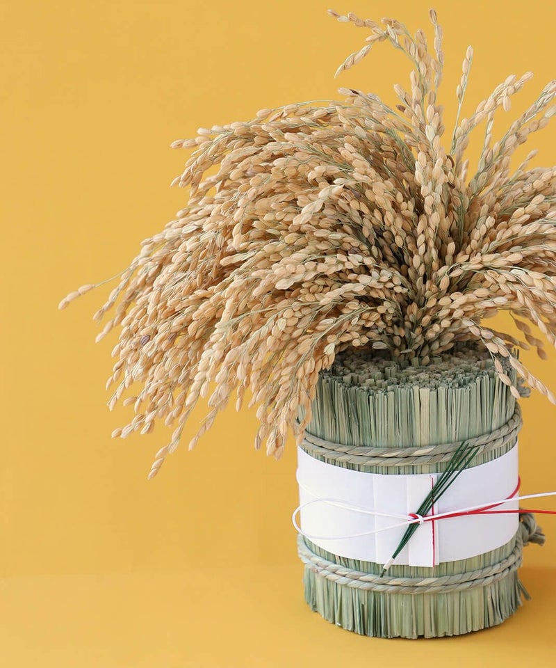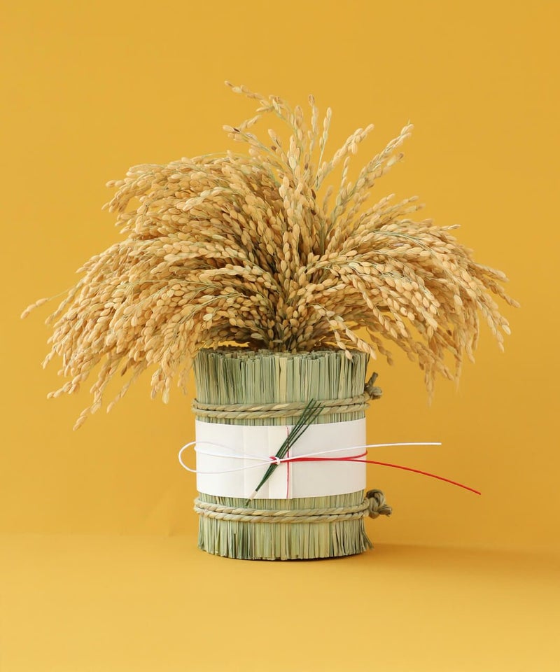 実りへの感謝と、さらなる繁栄を願った稲穂の縁起飾りです。古くから日本人にとって大切な糧である稲は神聖な存在です。 その恵みを束ねたお飾りは、心静かに暮らしの中に福を招く、祈りのかたちです。